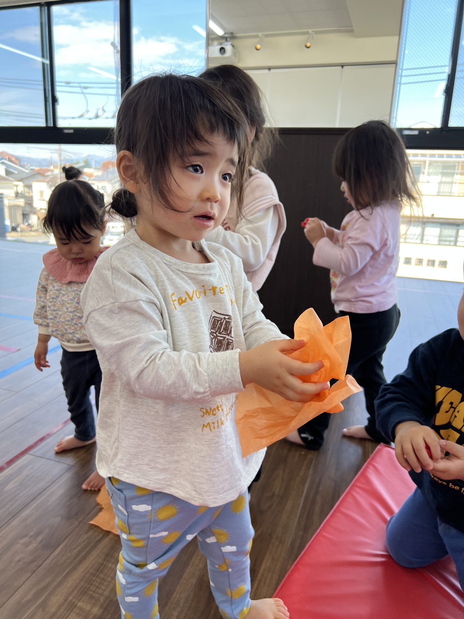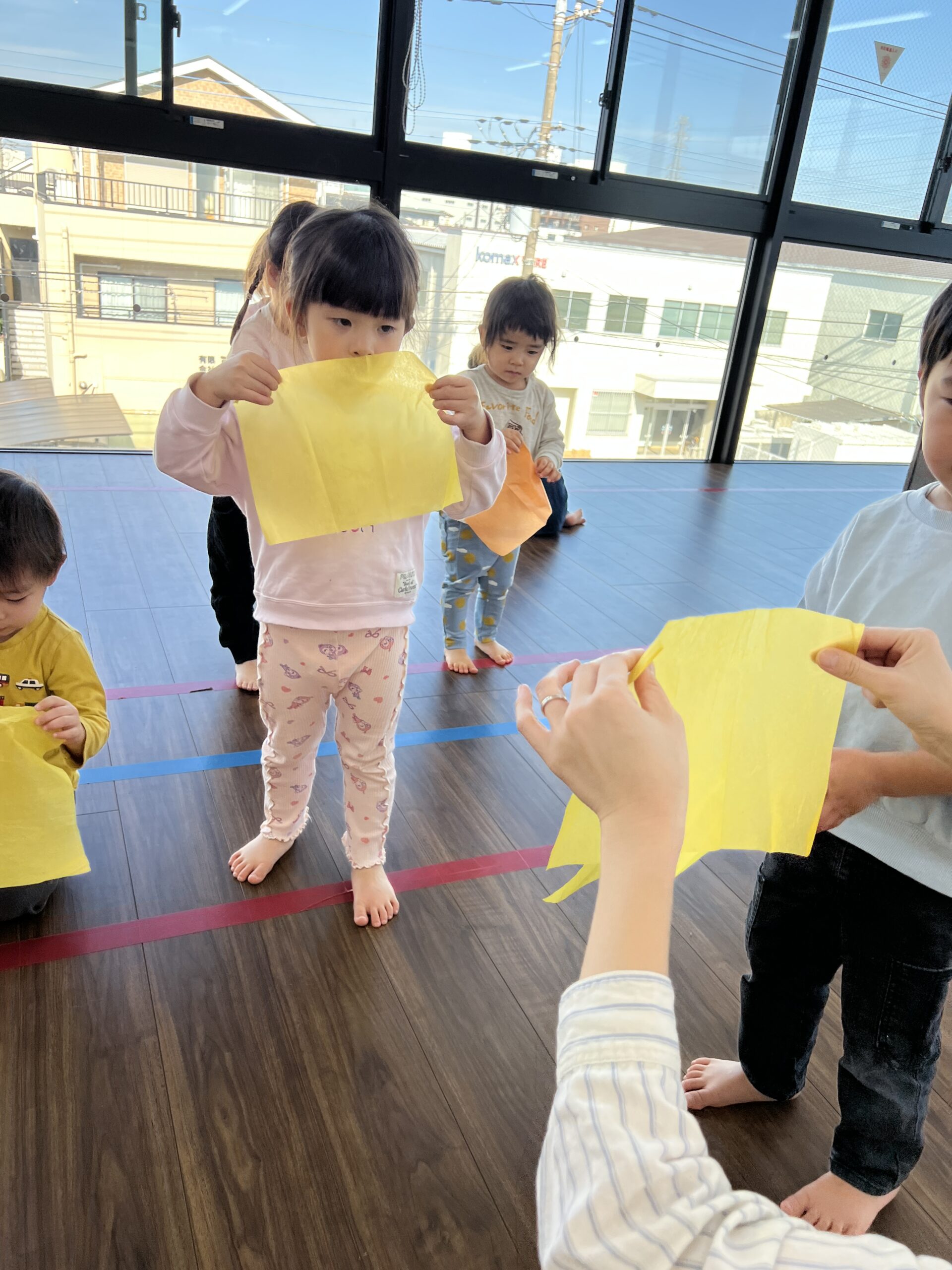 花紙を落ち葉に見立てて、秋の音を奏でていきます♪