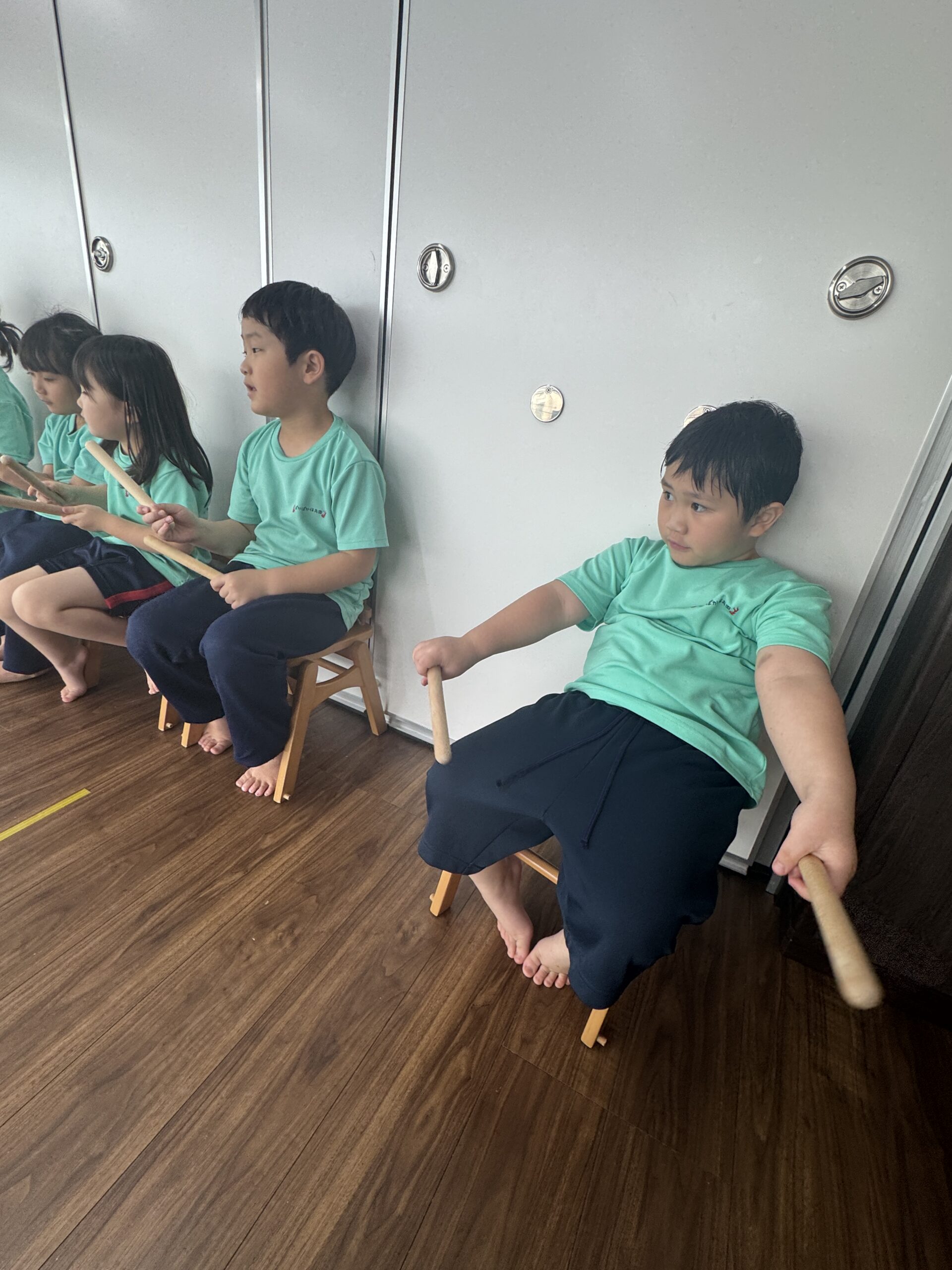 バチを持って、強い音・弱い音の違いを感じながら楽しむことができました。友だちの音をよく聞きながらタイミングを合わせる姿に、5歳児らしい集中力と協調性の育ちが感じられました。