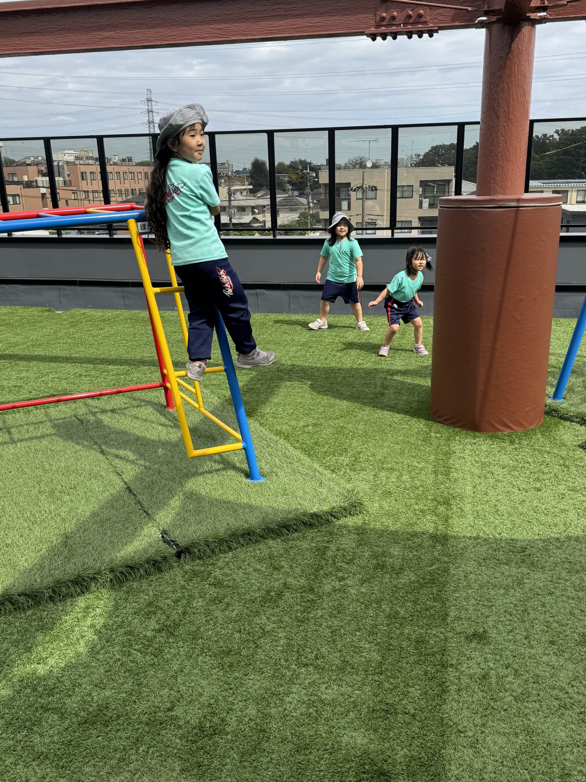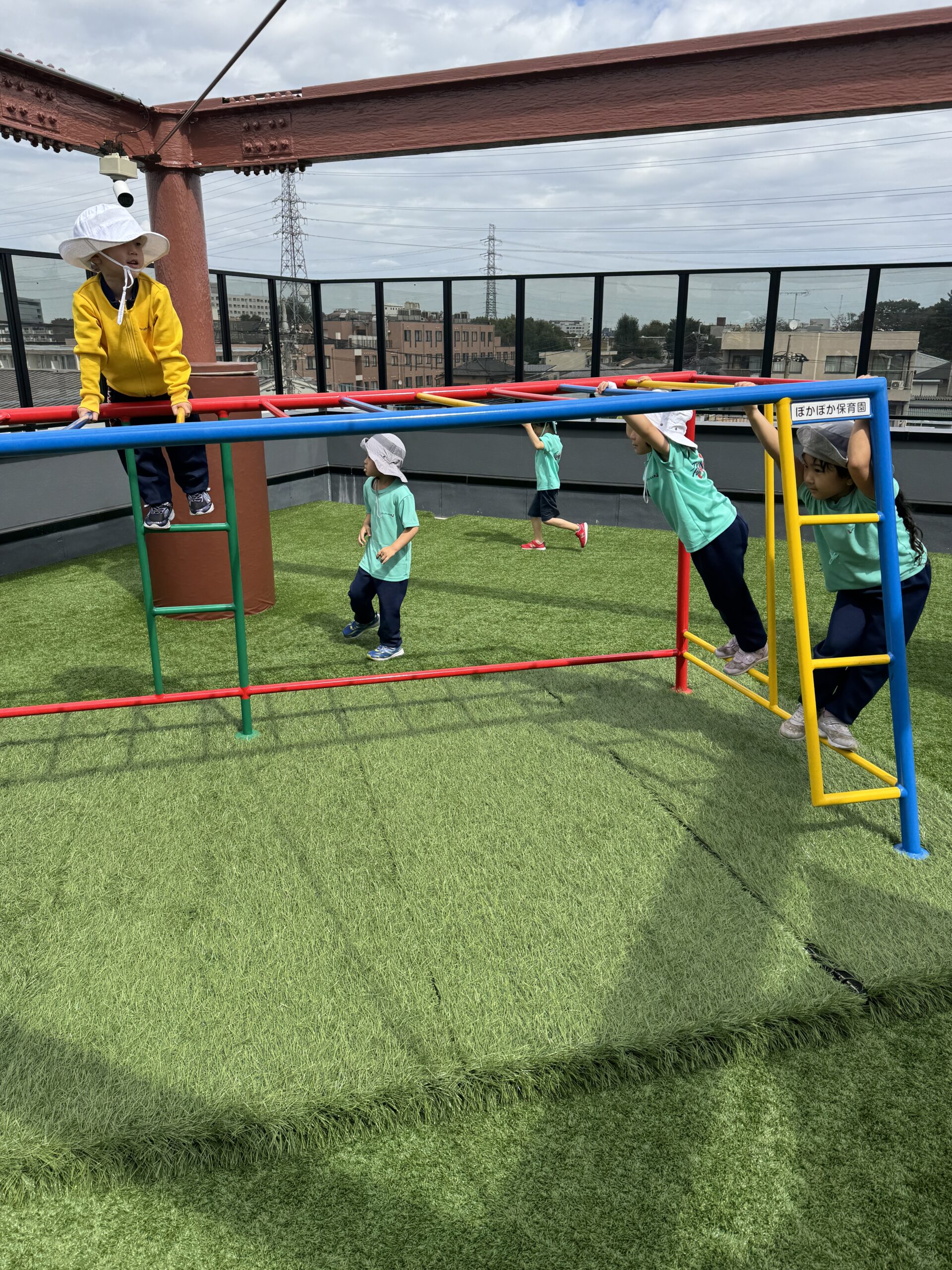 今日は気持ちのいい秋空の下、5歳児クラスのみんなで屋上に出て遊びました。