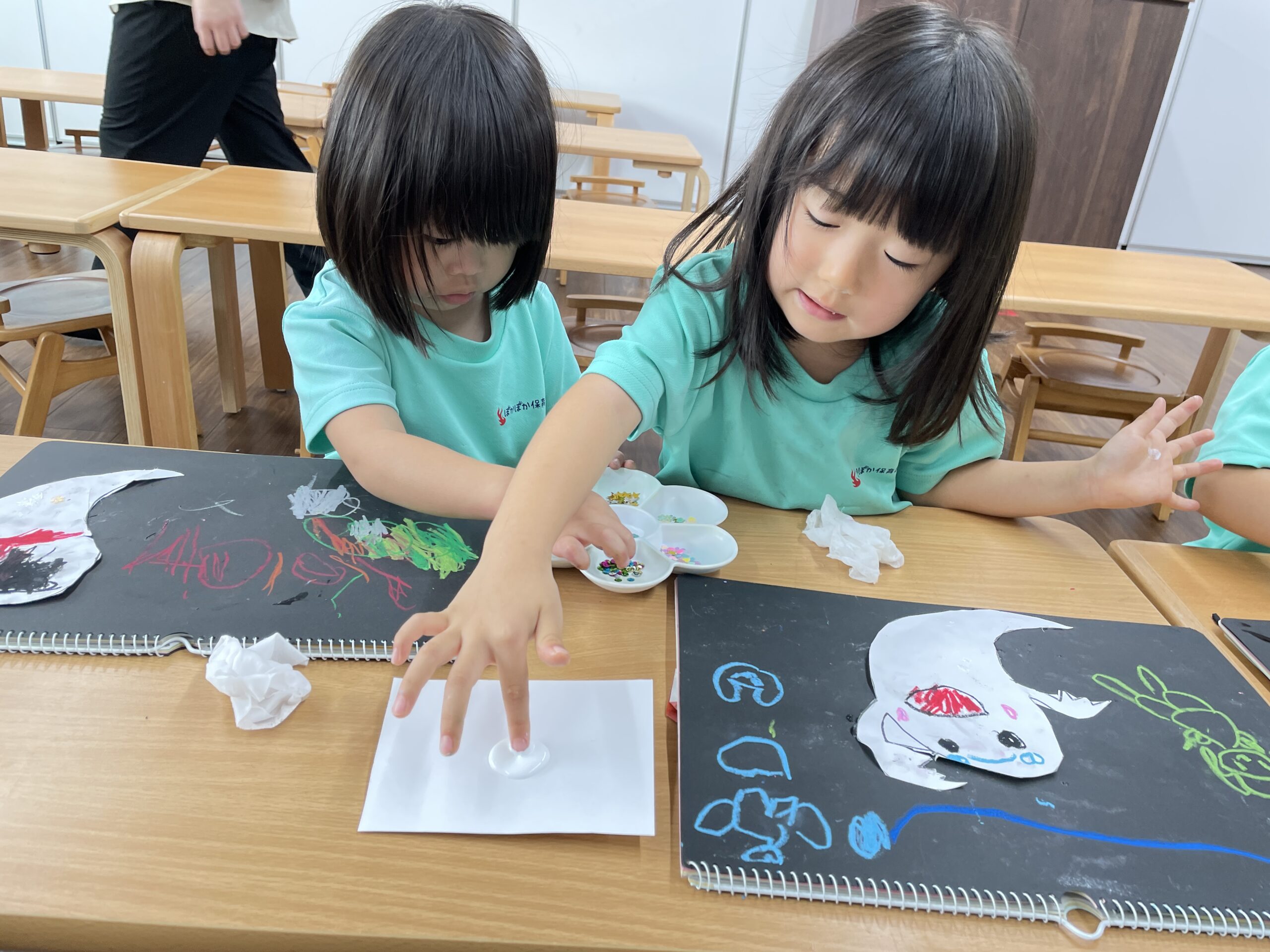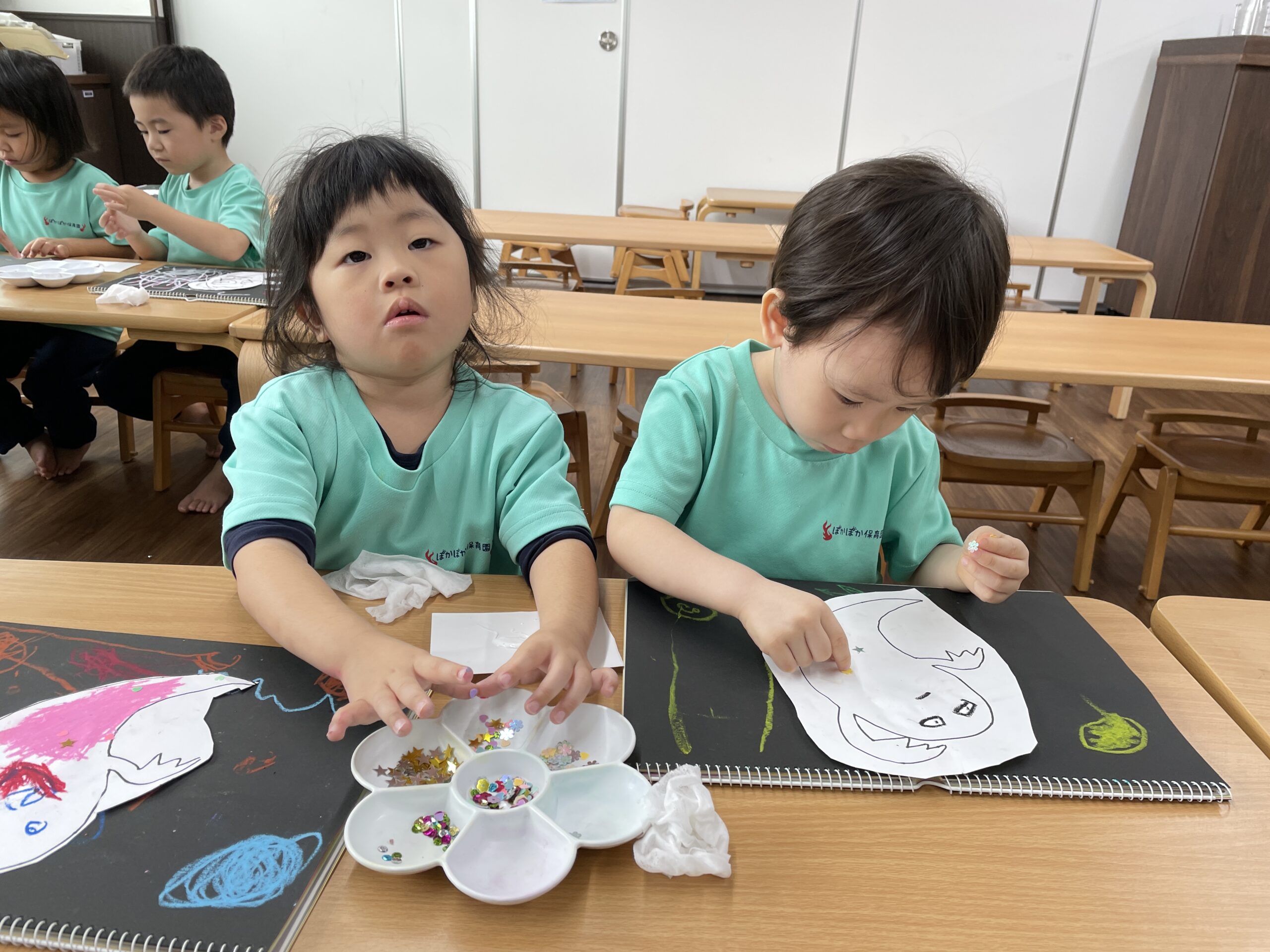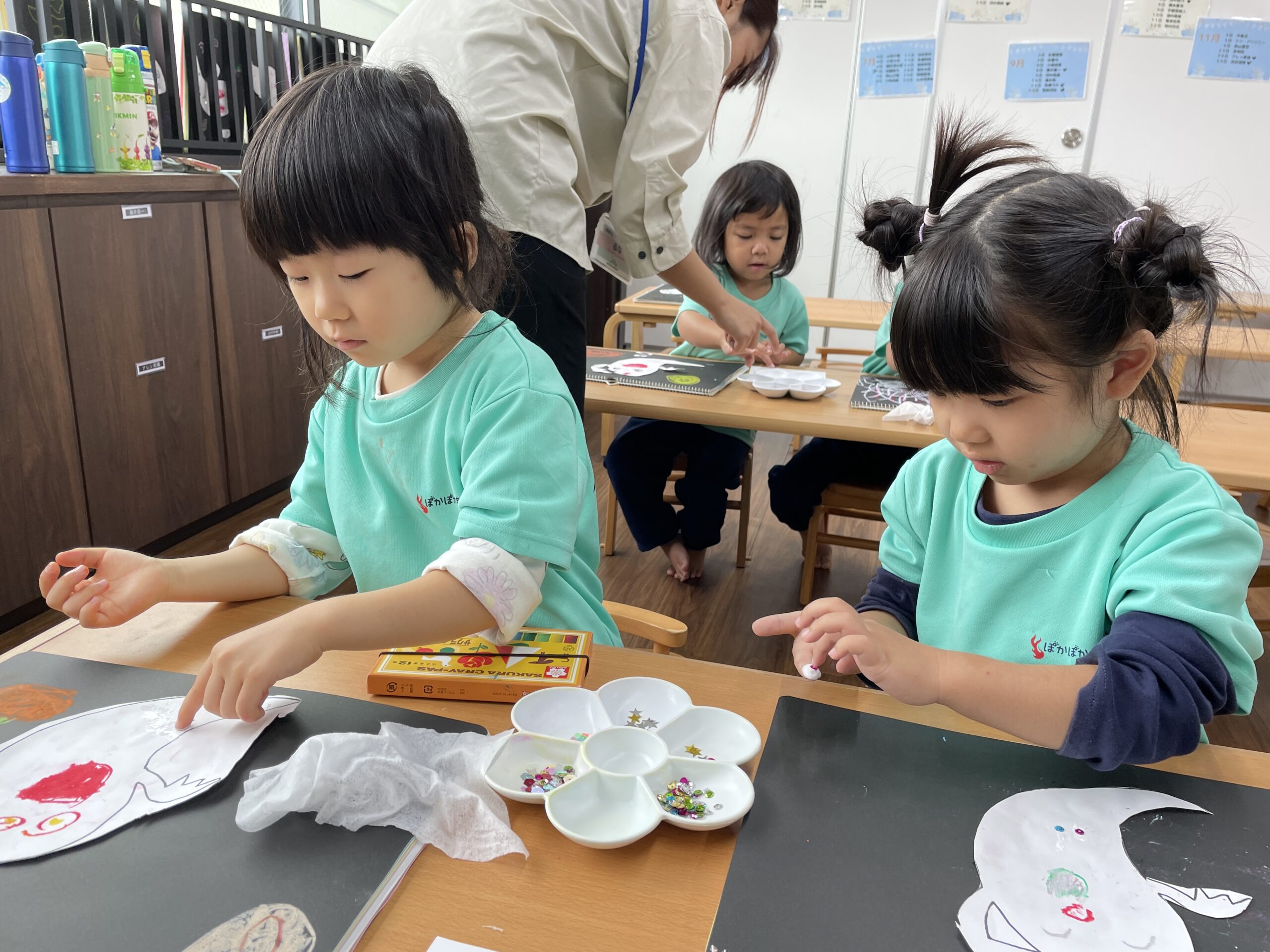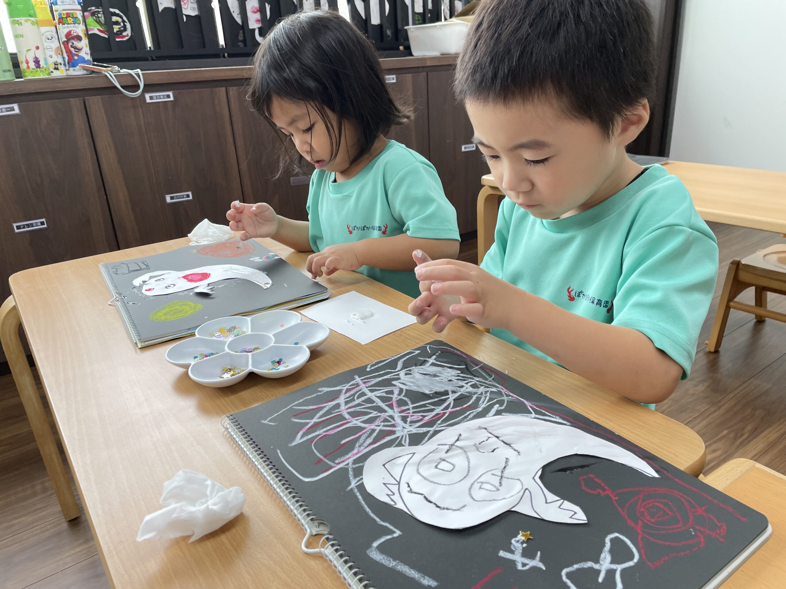 「どんなオバケにしようかなー?」と、子どもたちは思い思いにペンを走らせます。
