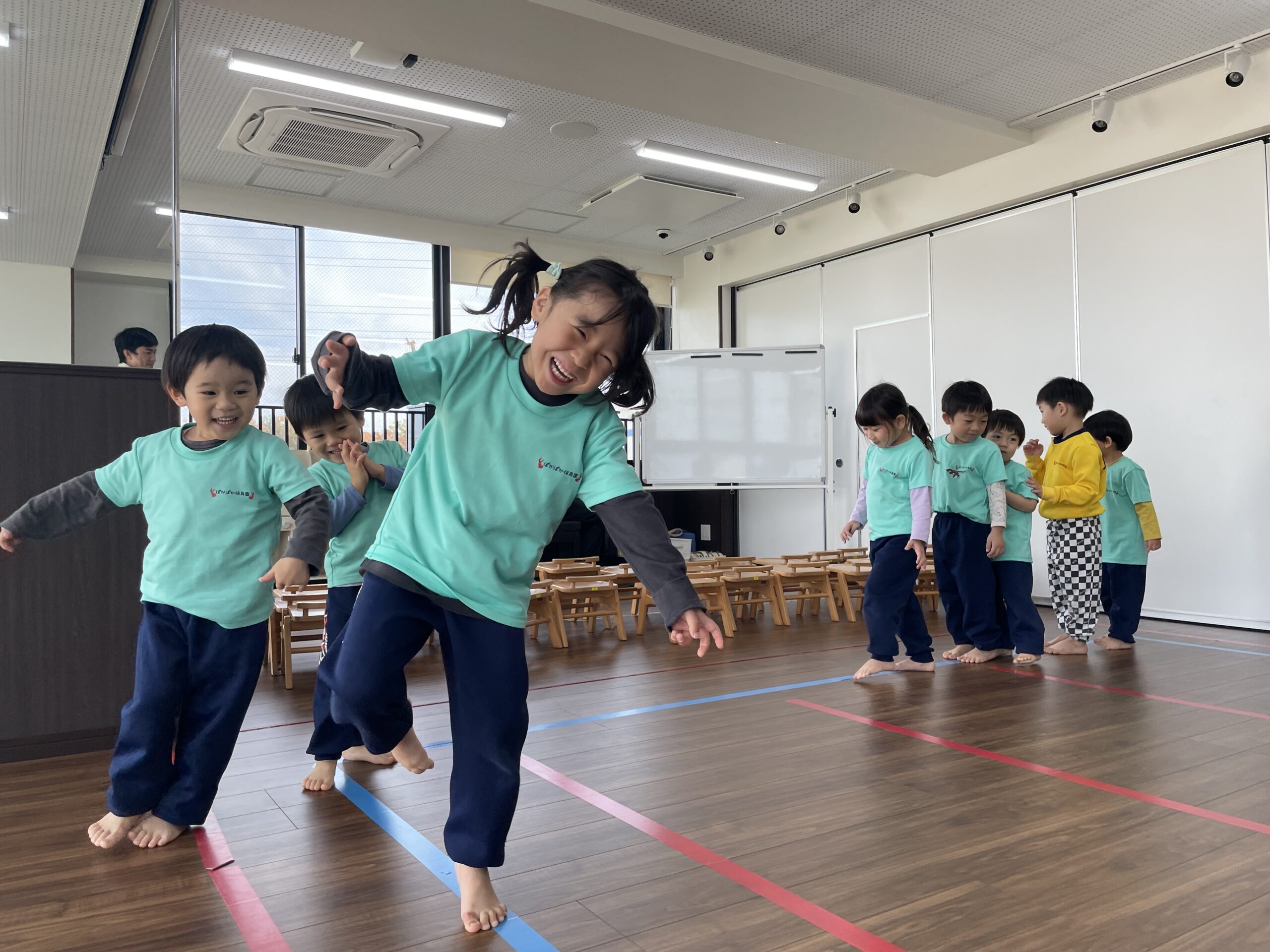 ダンスの時間。前半と後半に分かれて、それぞれ好きな曲に合わせて体を動かしました。今、子どもたちの中で人気なのは“しなこ”の曲や“TikTok”で流れるリズム。音楽が流れた途端に「きたー!」と大盛り上がり!手を広げたり、ジャンプしたり、友達と顔を見合わせながら笑顔いっぱいで踊る子どもたちの姿は、本当に楽しそうでした。