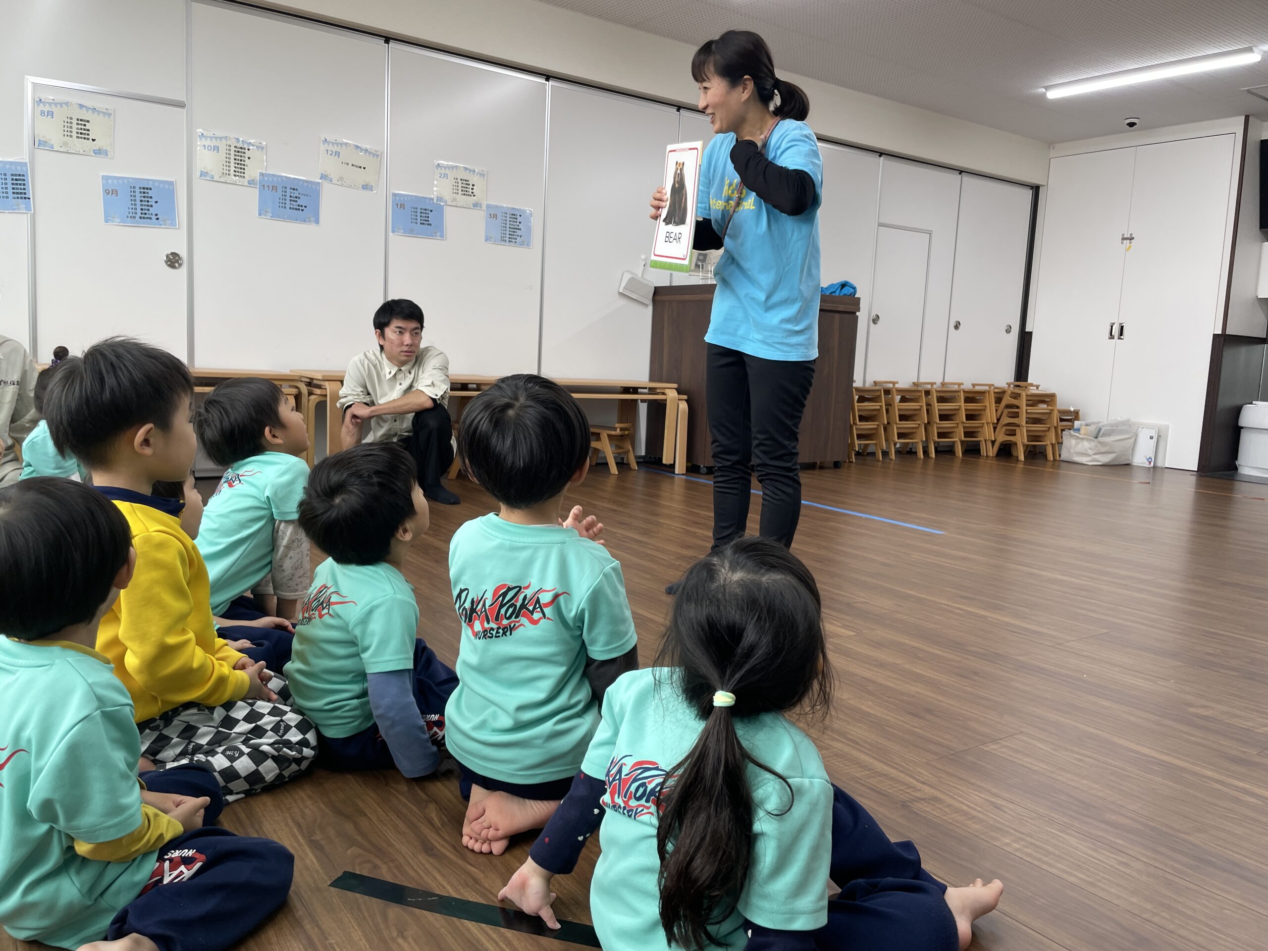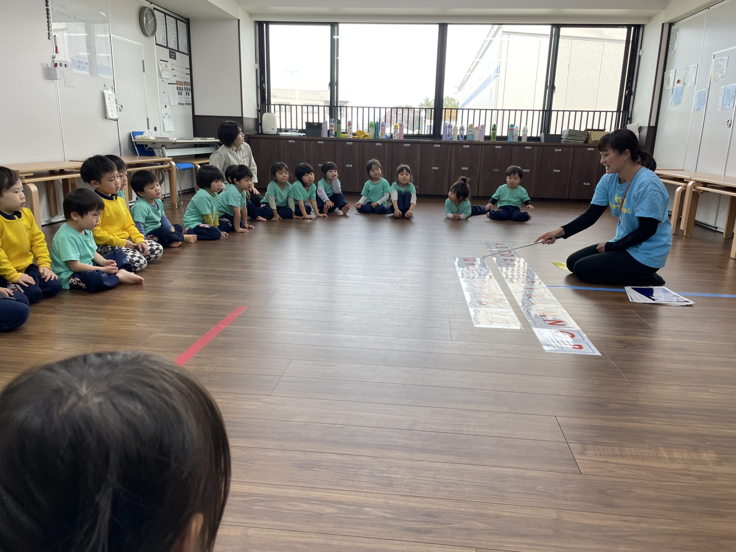 音楽の後は英語の時間。もうすぐクリスマスということで、テーマは「サンタさん」。先生が「Let’s be Santa Claus!(サンタさんになってみよう!)」と言うと、「Ho Ho Ho〜!」と元気な声が響きます。袋を担ぐ真似をしたり、「Present for you!」とプレゼントを渡す真似をしたり、みんなノリノリ。英語の発音をまねして楽しむ姿もあり、遊びの中で自然と英語に親しむことができていました。
