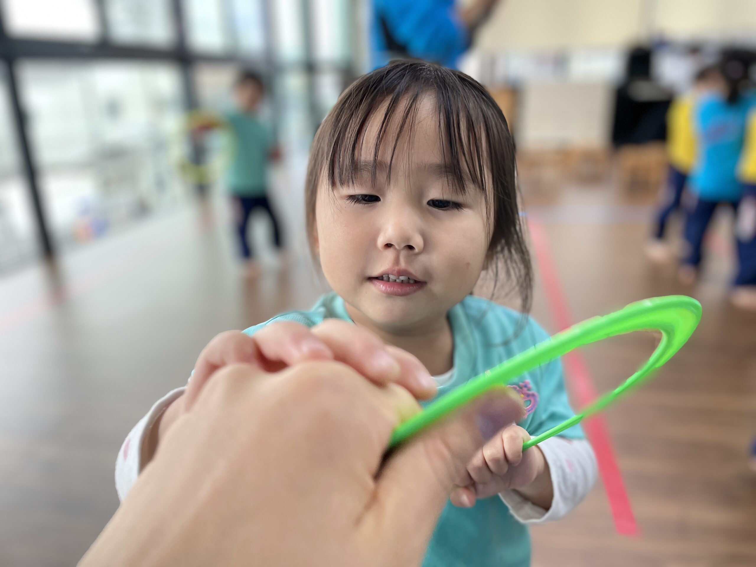 今日はインフルエンザやご家庭の都合でお休みの子が多く、3歳児の登園は半分ほどでした。少ない人数ではあったけれど、子どもは「今日はちょっと静かだね」「でもいっぱい遊べる?」と前向きで、いつもよりゆったりした雰囲気の中で一日がスタートしました。