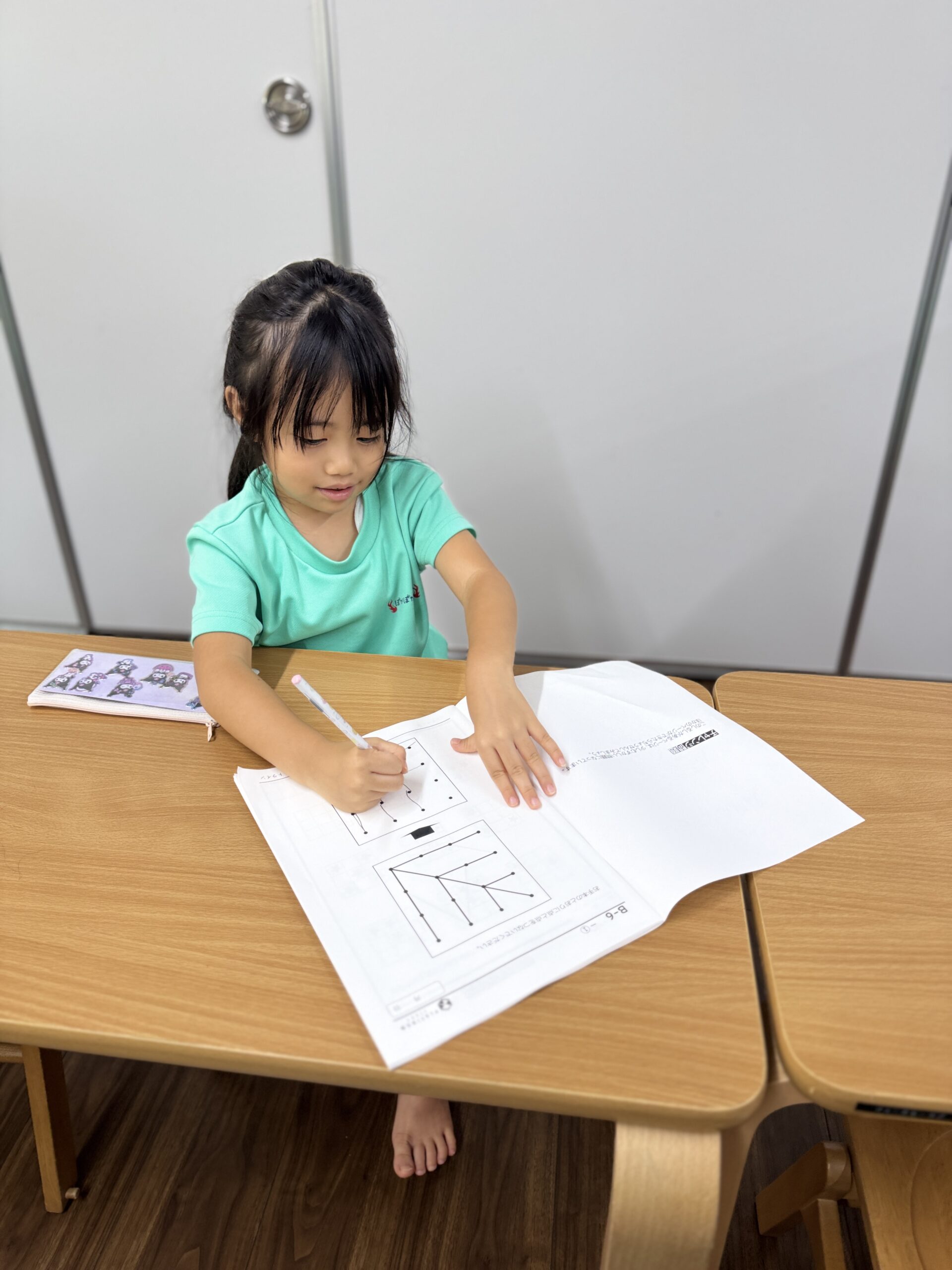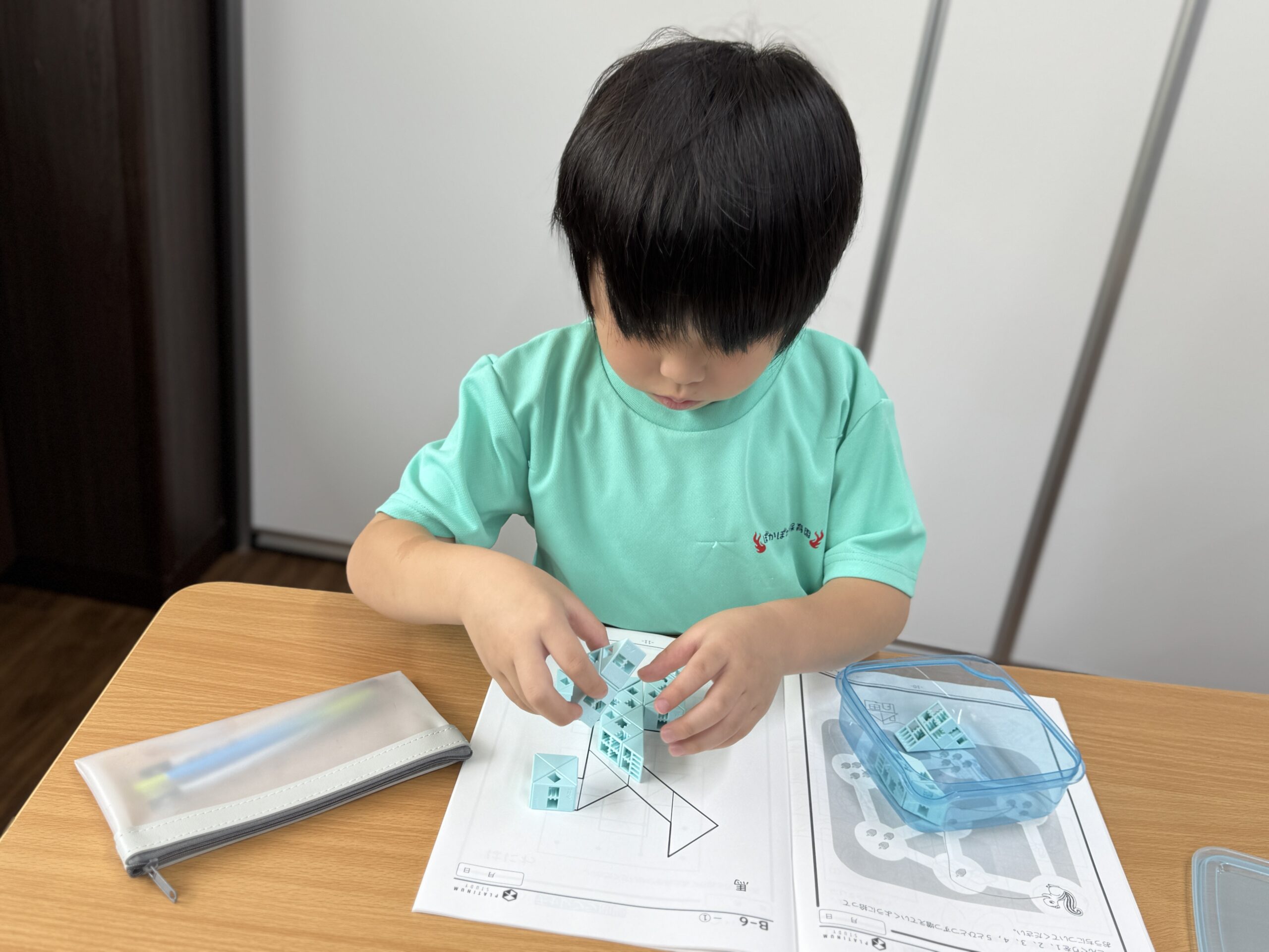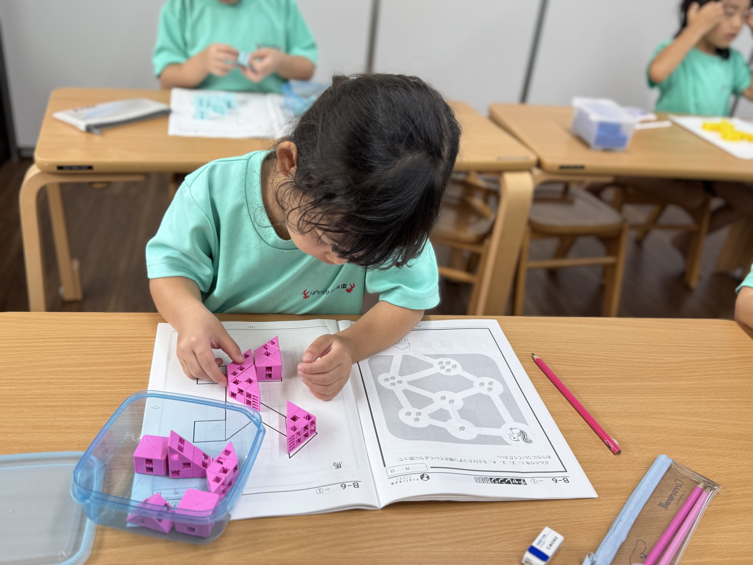 次はプラチナム算数の時間です。今日はブロックを使ったシルエット当てはめに挑戦しました。