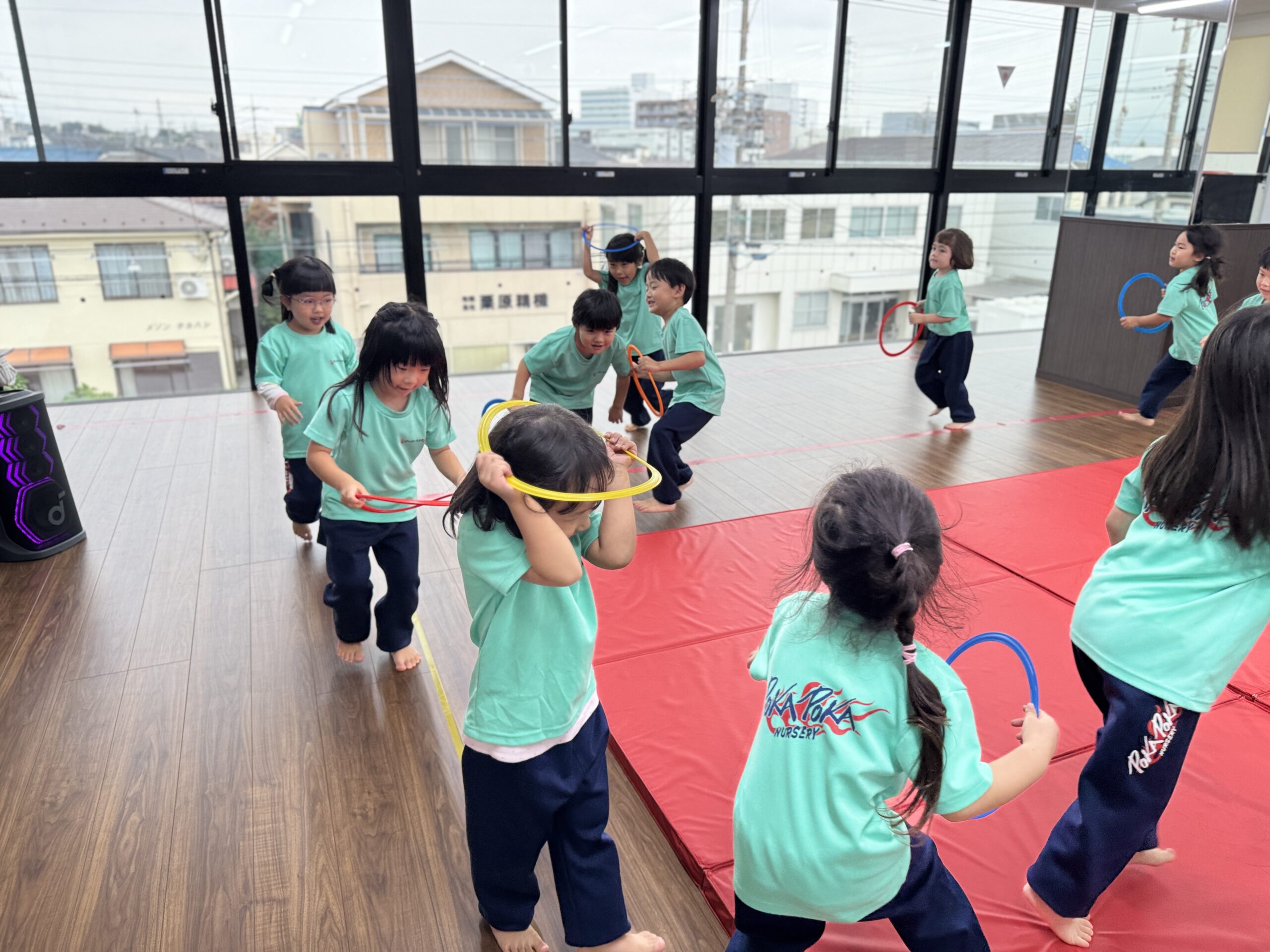 先生が鈴が付いているロープを音楽が鳴っている間に回し、止まったところのお友だちはスキップで一周します!みんなやりたくて盛り上がりました♬