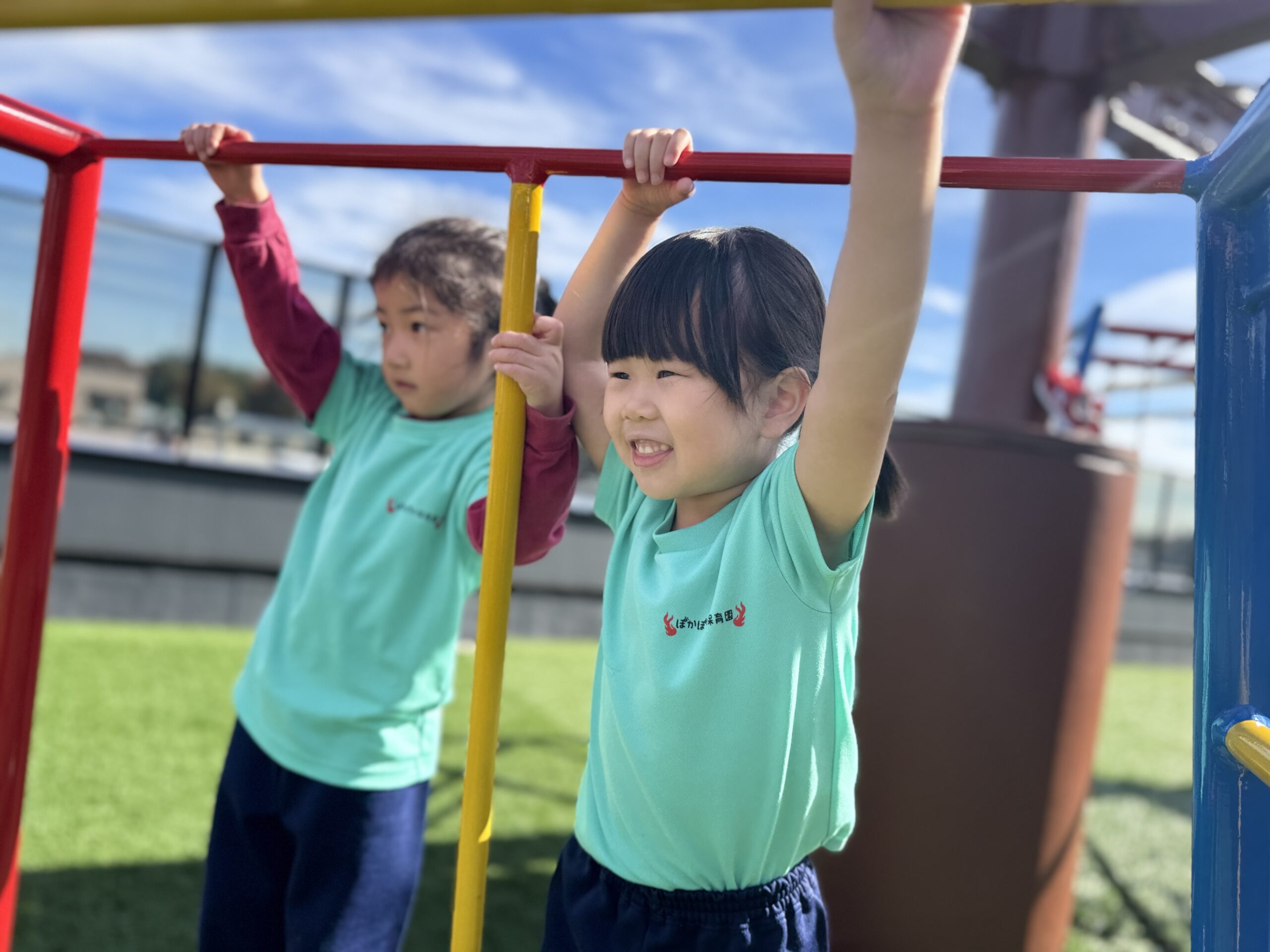 ぽかぽかと心地よい秋の日差しの中、安田式遊具の雲梯(うんてい)や吊り輪で元気に体を動かしました💪