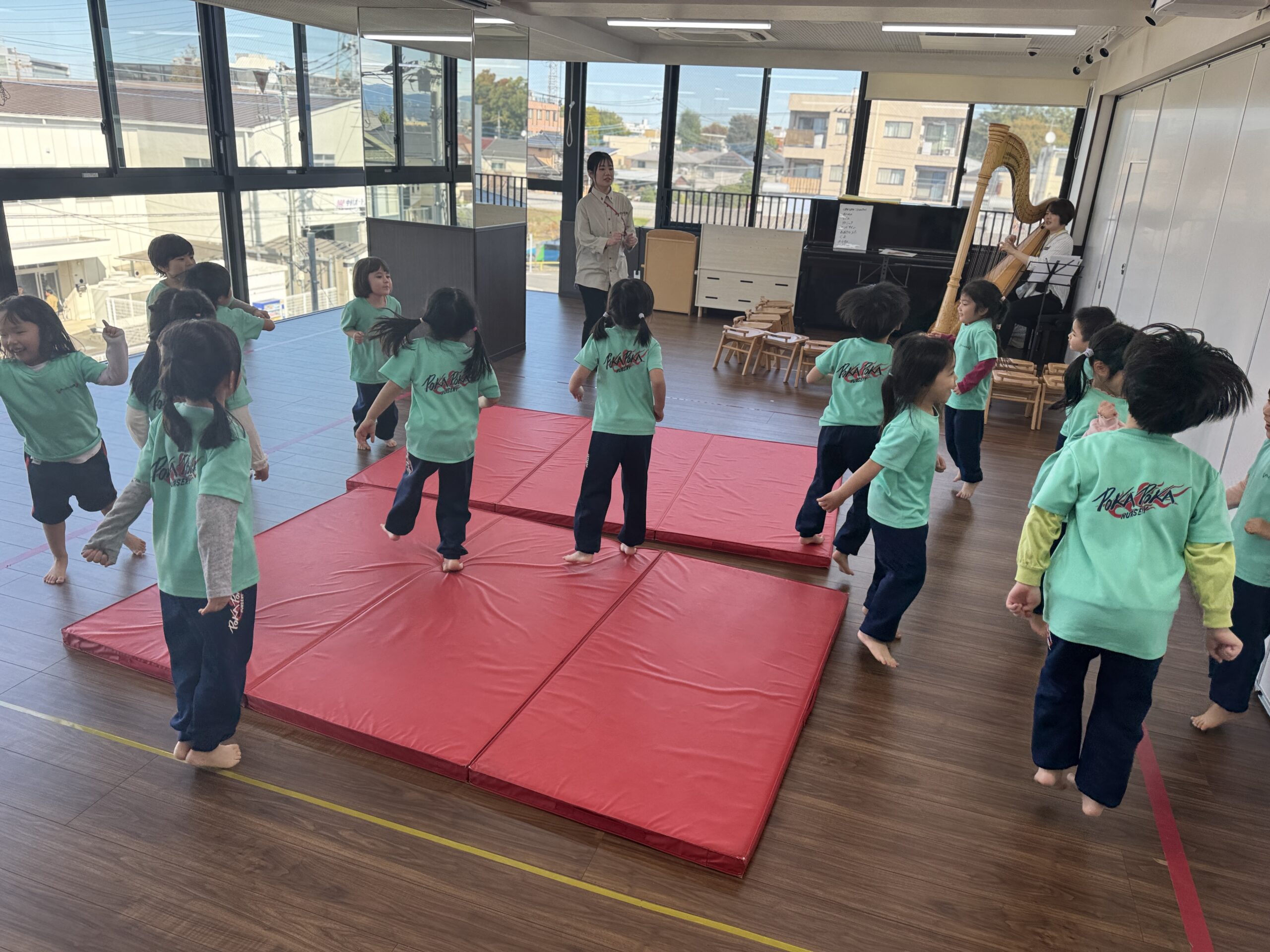屋上で元気いっぱい遊び、お部屋でダンスを楽しみ、ホールで音楽を感じて…