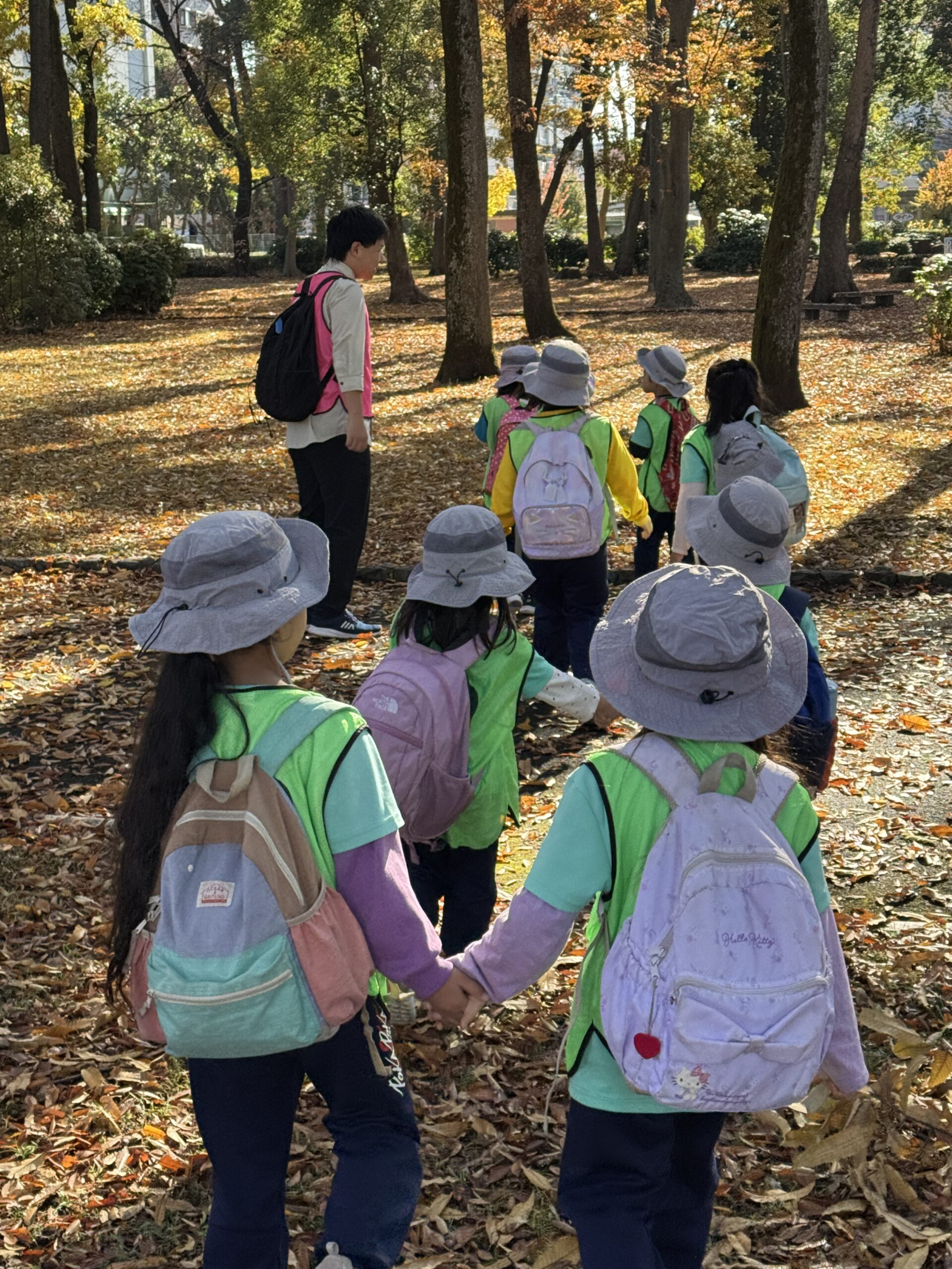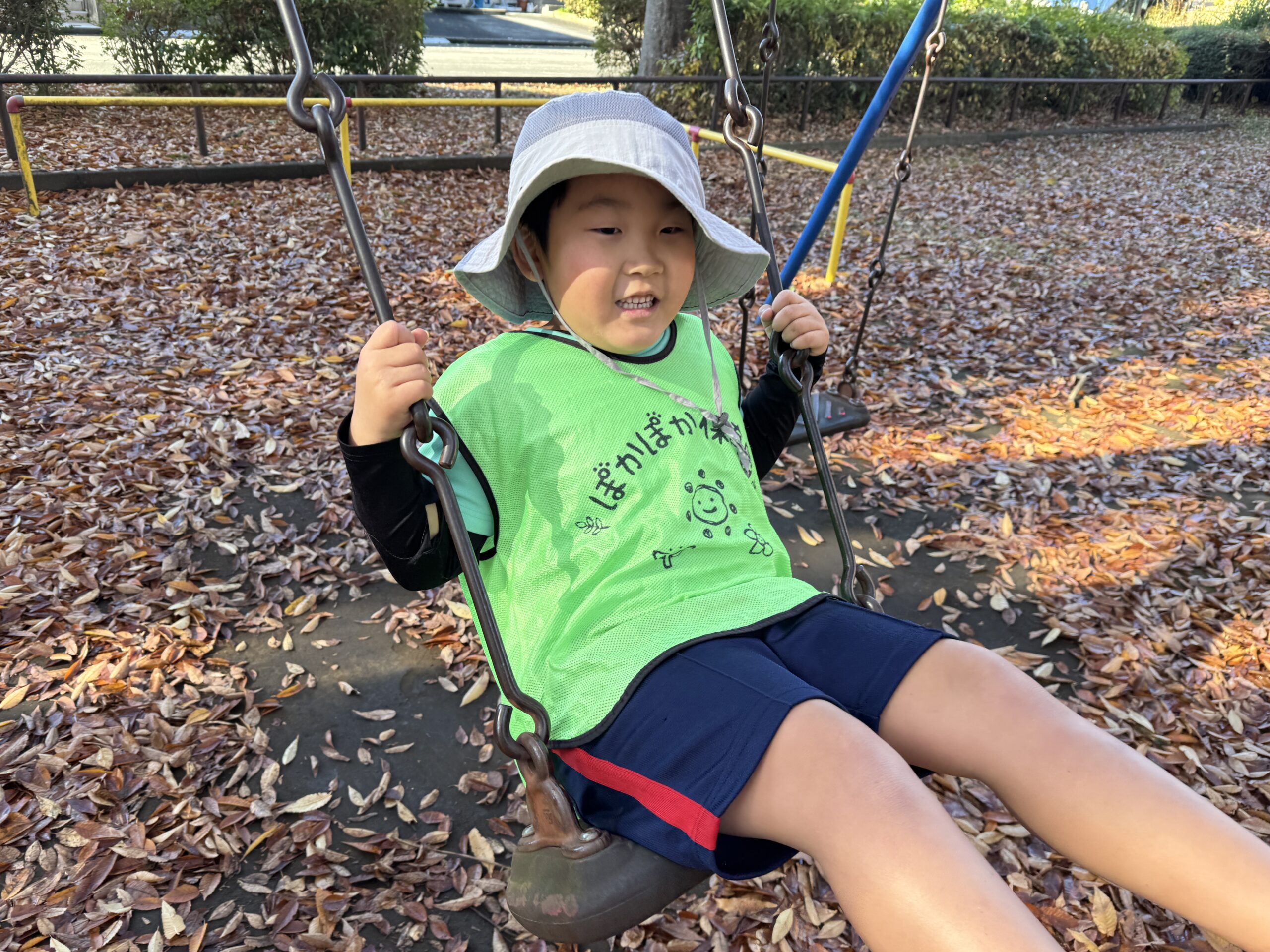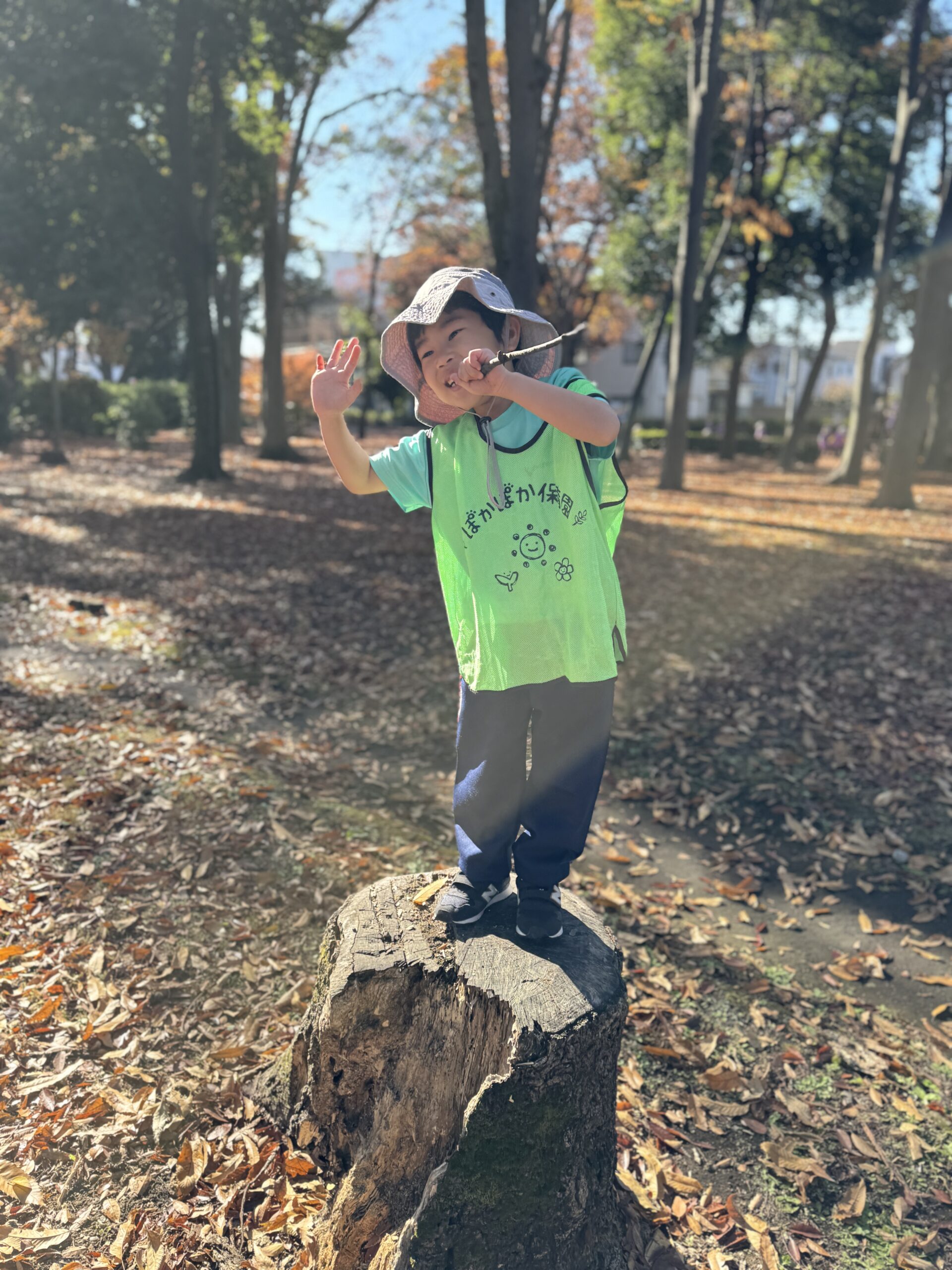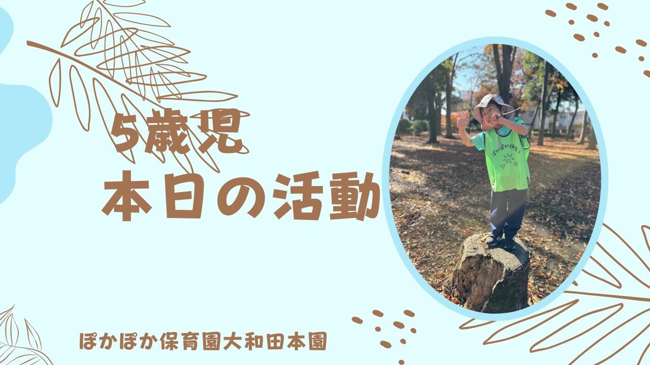本日は、年長クラスさん落ち葉がたくさんある公園に行って、みんなで身体を動かして元気に過ごしていました!