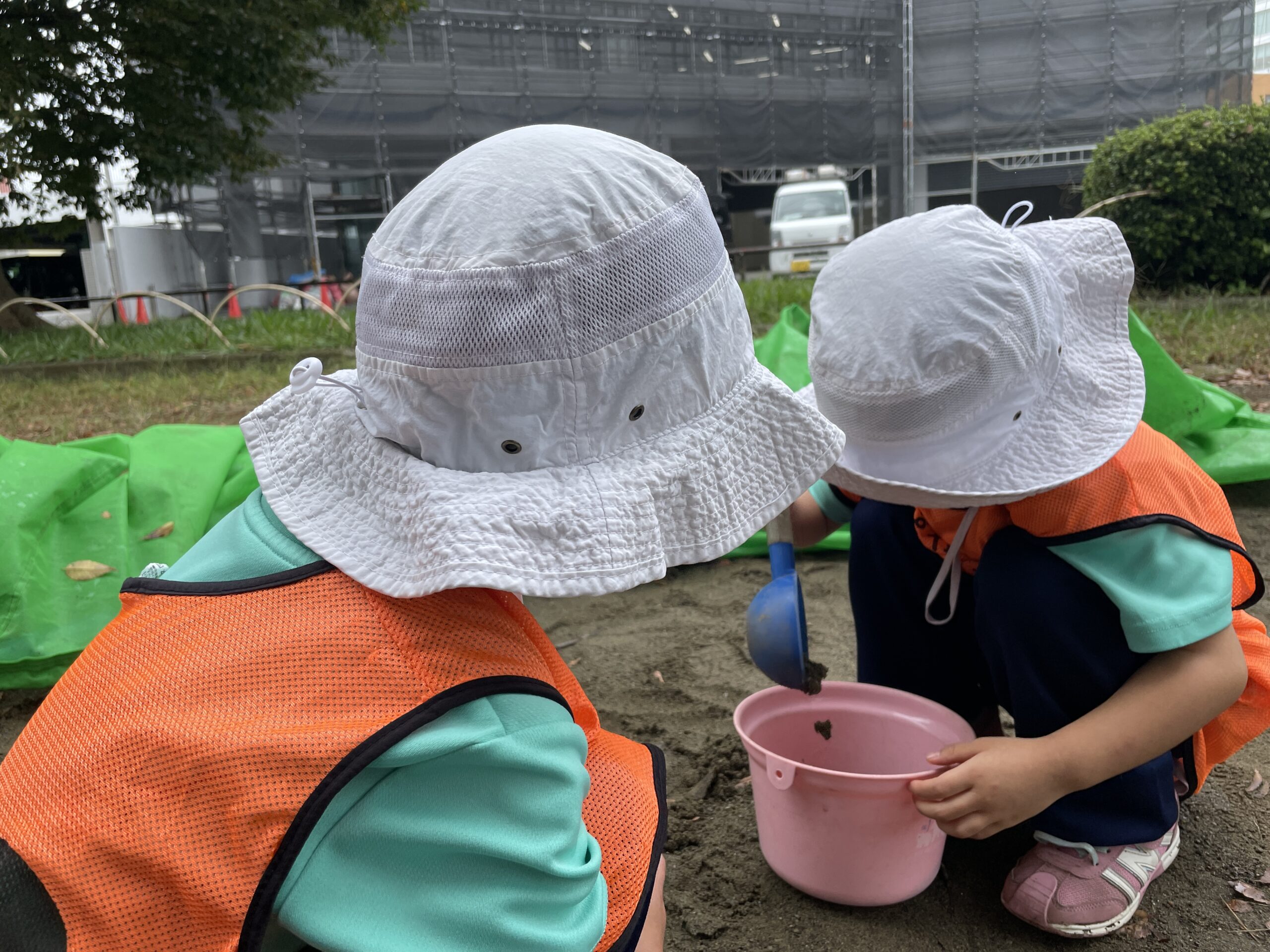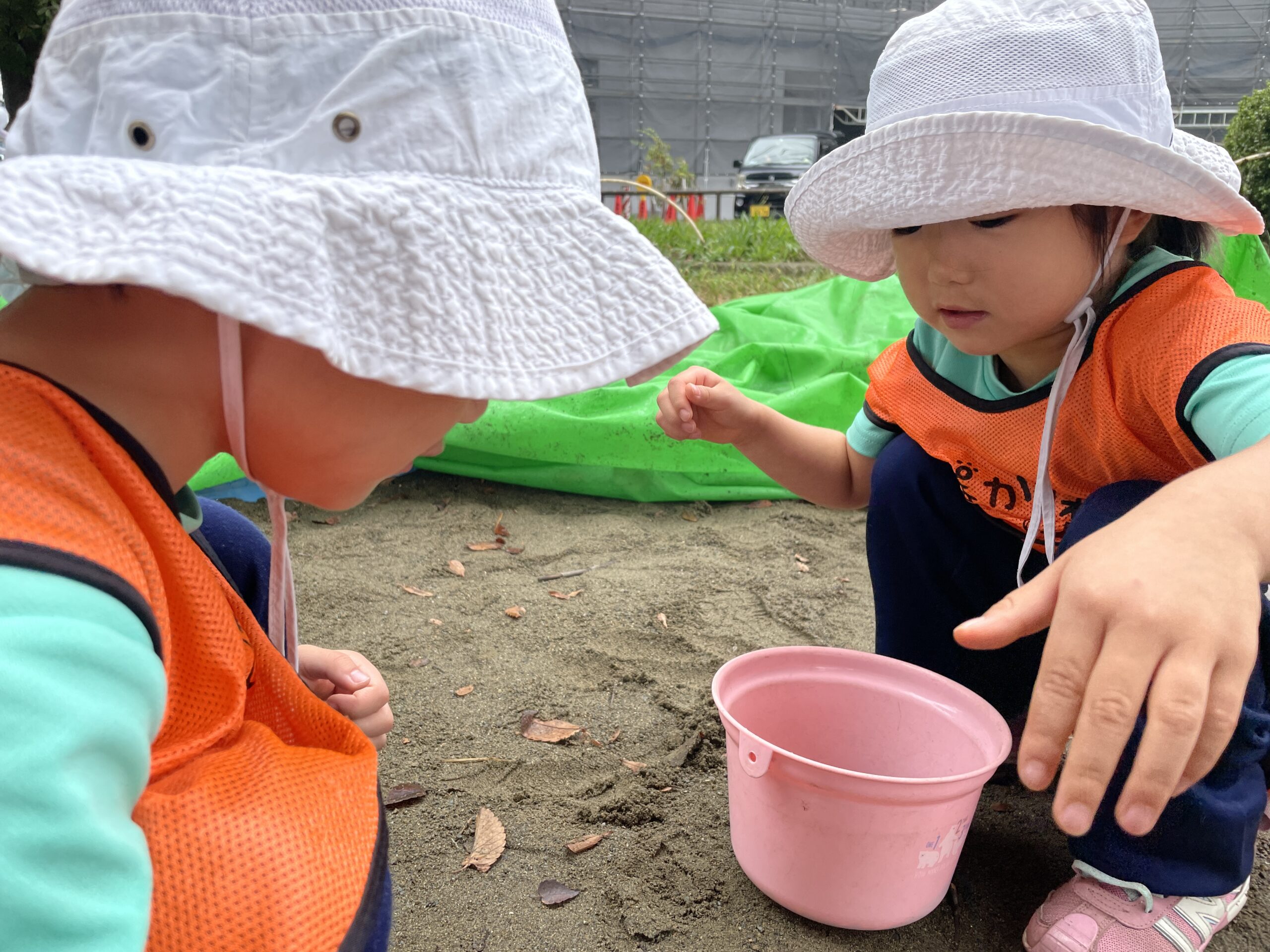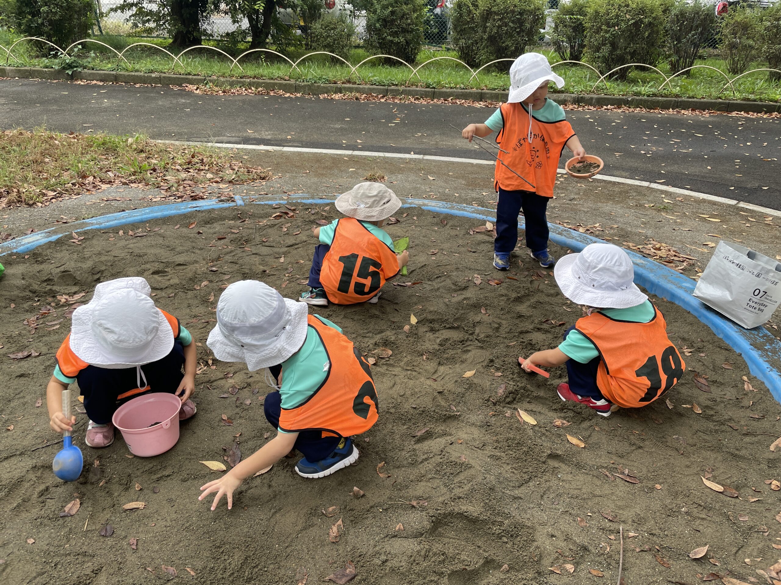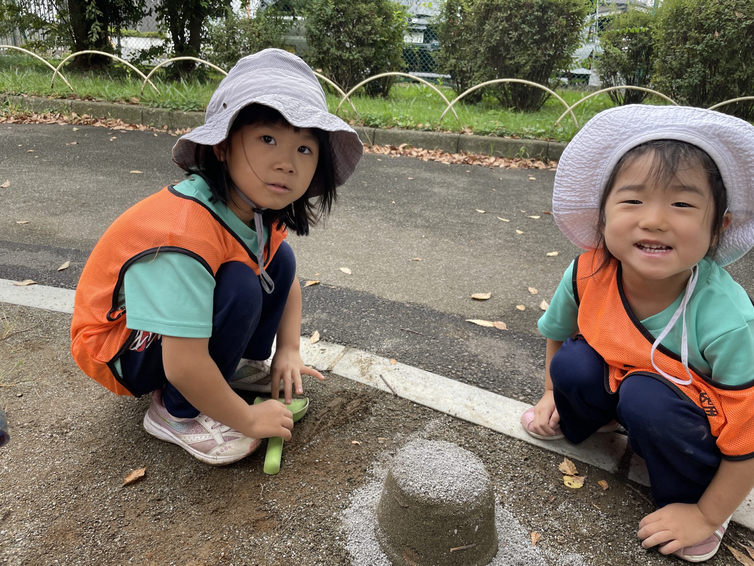 子どもたちは、手のひらで砂をギュッと握ったり、スコップで型抜きをしたりと、砂の感触を楽しんでいます。