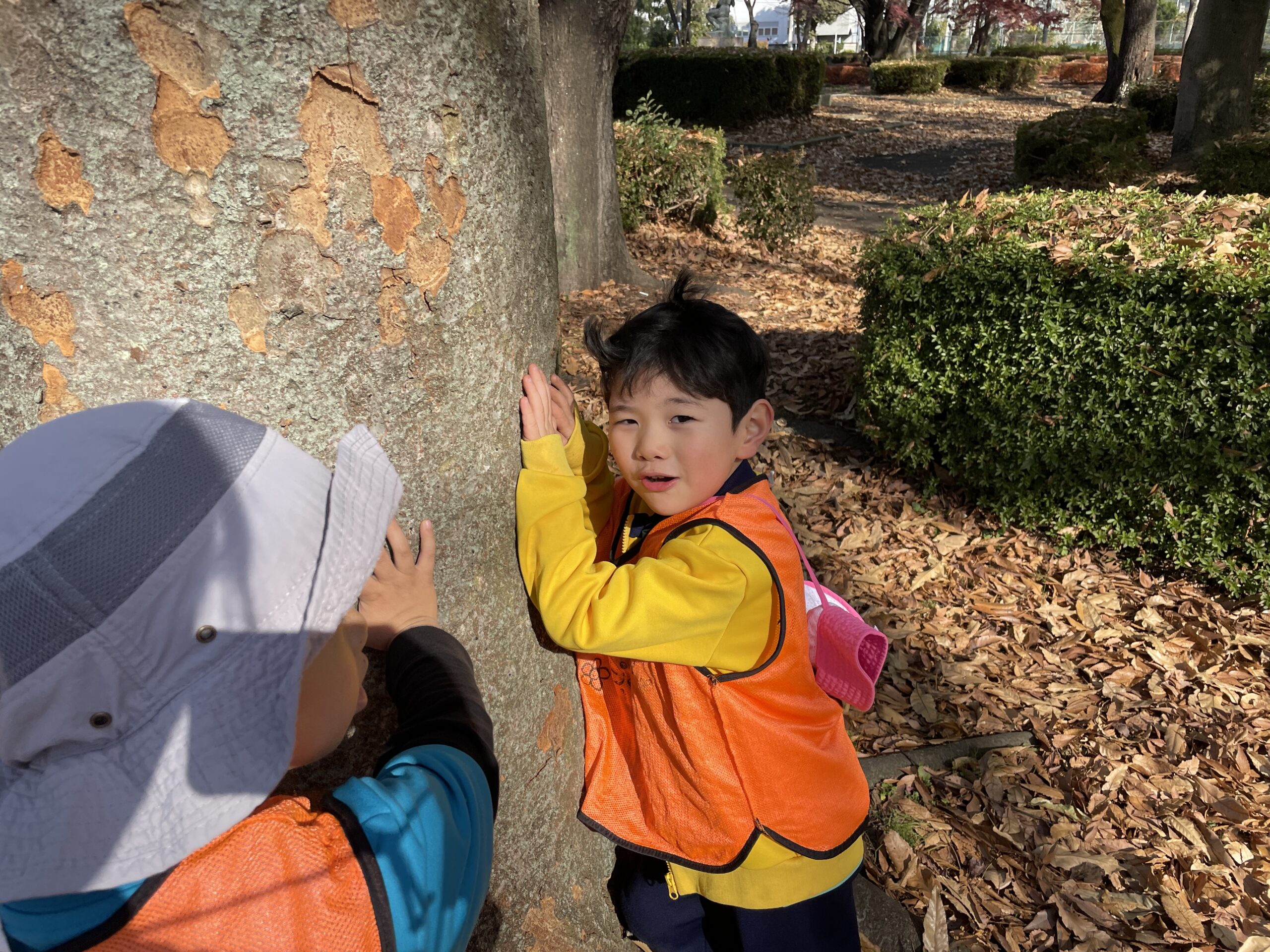 公園には落ち葉がいっぱい!それを両手にいっぱい持って追いかけっこをする、、というような謎の遊び(笑)や、大きな広い公園なのでそこを利用して、かくれんぼを楽しむ子どもたち!