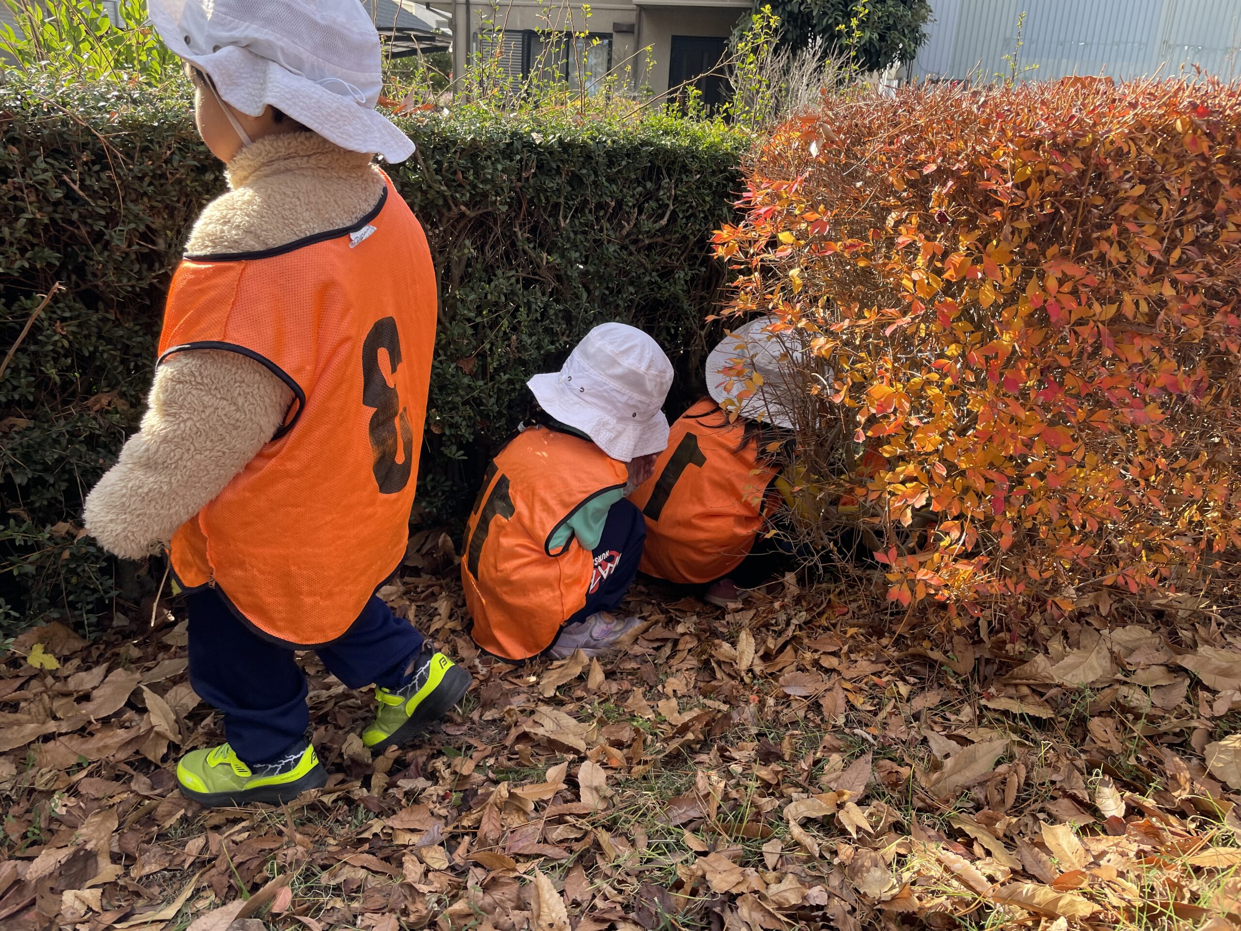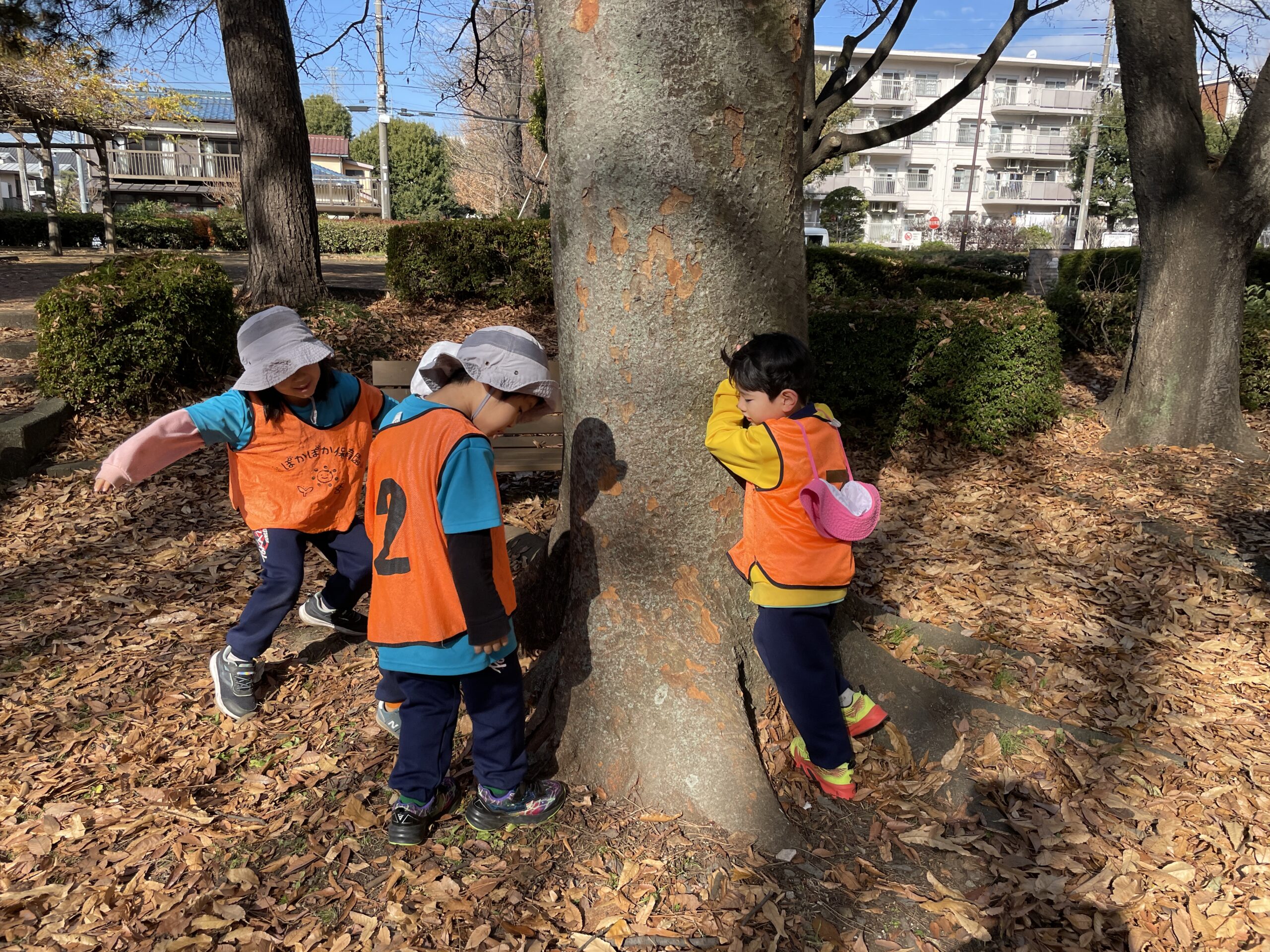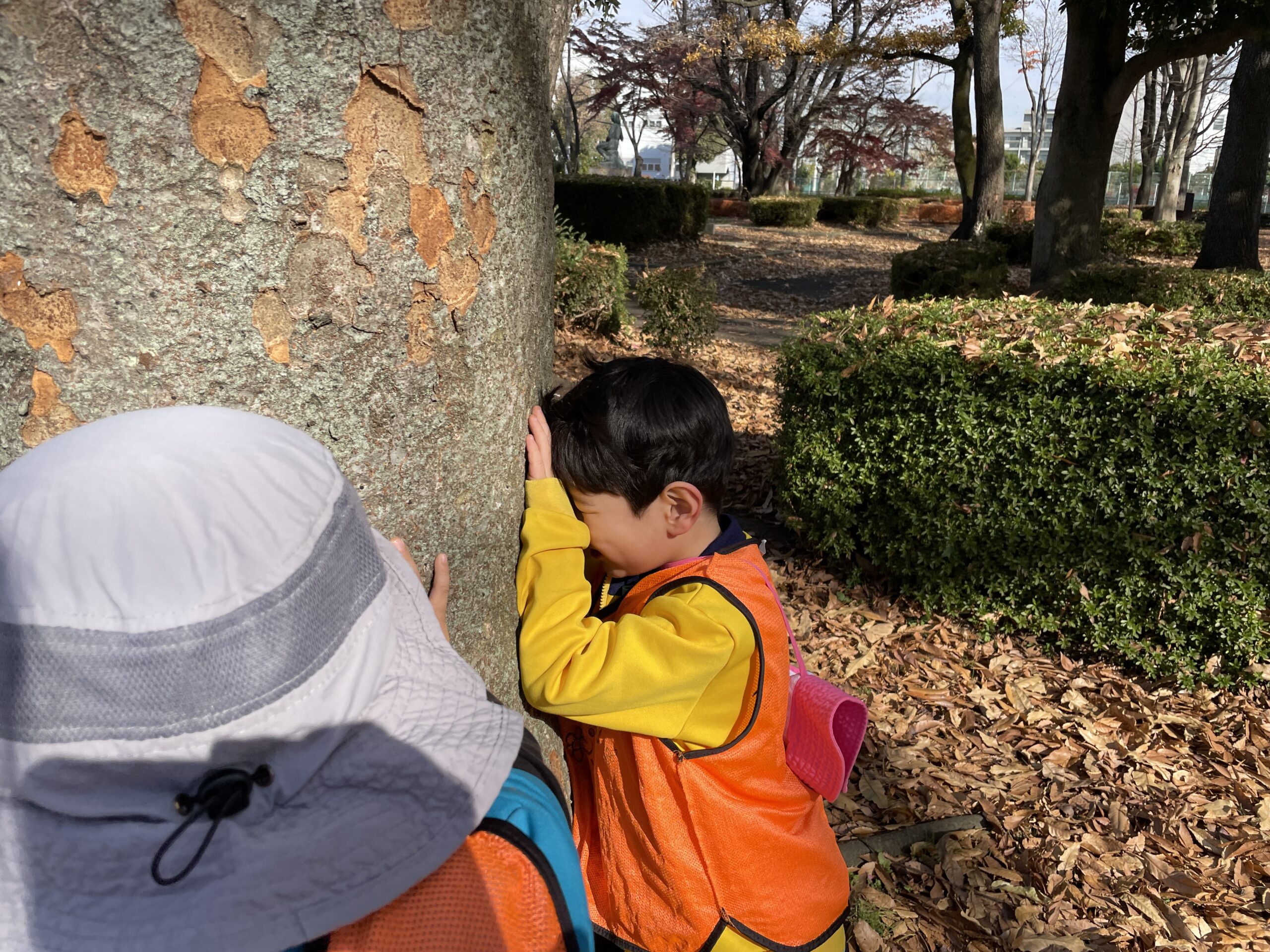 公園には落ち葉がいっぱい!それを両手にいっぱい持って追いかけっこをする、、というような謎の遊び(笑)や、大きな広い公園なのでそこを利用して、かくれんぼを楽しむ子どもたち!