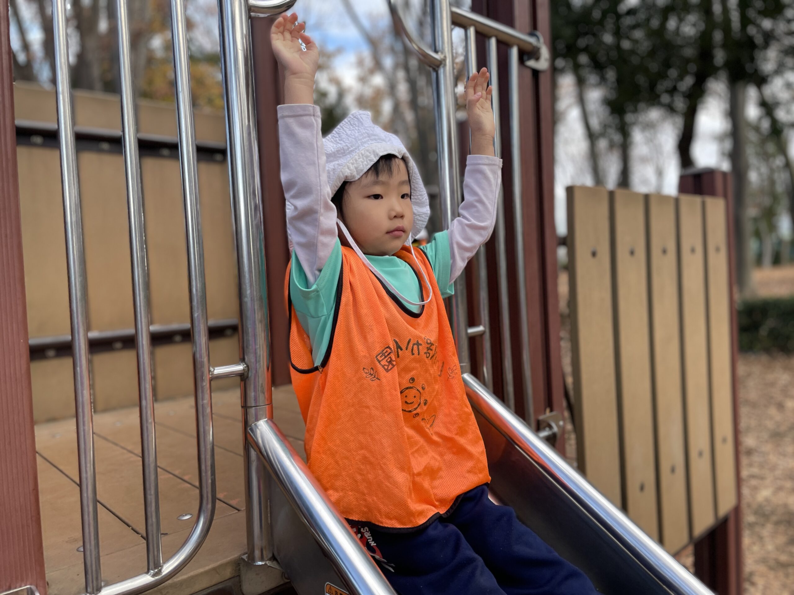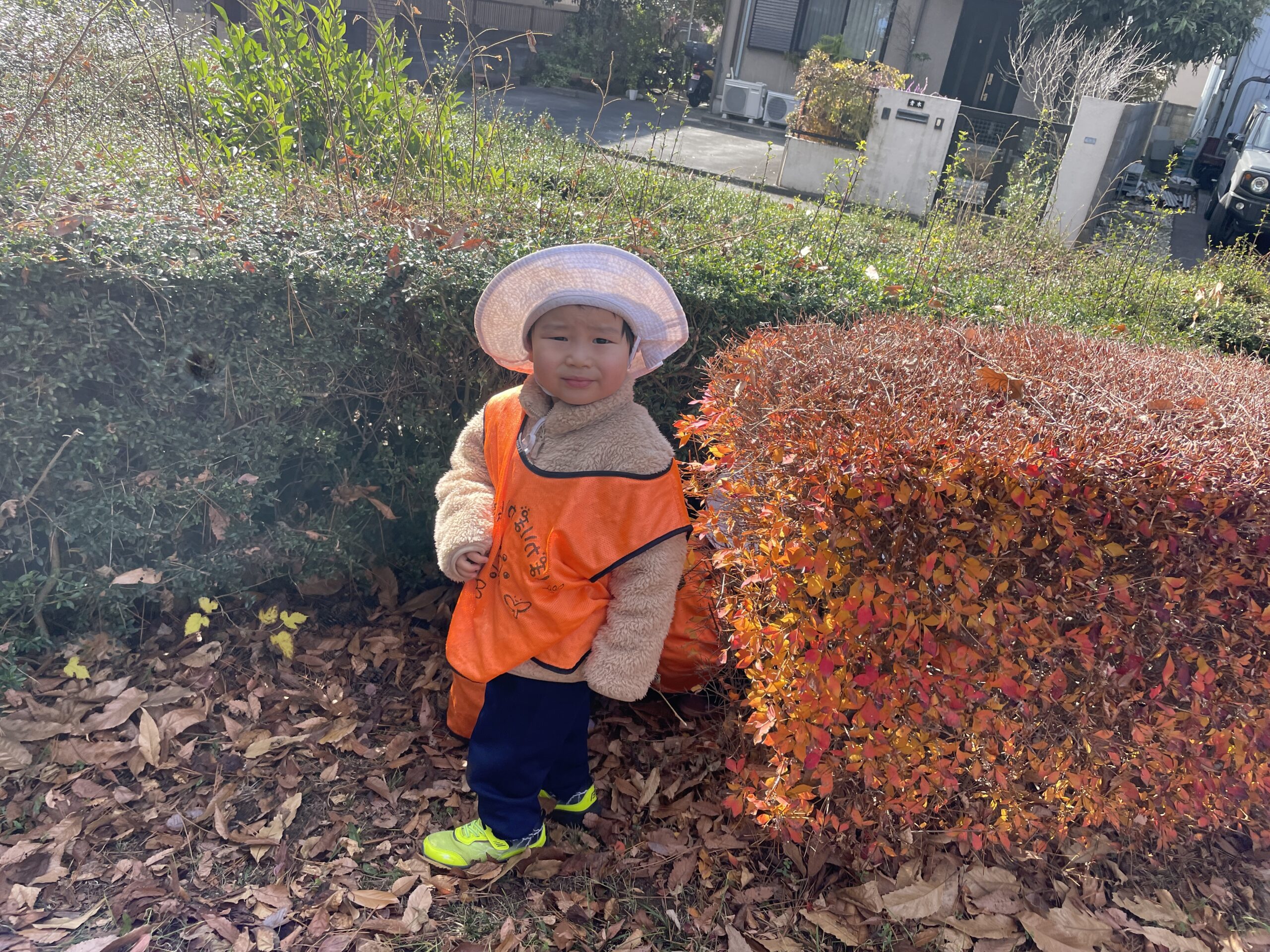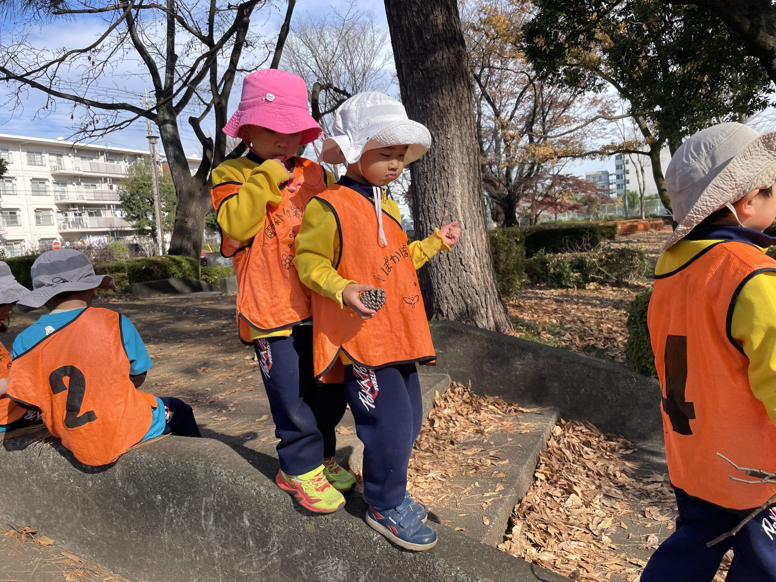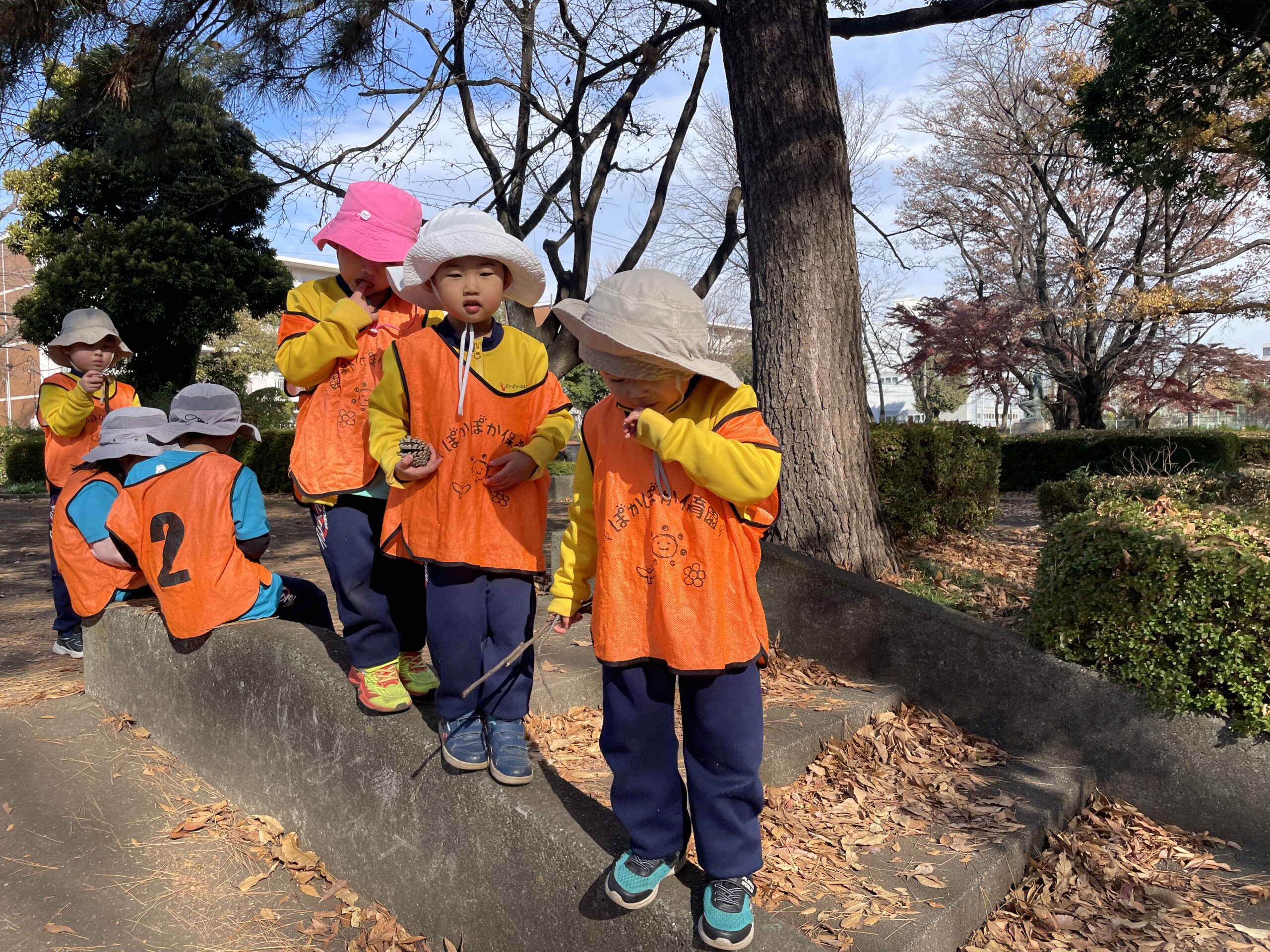 公園には落ち葉がいっぱい!それを両手にいっぱい持って追いかけっこをする、、というような謎の遊び(笑)や、大きな広い公園なのでそこを利用して、かくれんぼを楽しむ子どもたち!