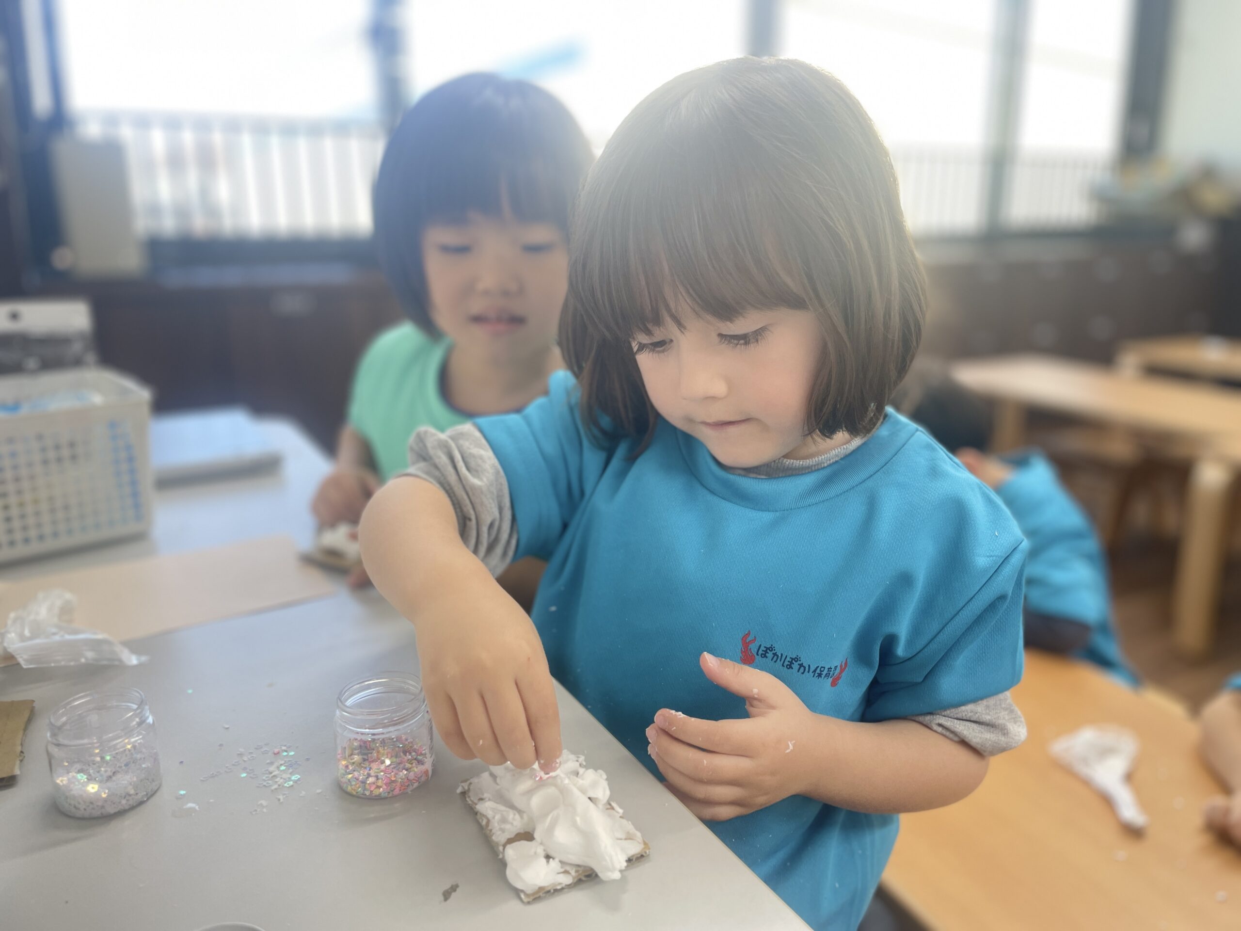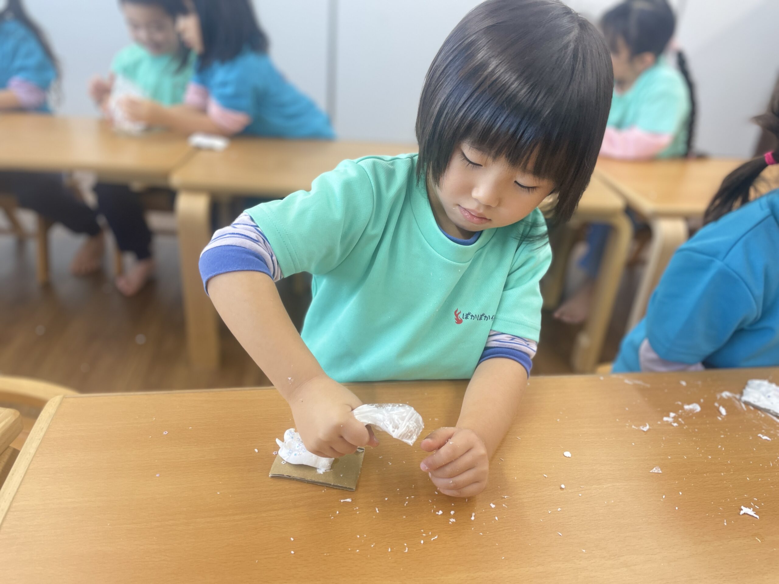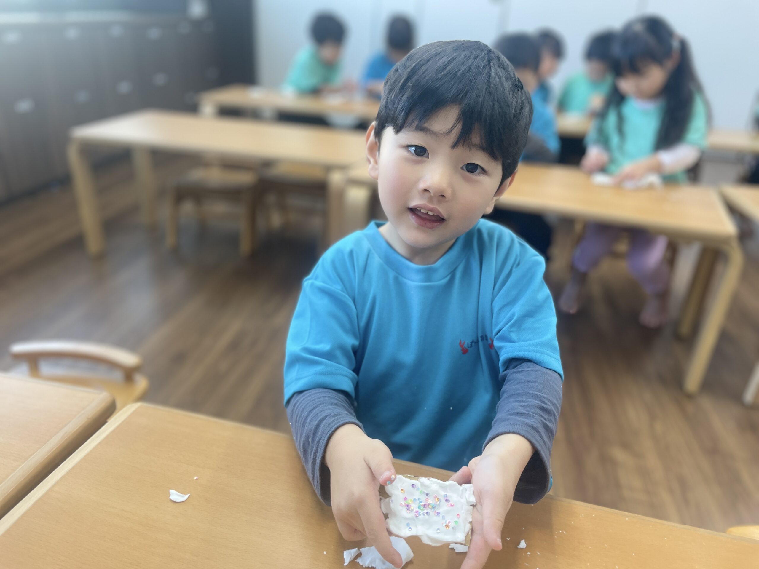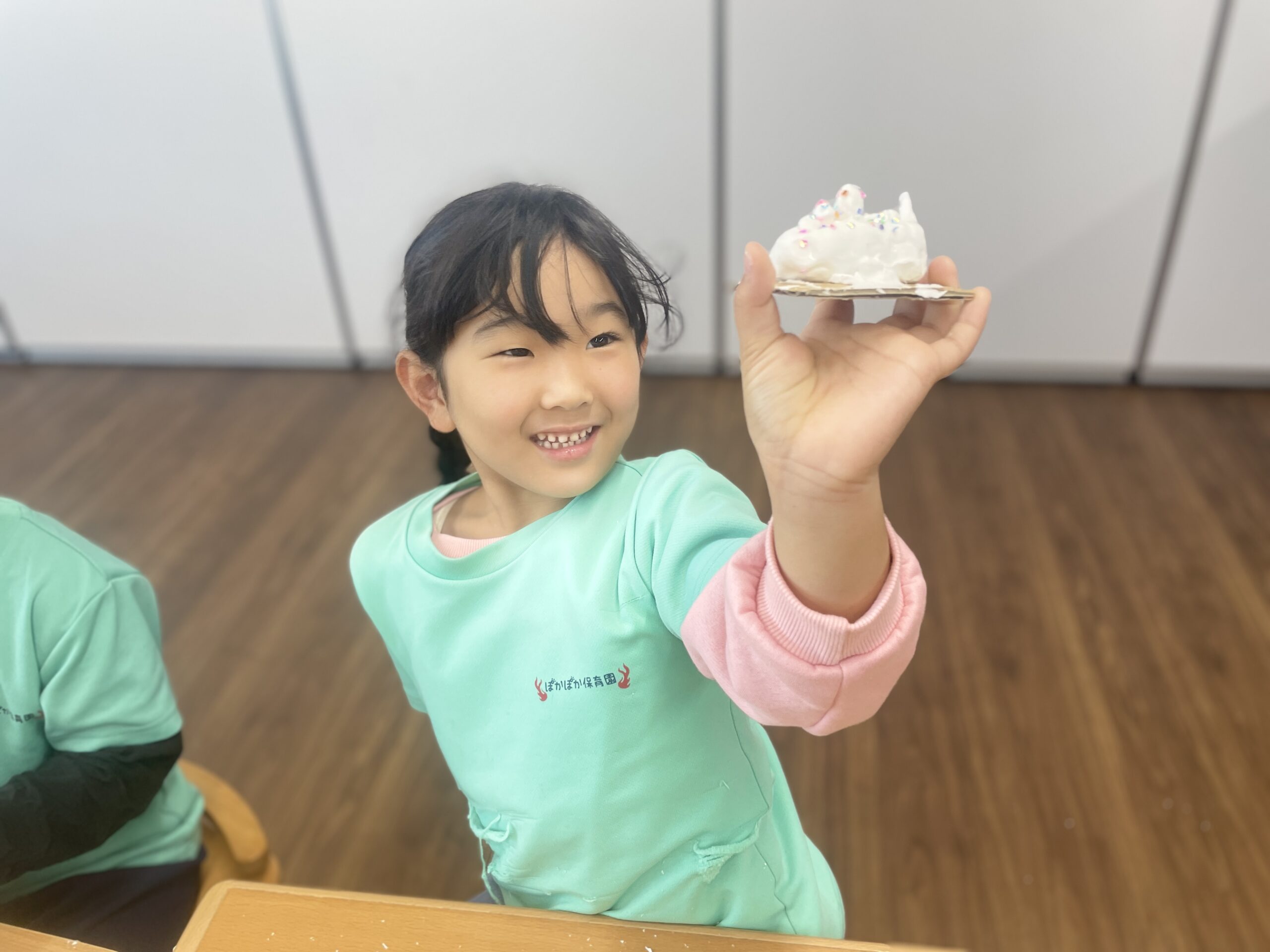 今回は「生クリームをつくろう!」とのことで、紙粘土とお水とベビーオイルを混ぜ混ぜ、、、