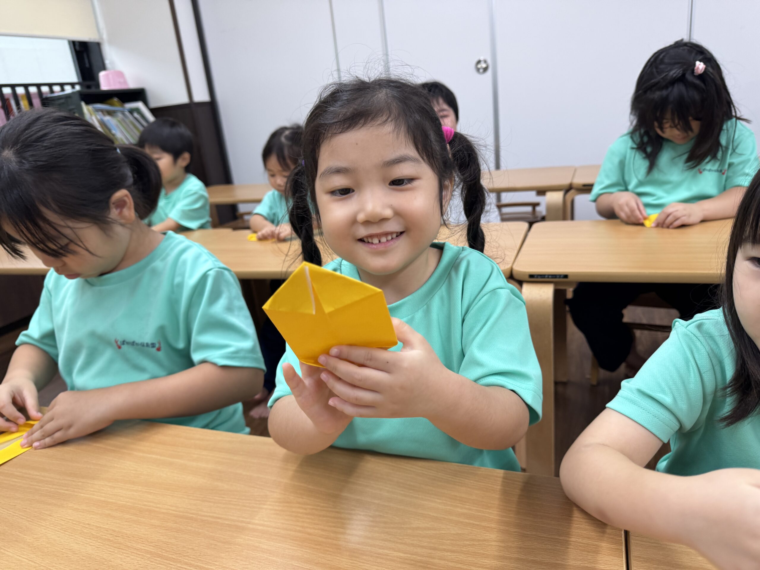 折り紙を広げると、真剣な表情で折り目をつける子どもたち。