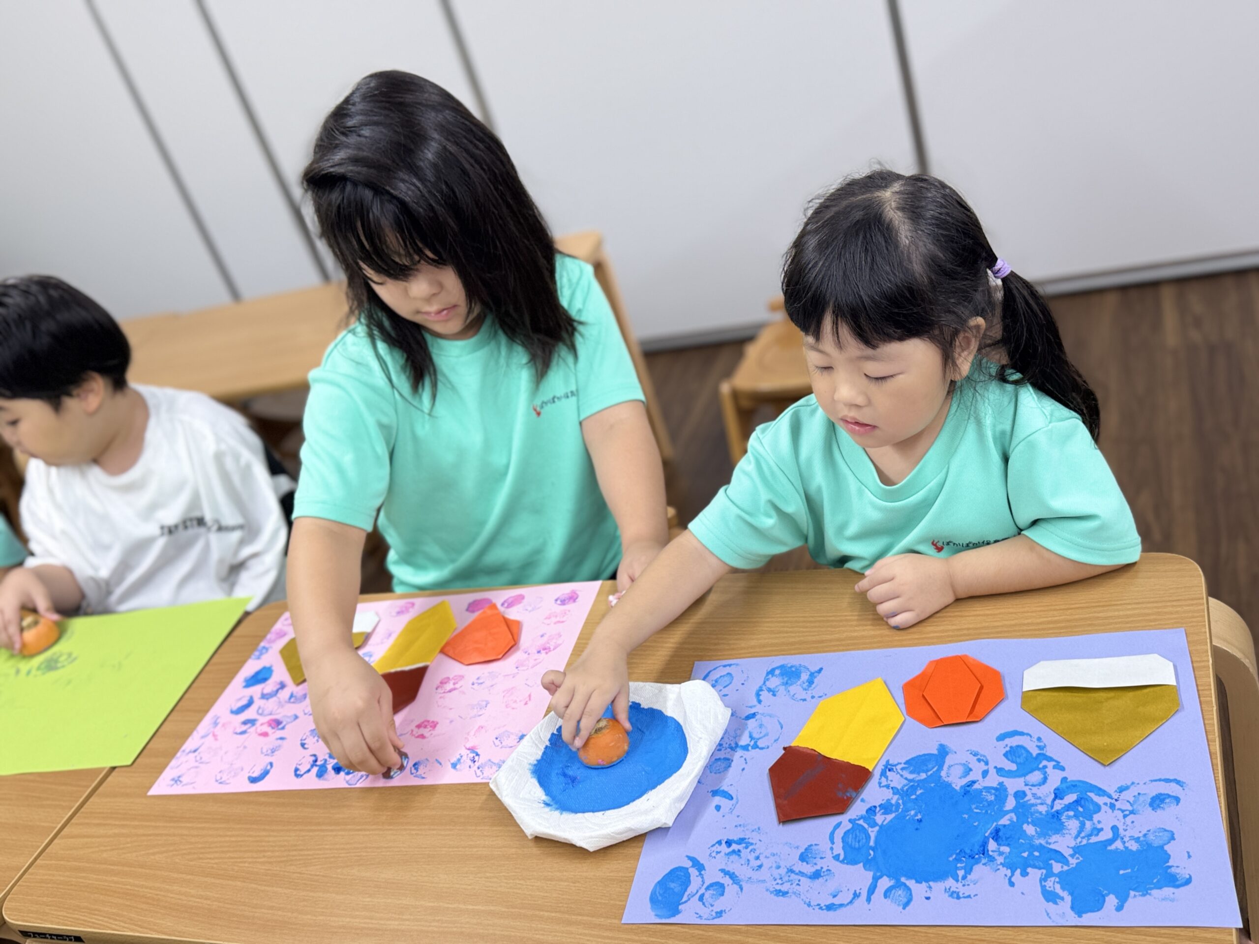 絵の具をつけて画用紙に押すと、ポンッと鮮やかな模様が浮かび上がり、