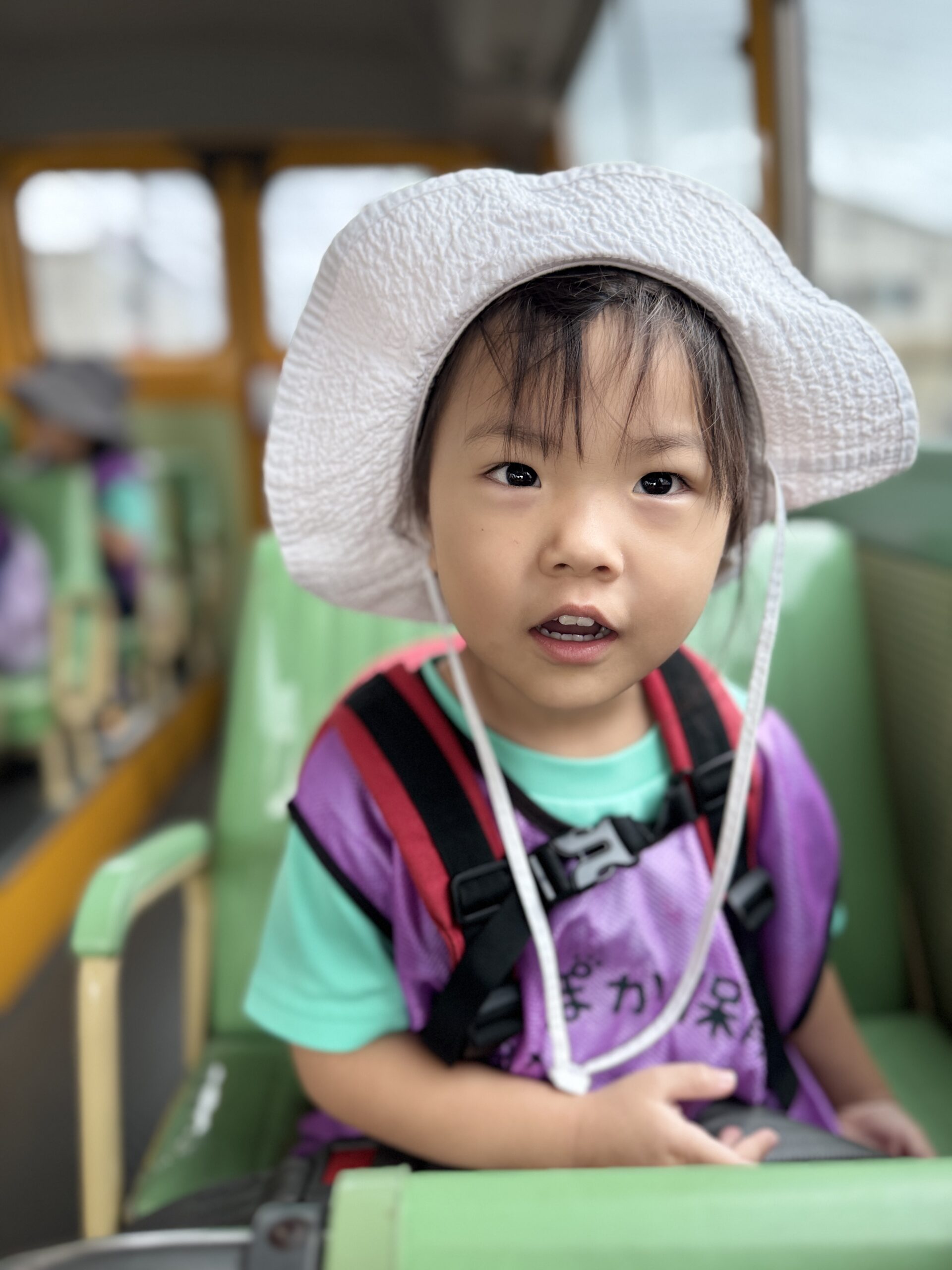 バスの中でのお約束は「お話は小さな声で」「前を向いて乗る」です。安全のためにも大切なお約束。しっかりと伝えていきます。