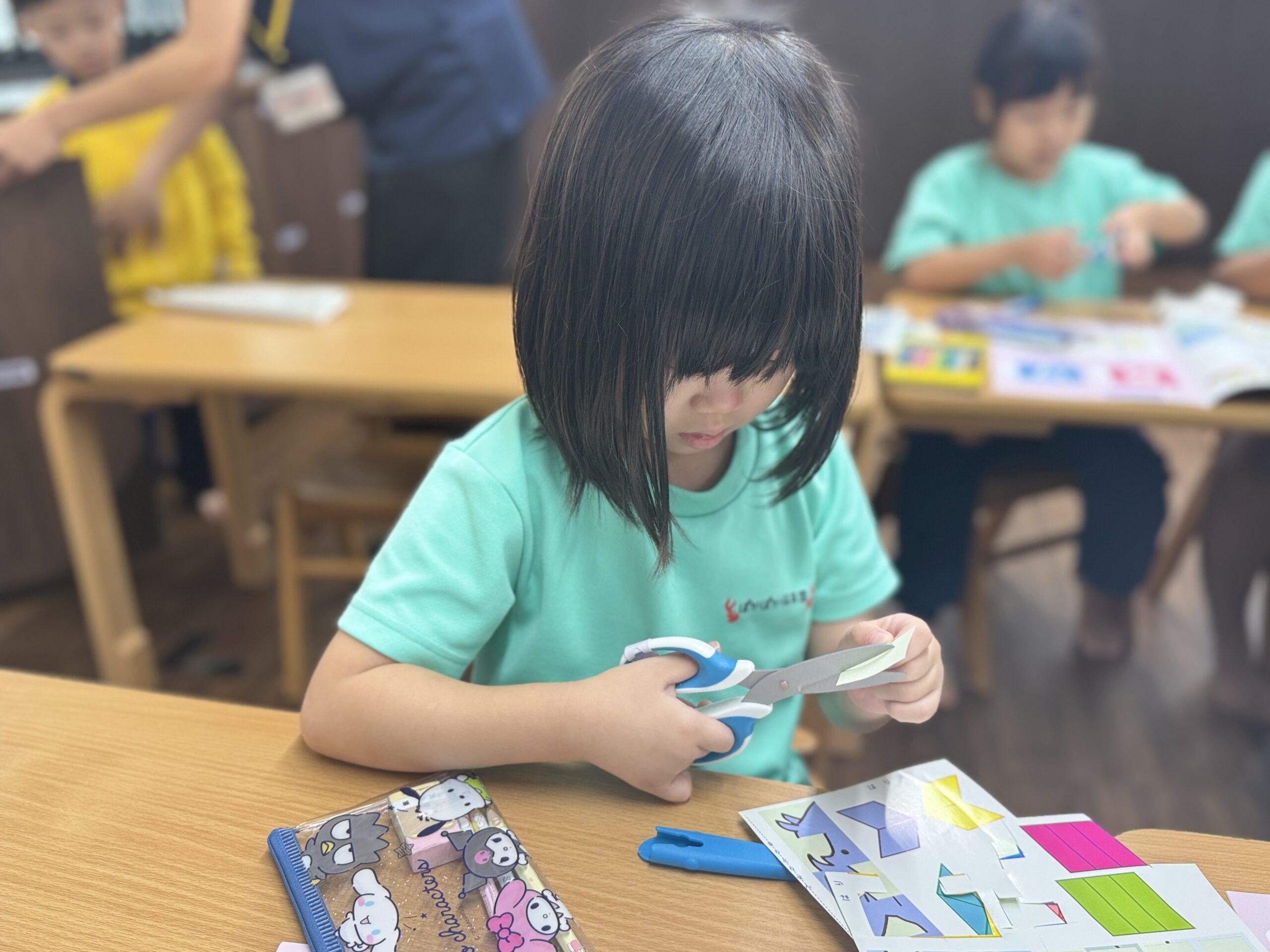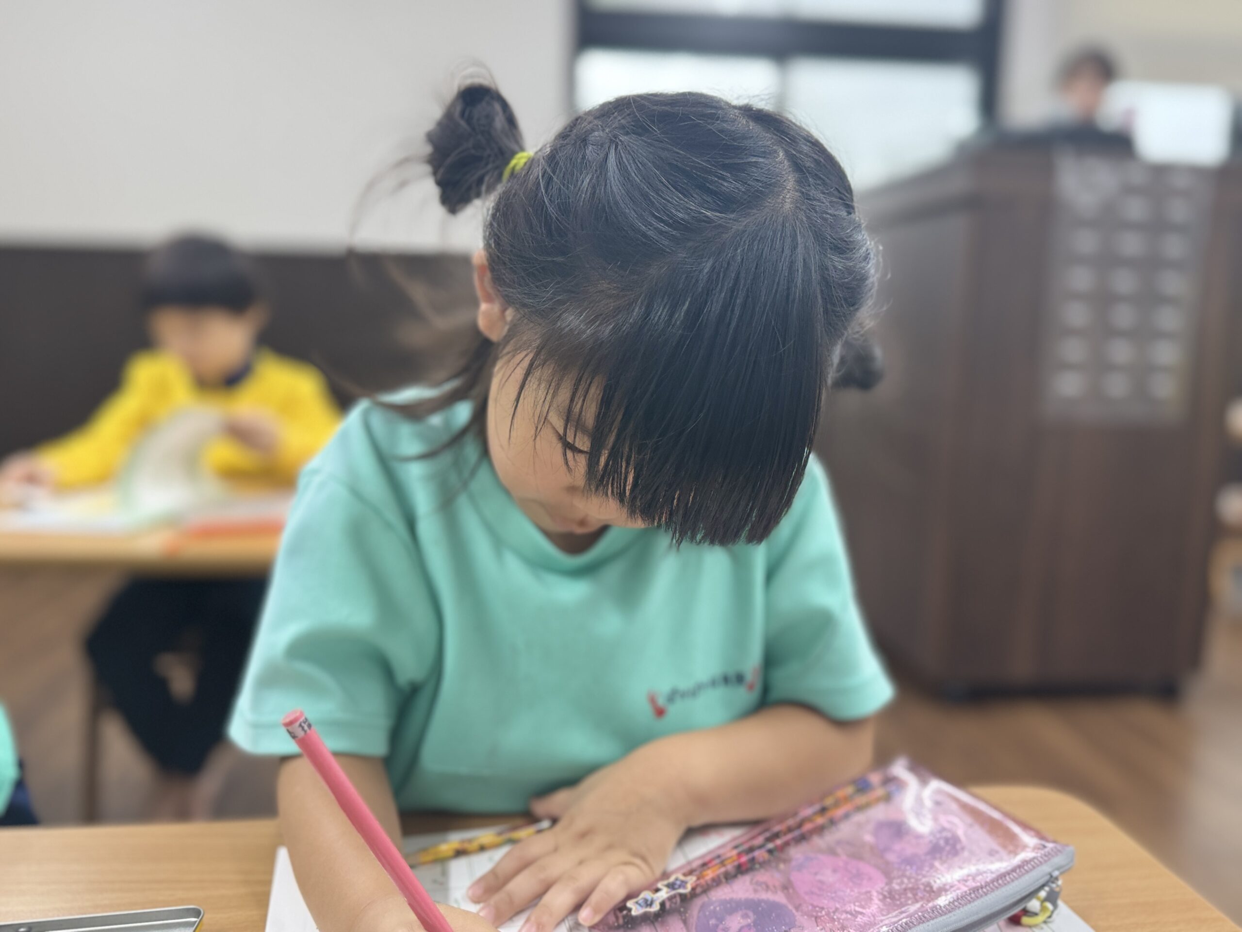 一人ひとりが机に向かい、鉛筆をしっかり持って真剣な表情。
