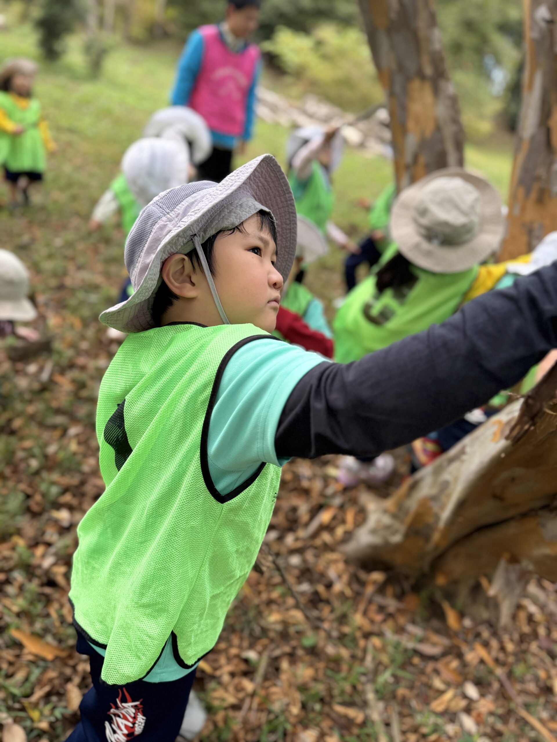 キノコが生えているか、めずらしい虫がいないか、みんなで探して探検中です!