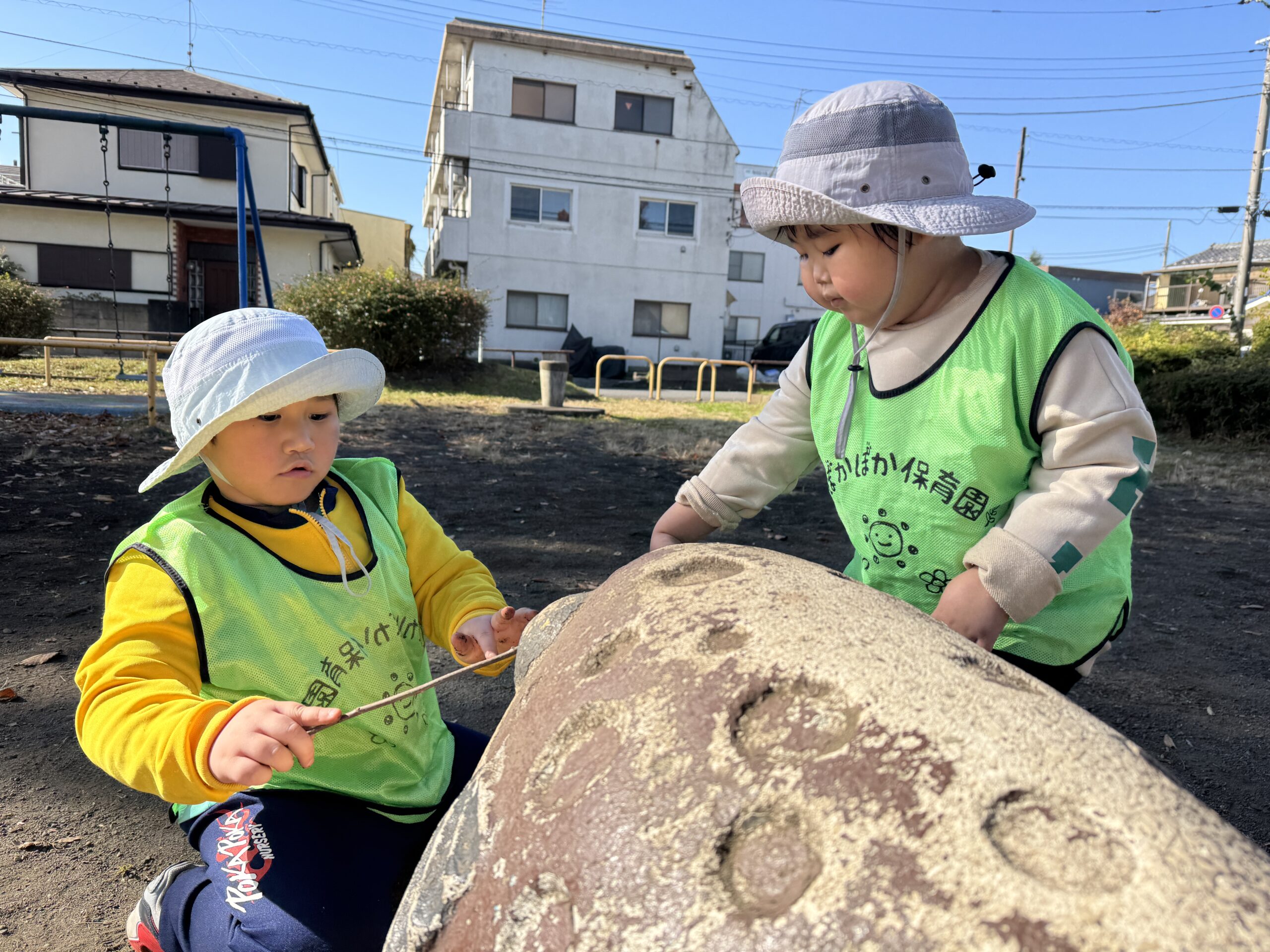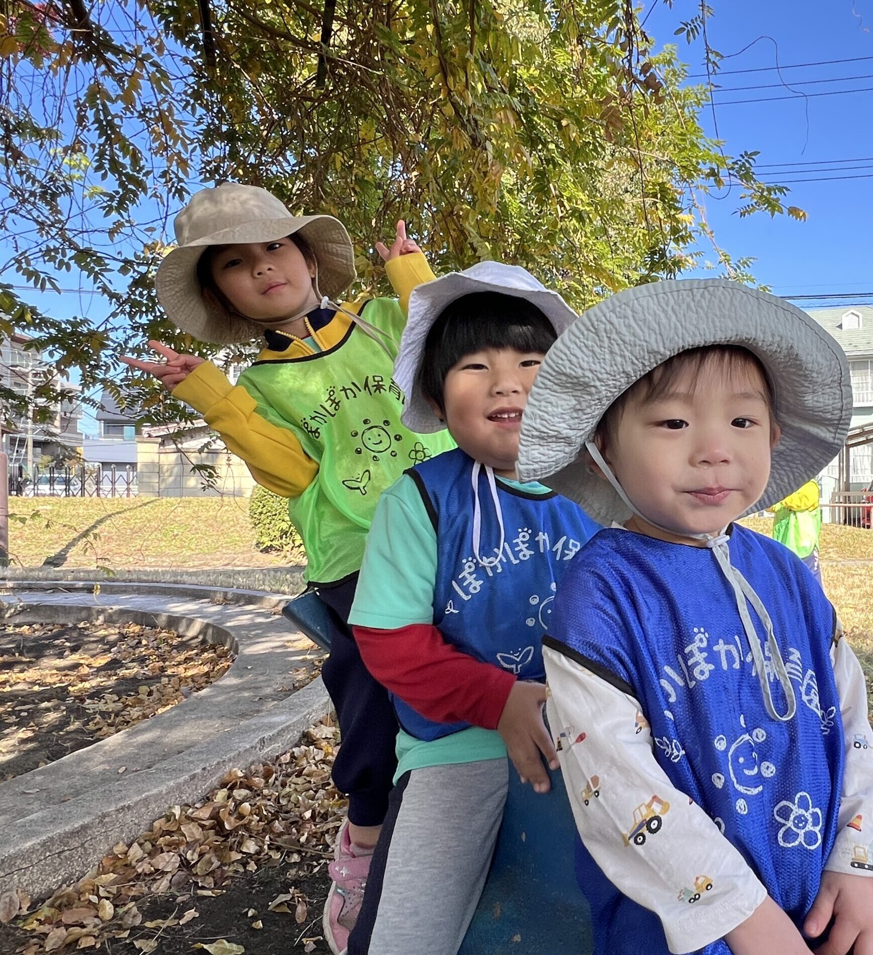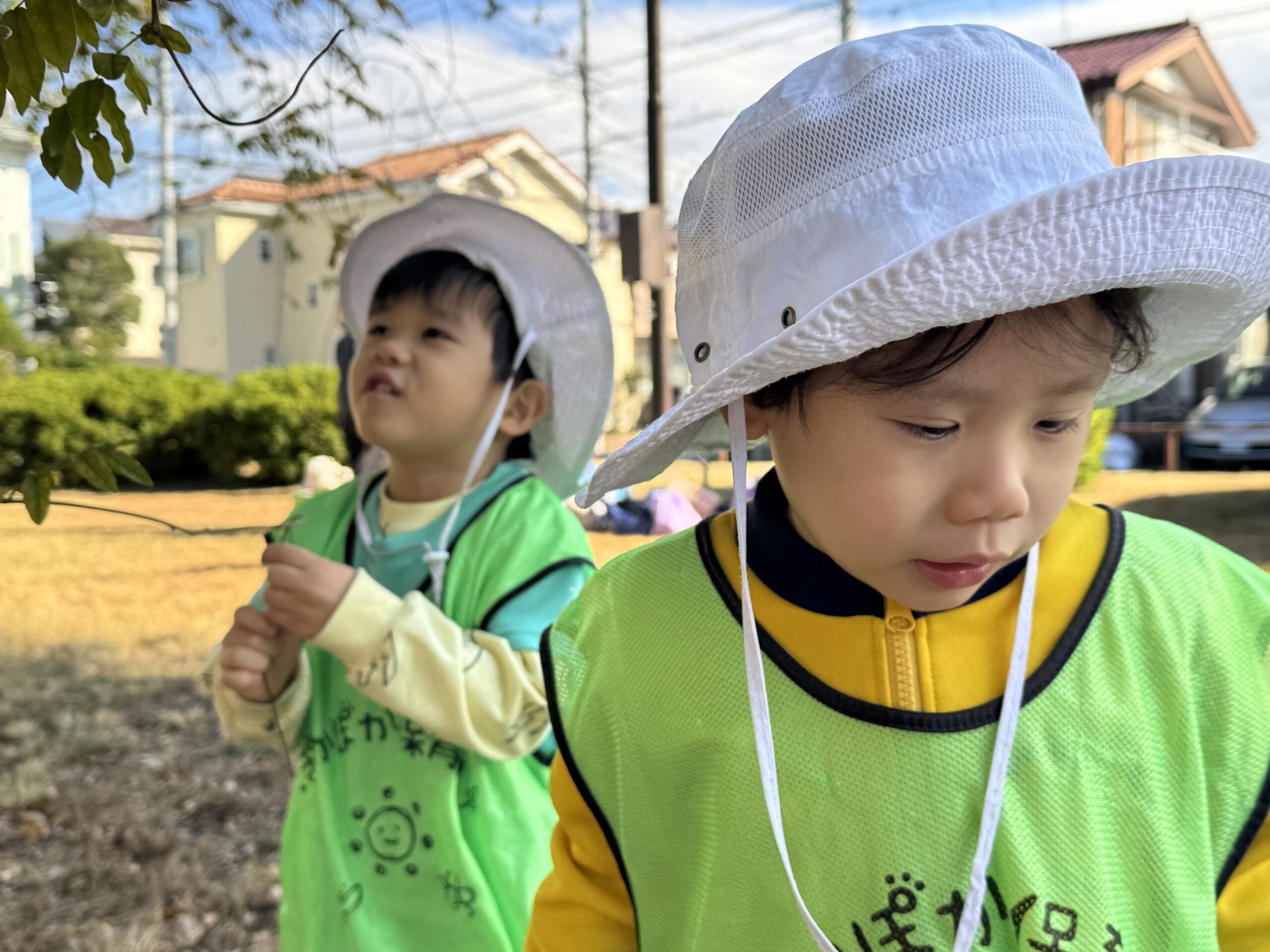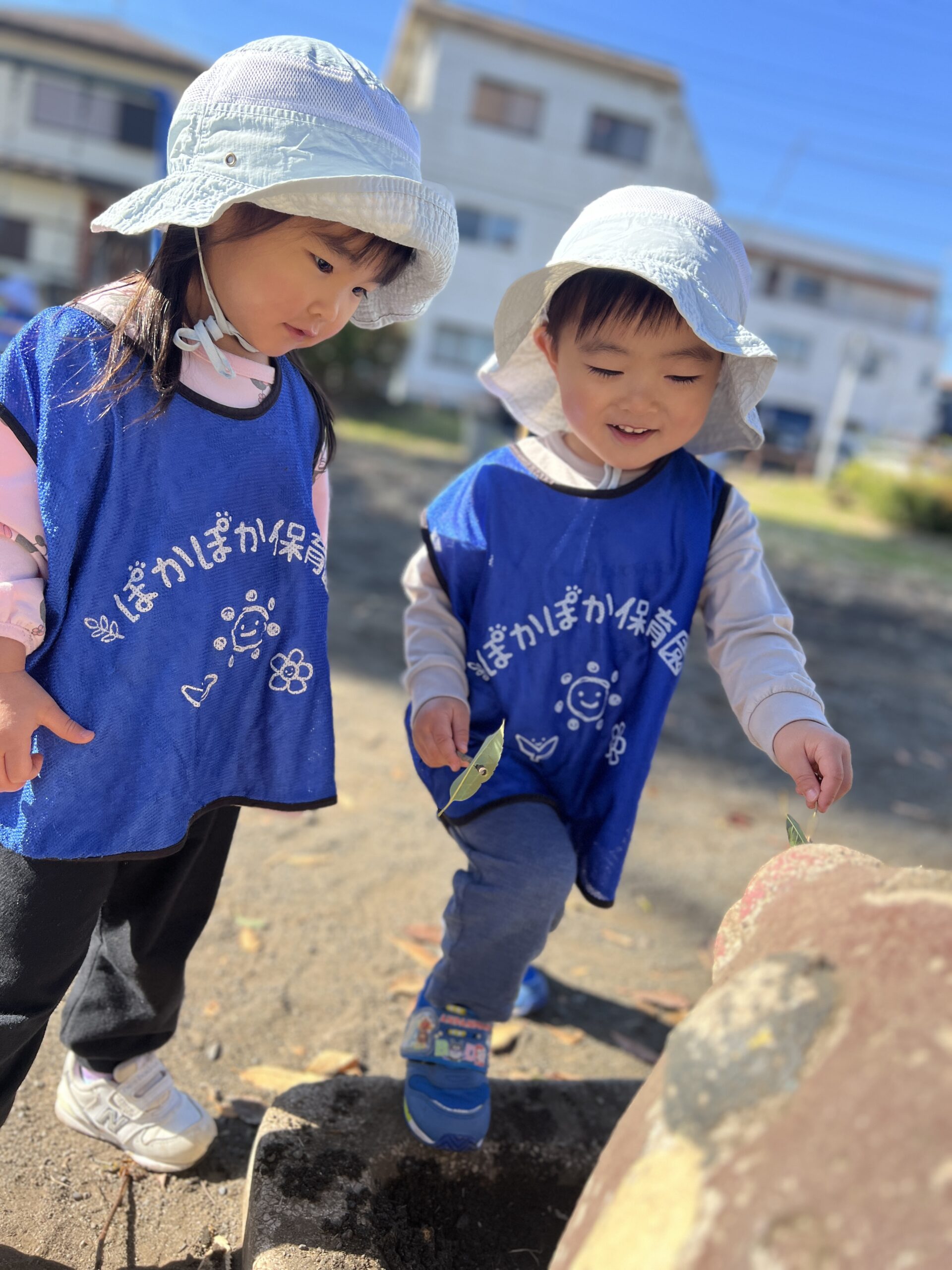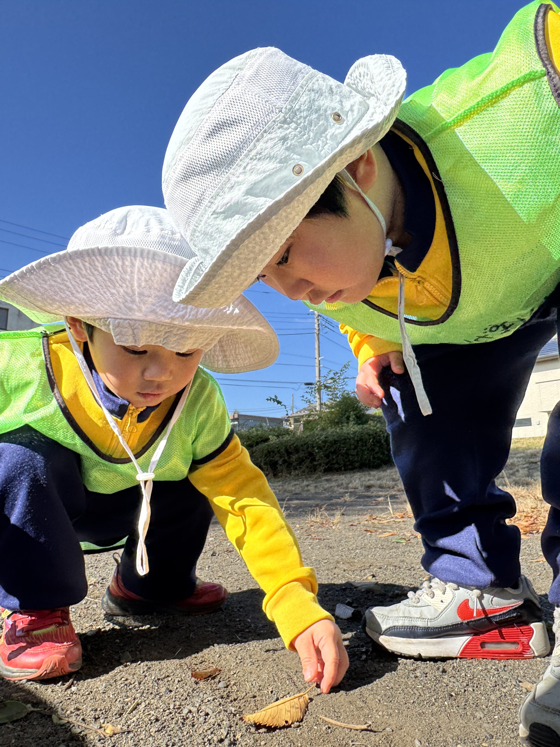 こちらは公園の中を探検して葉っぱを見つけて友だちと一緒に集めています!