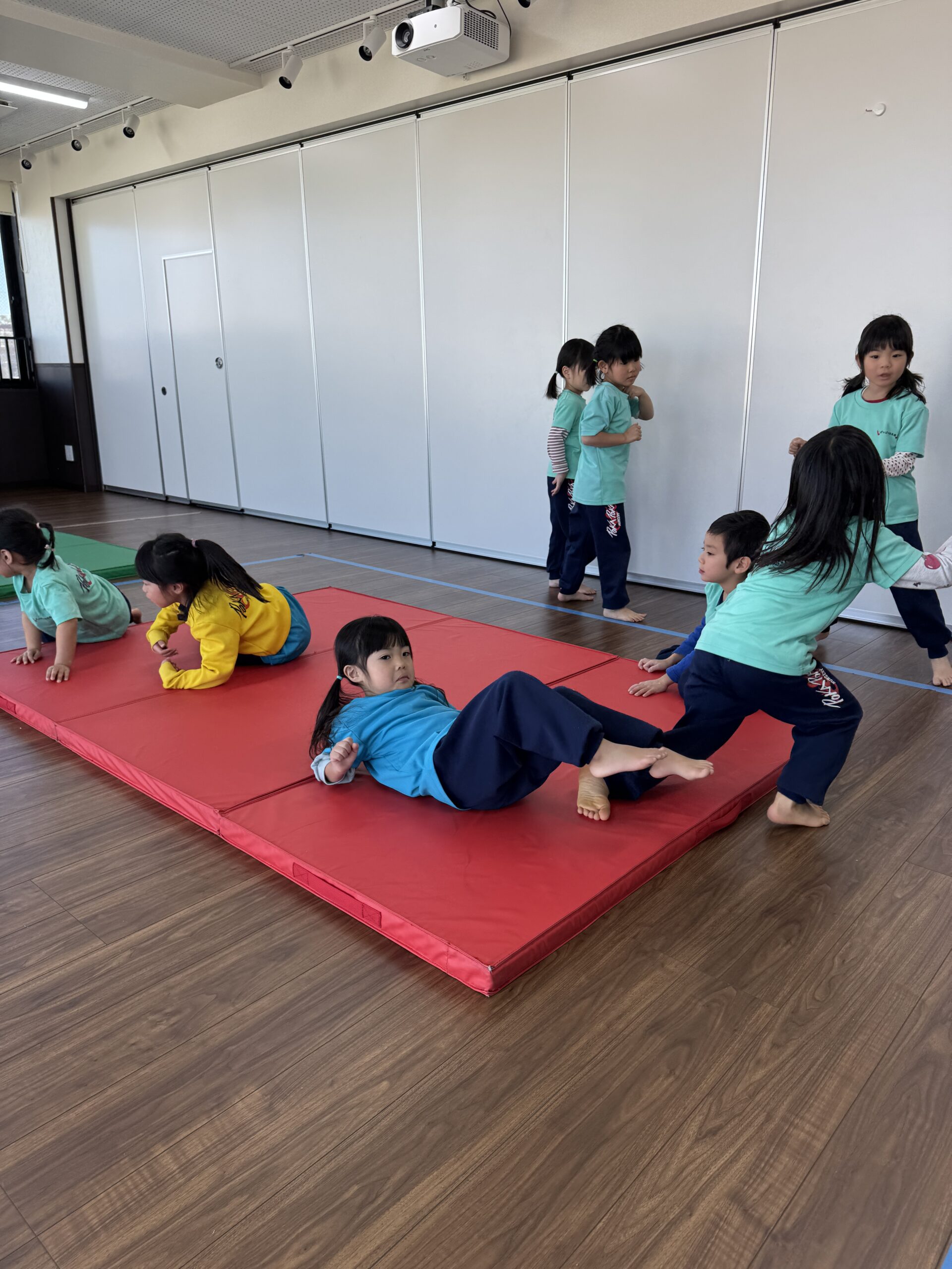 「次は腕を伸ばすよ〜」と先生の声を聞きながら、子どもたちは姿勢を整えて、全身をしっかり動かしていました。