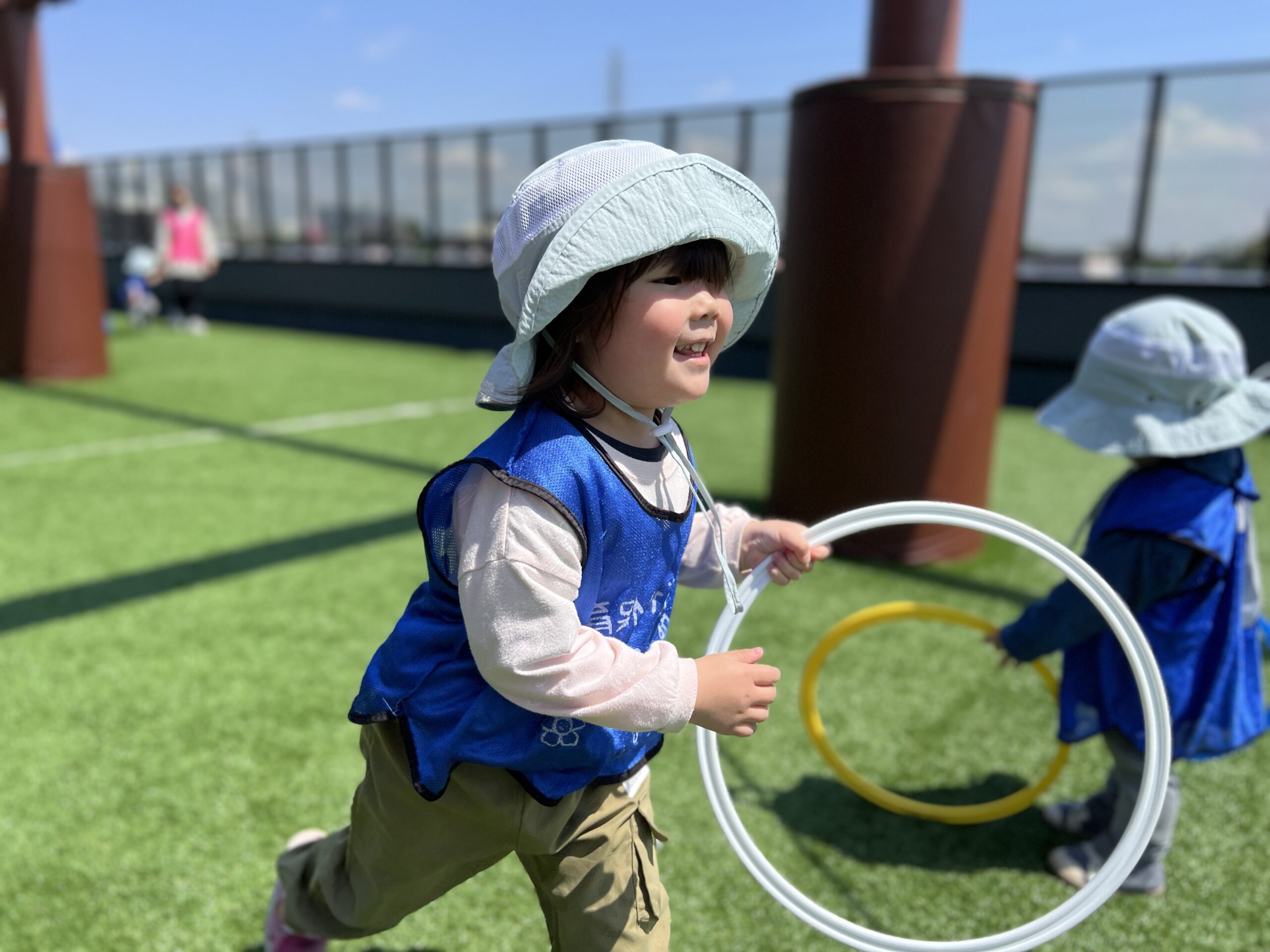 屋上では、フープを沢山持っているお友達に、そばにきた別のお友達が「かして?」と一言。言われたお友達も「いいよ!」とフープを差し出します。自然と生まれる“貸して”と“いいよ”のやりとりに、 成長のまなざしを感じた瞬間です。