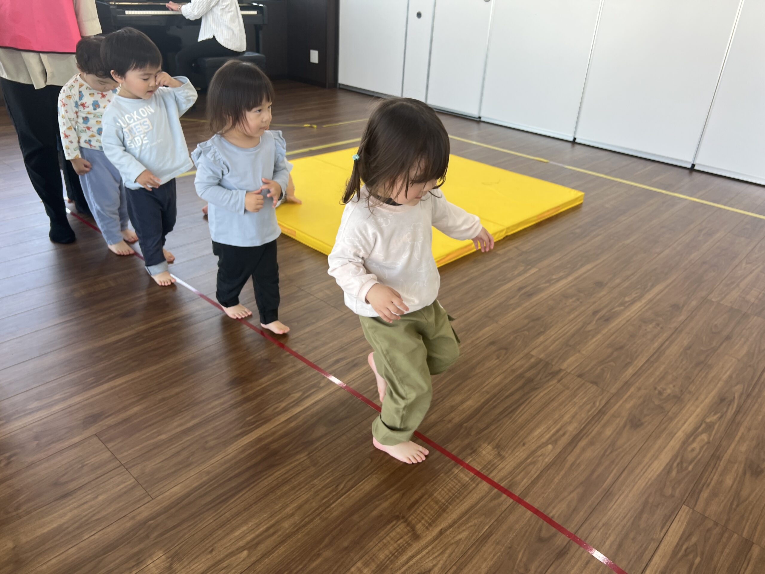 「あるこ〜あるこ〜♪」曲が流れると、体が自然と動き出します。線に沿って歩いている途中で、、「チューリップさんになるよ〜」の声かけに合わせて赤いマットに移動したり、 「カエルさんにもなっちゃおう!」の声かけで今度は緑のマットに!子ども達もニコニコ笑顔で楽しそうに小さな体をいっぱい使って表現する子どもたち。