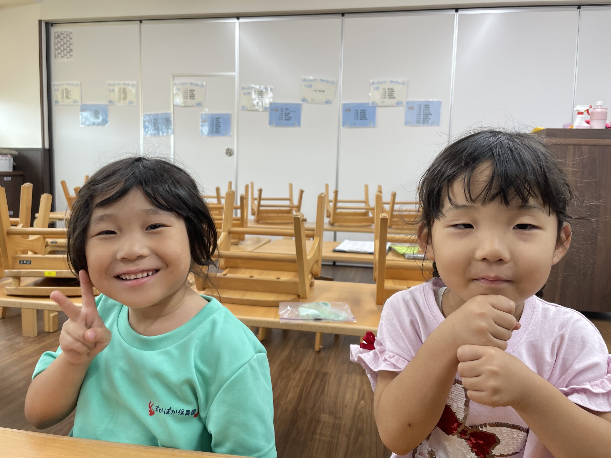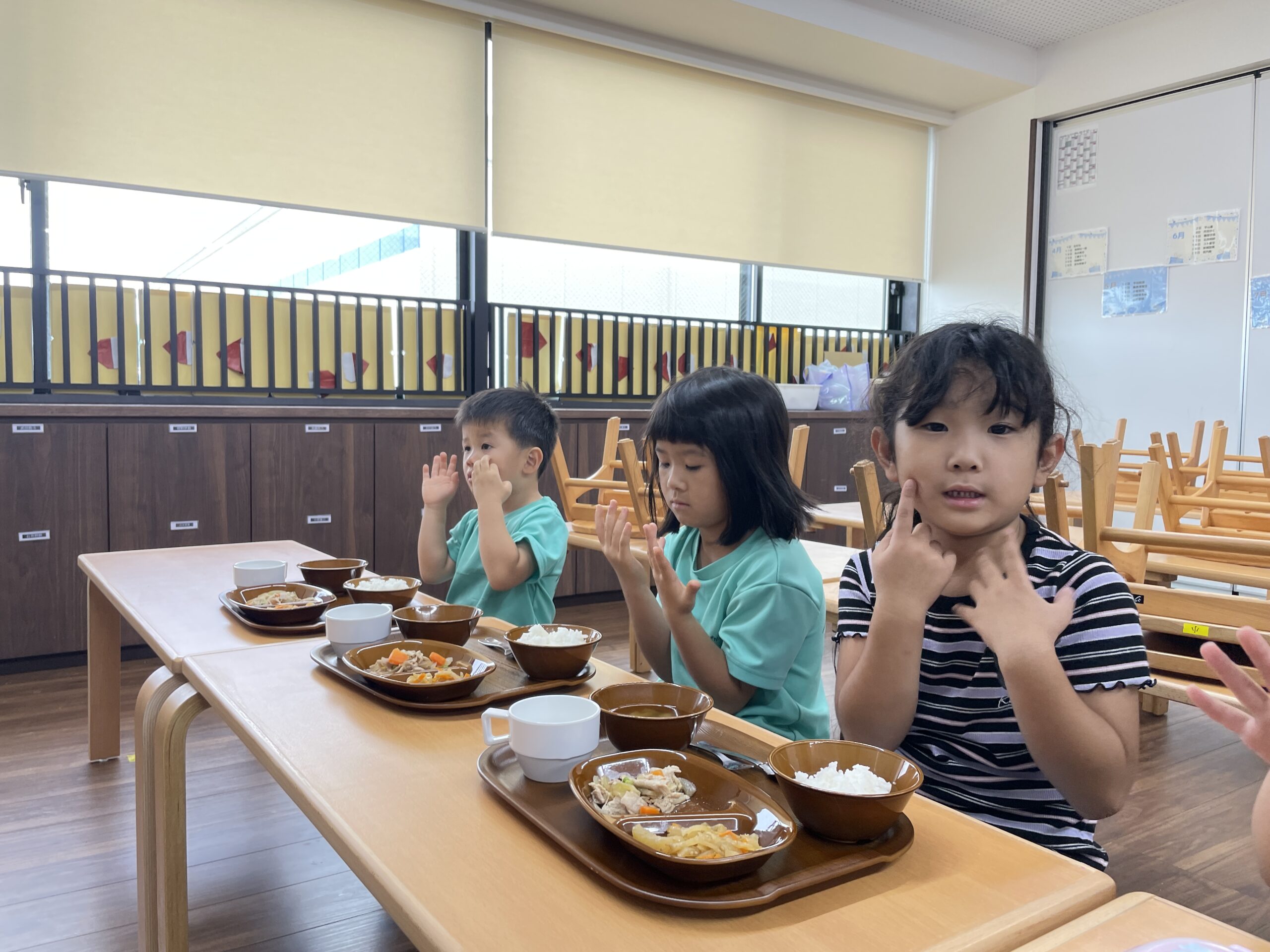 たくさん遊んだ後には給食です!「お腹空いた~!」と気持ちよく食事の用意をみんなで行い、元気にいただきます!!