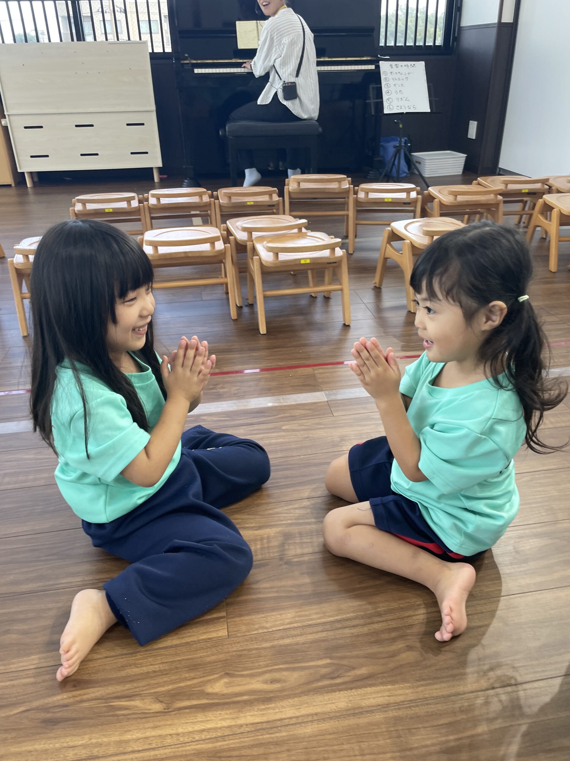 二人ペアーになってリズム打ちです。ピアノの音に合わせてお友達と協力です。