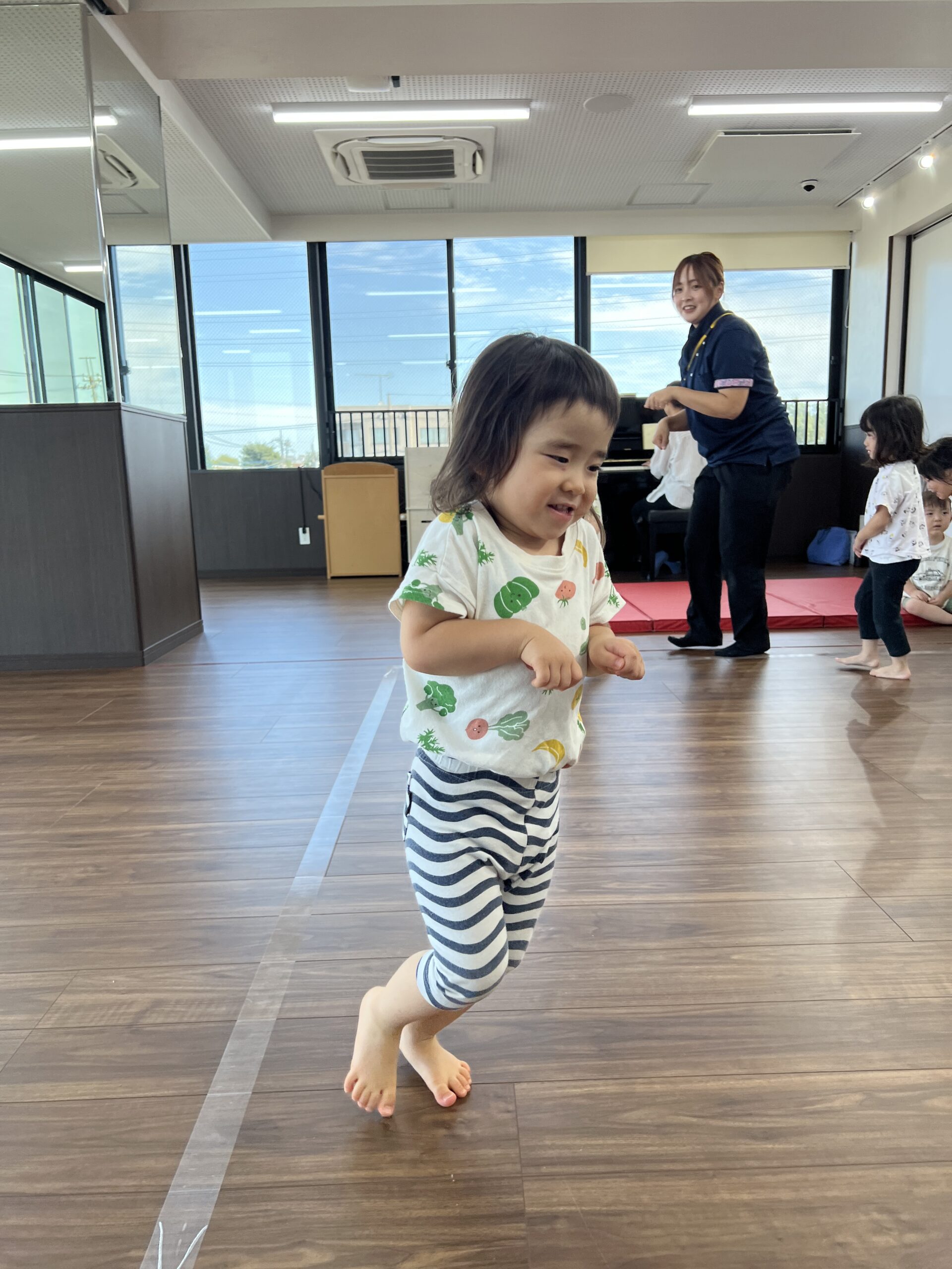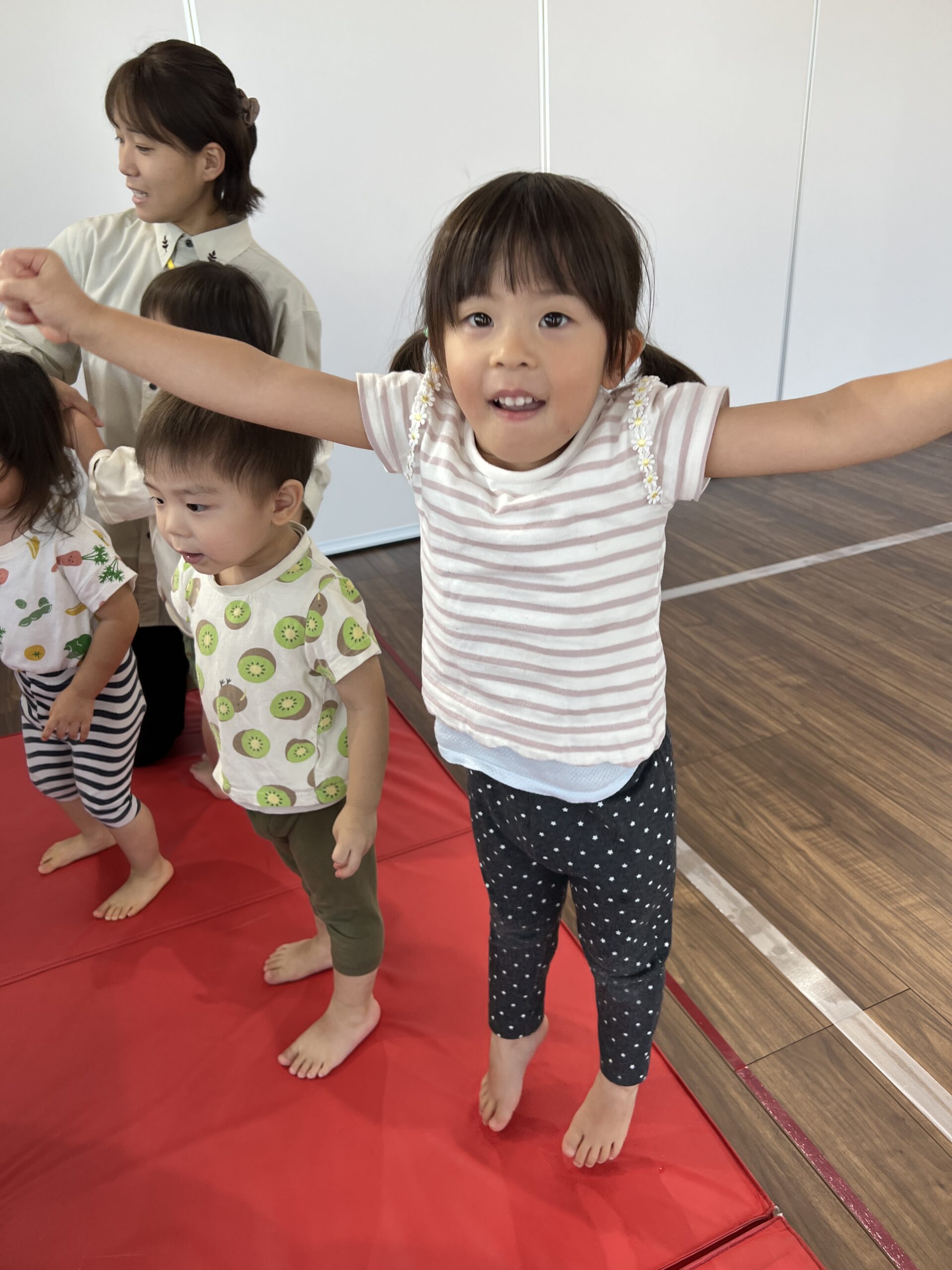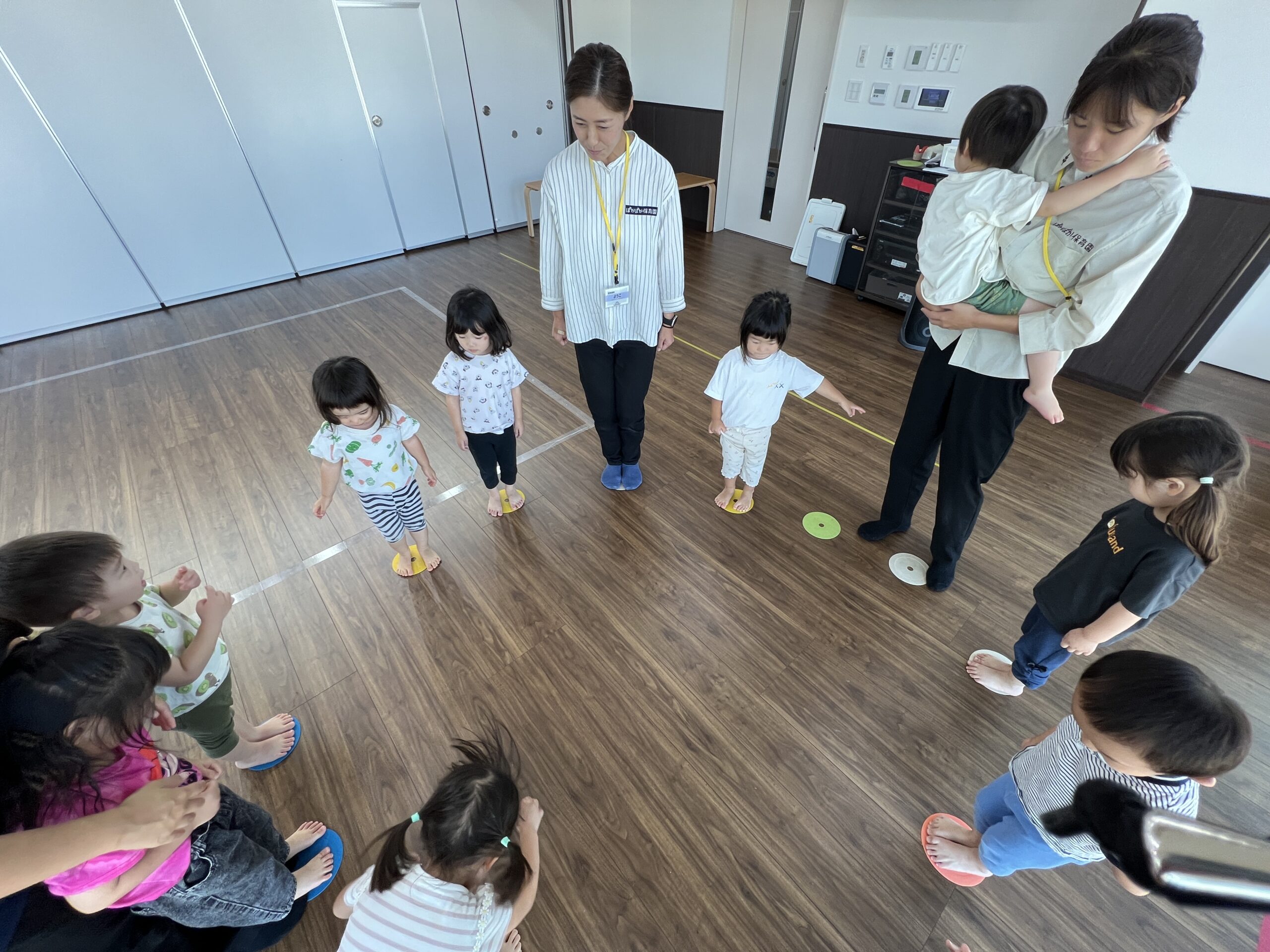 みんな、しっかり〇の中に足をピッてやってね!上手に立つことが出来ました。