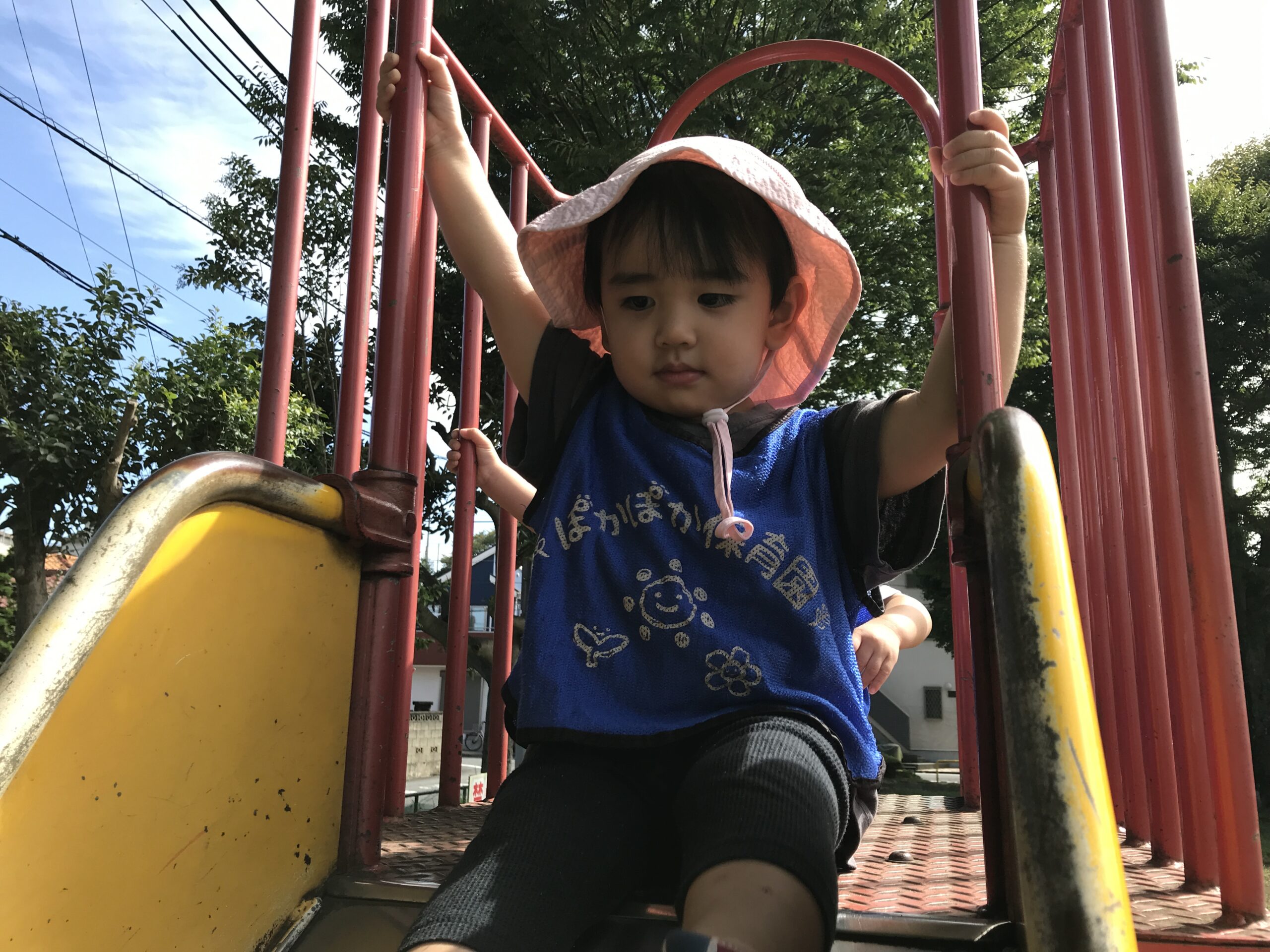 一人で階段をのぼり、「せんせい、みてて!」と笑顔で滑り降りる姿は、