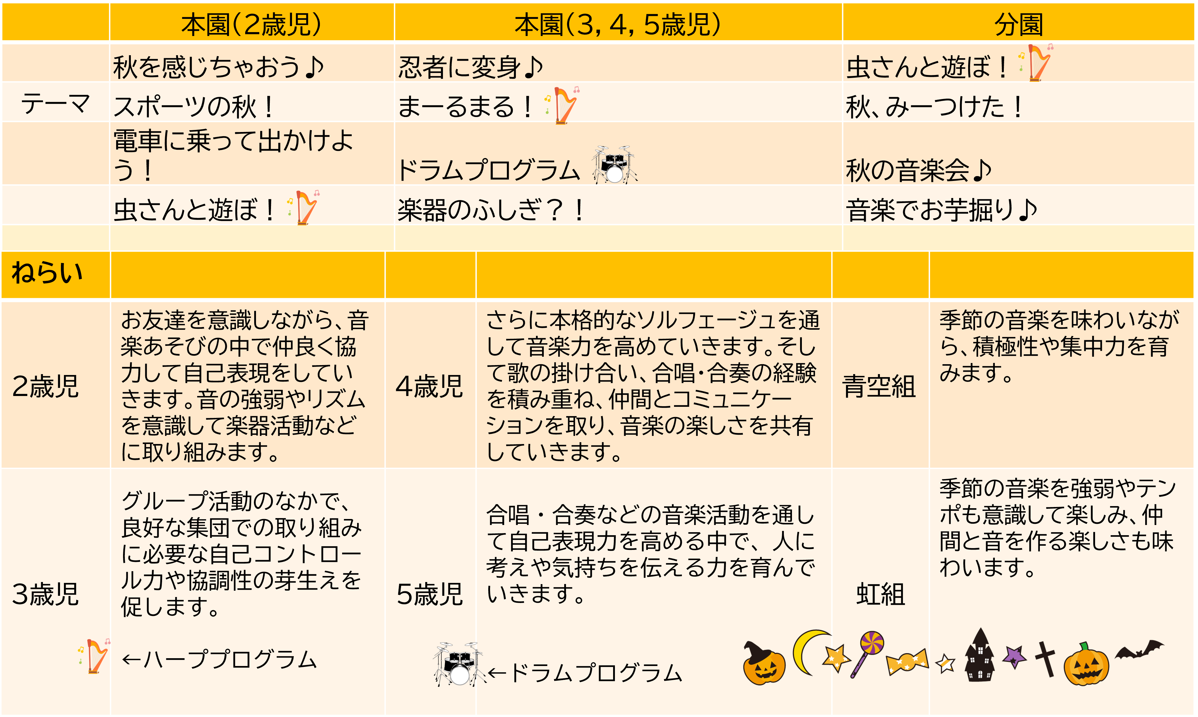 音楽でも、芸術の秋、スポーツの秋、食欲の秋など、この季節ならではの活動をたくさん盛り込み、子ども達の様々な力をさらに引き出していきたいと考えています。