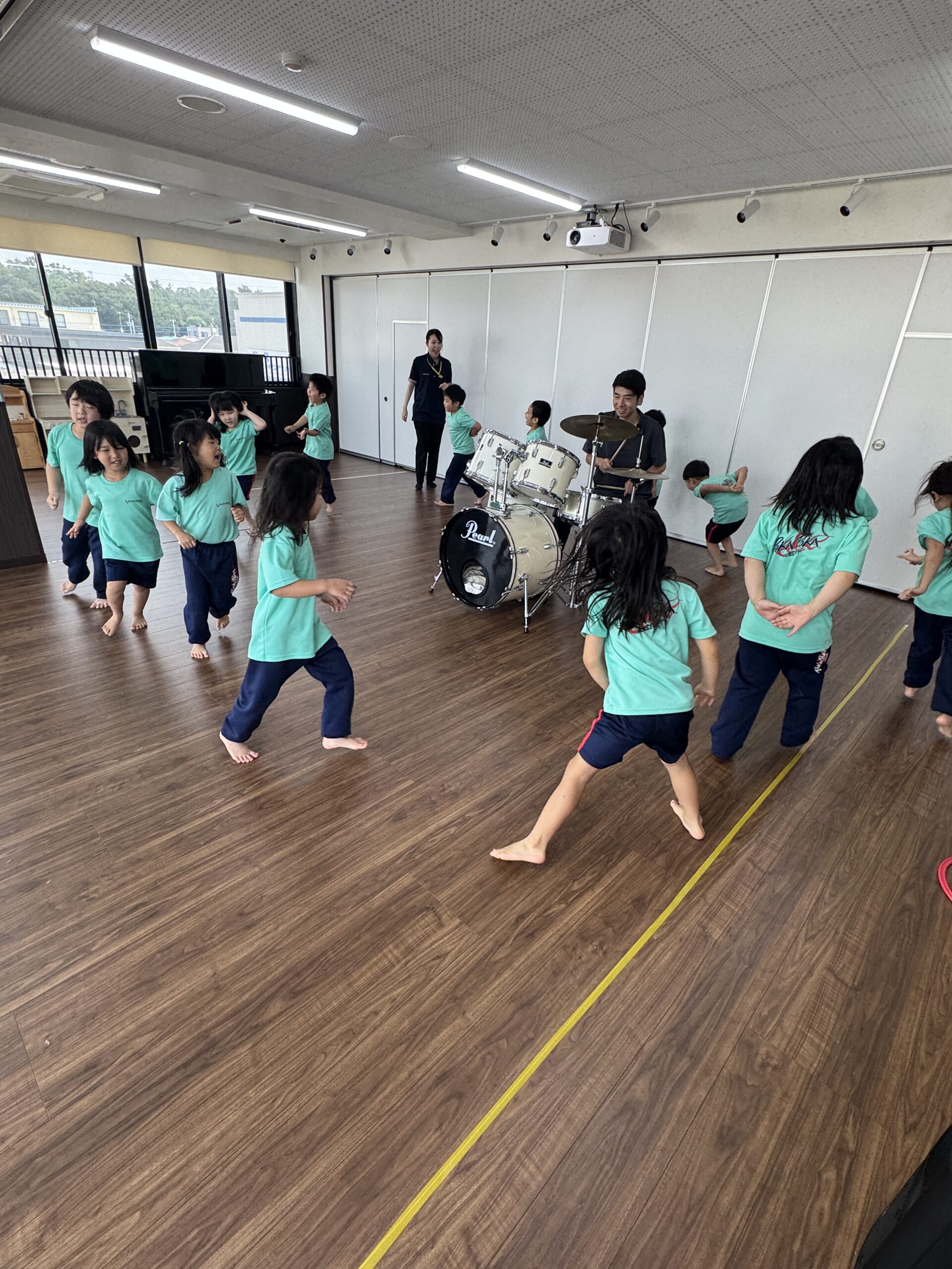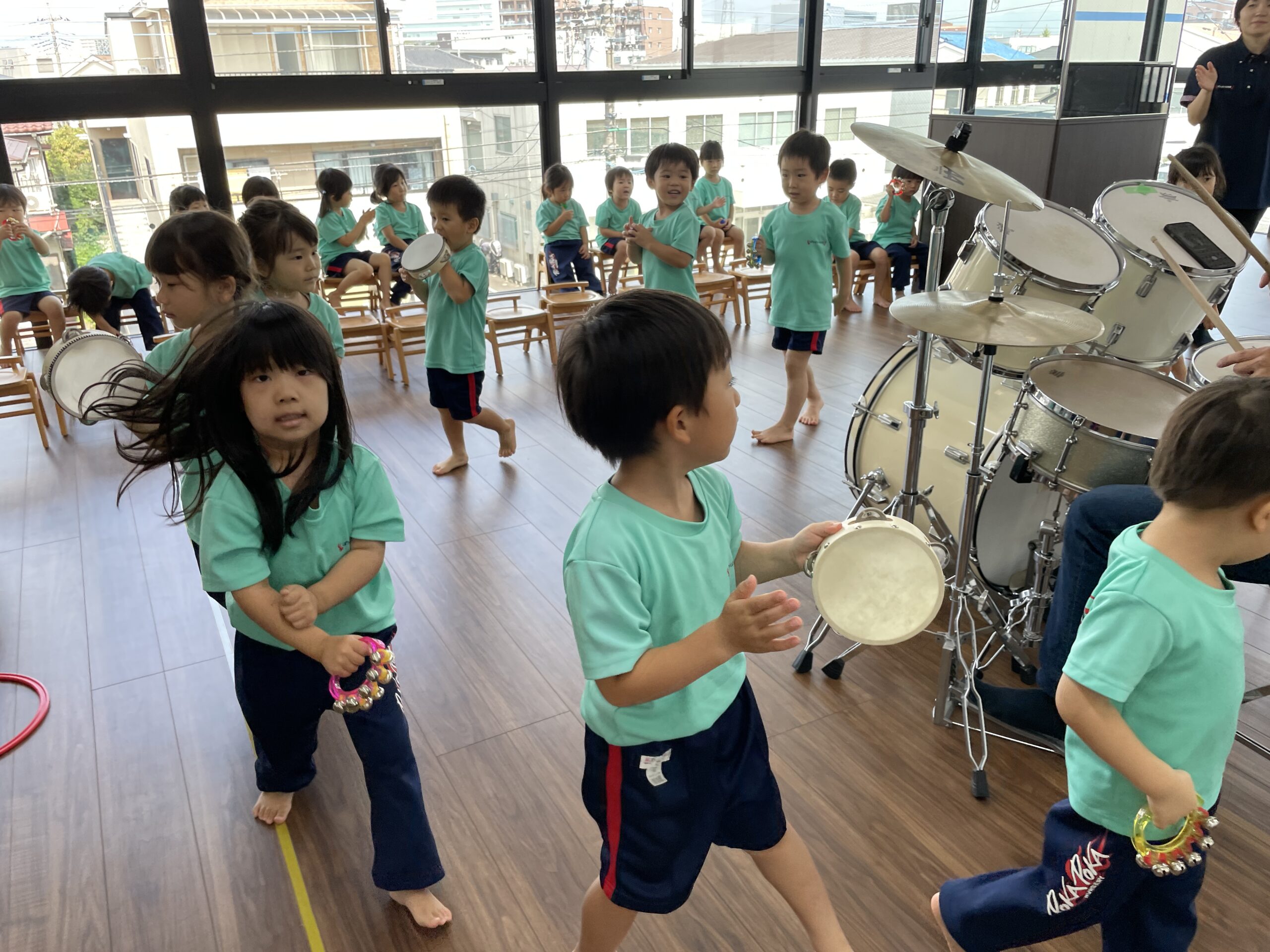 3歳児の「合奏」では、持ち歩けるような小さな楽器を使用しますので、ドラムの周りを行進しながら楽曲に合わせて演奏してもらいました!