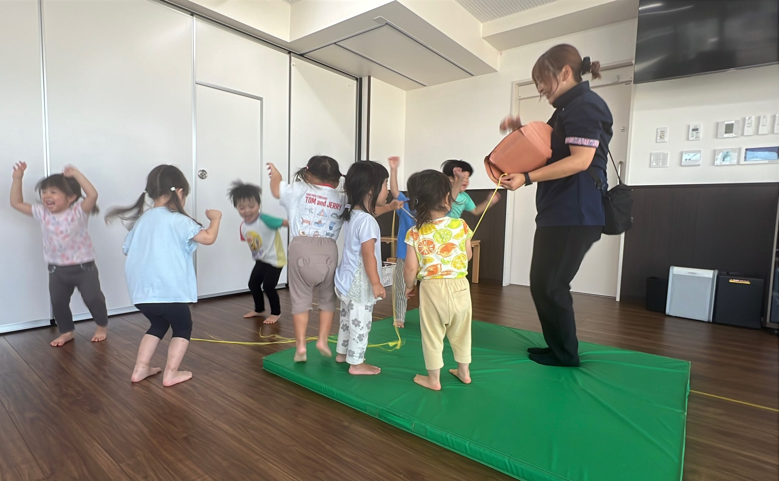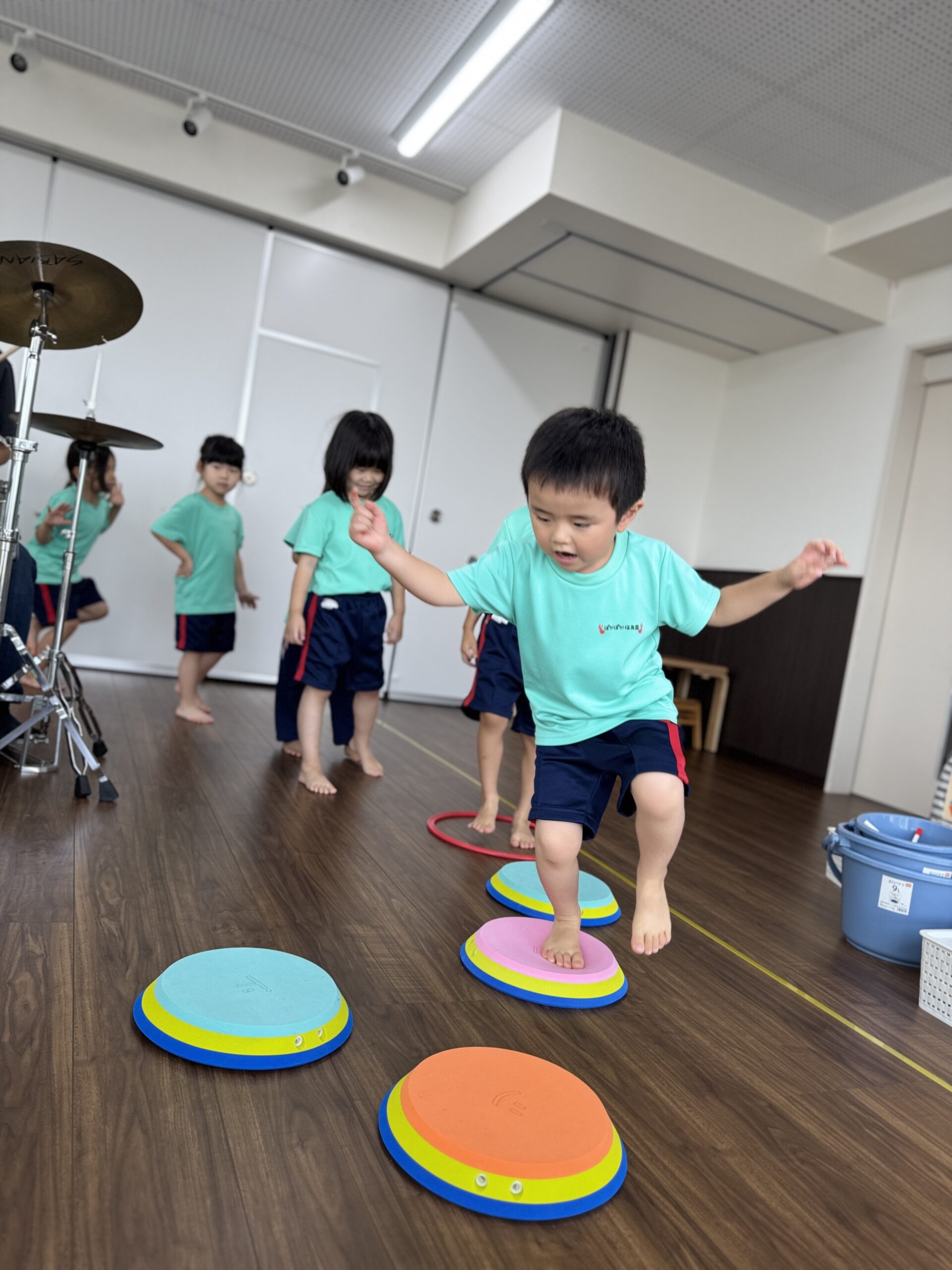 「リズムサーキット」ではドレミマットを使用した「けんけんぱ」のドラムバージョンを実施しました。