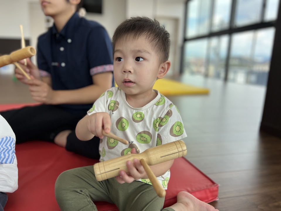 また、リズムスティックのリズムアンサンブルでは、様々なリズムに挑戦!集中力もアップしている5歳児さん。