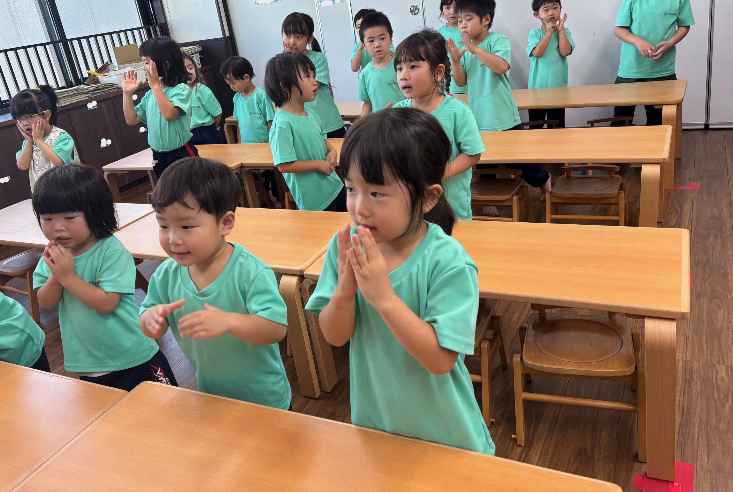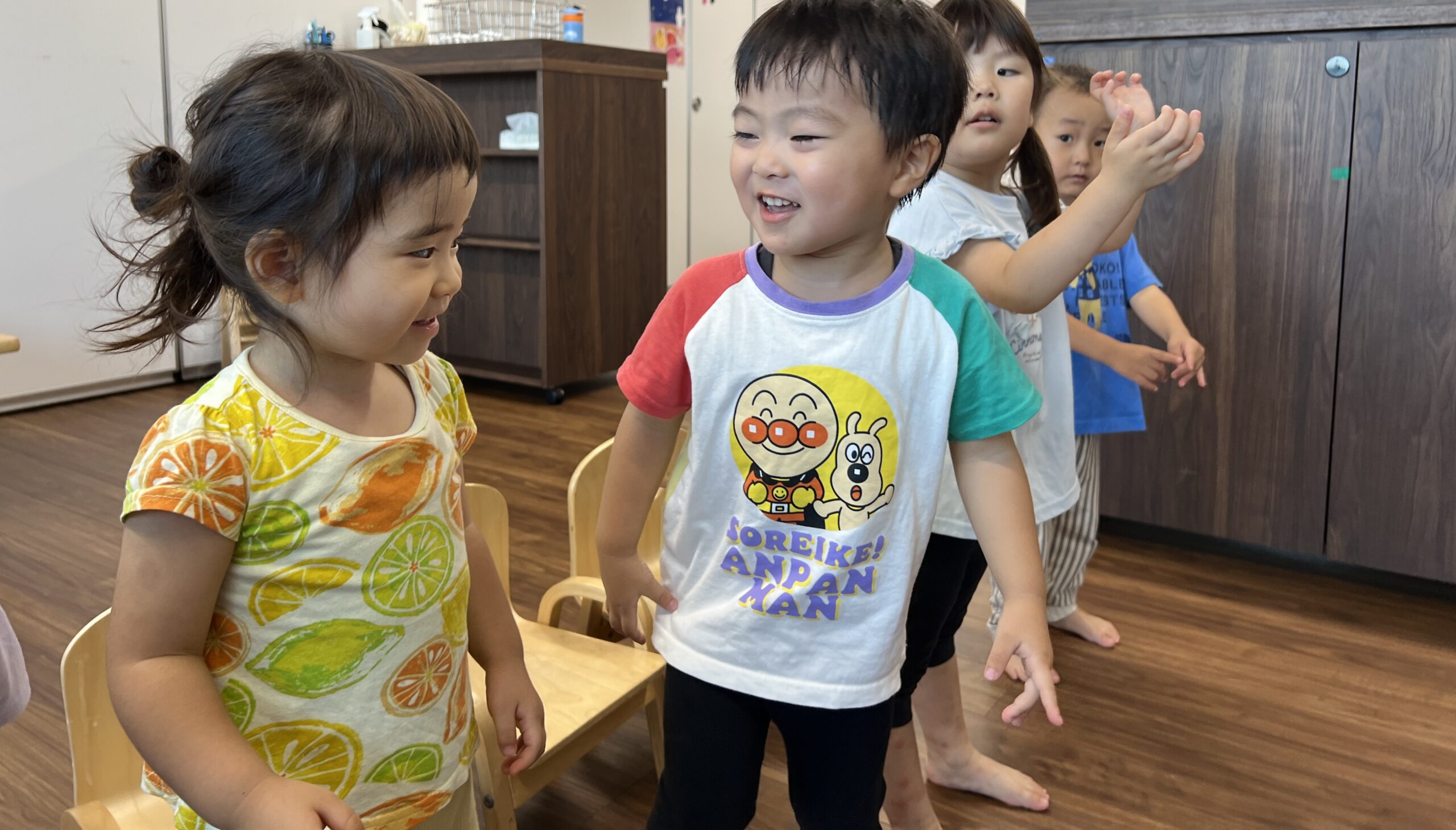 2歳児クラスでは、全身で振付を楽しみ、