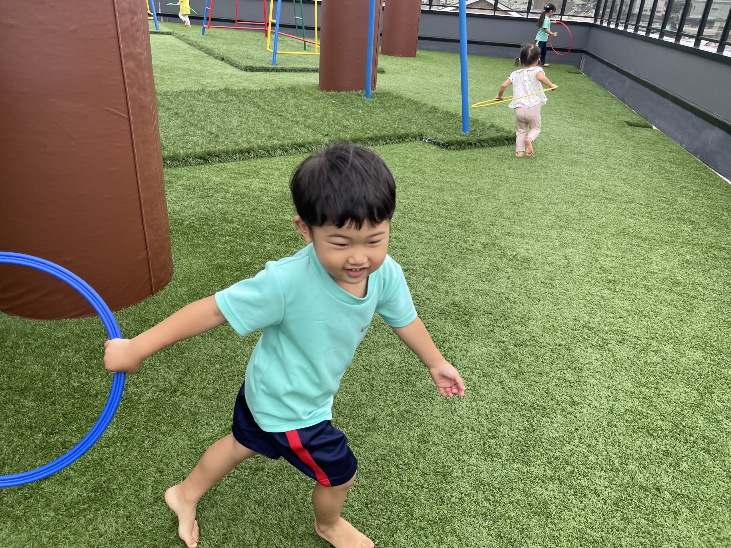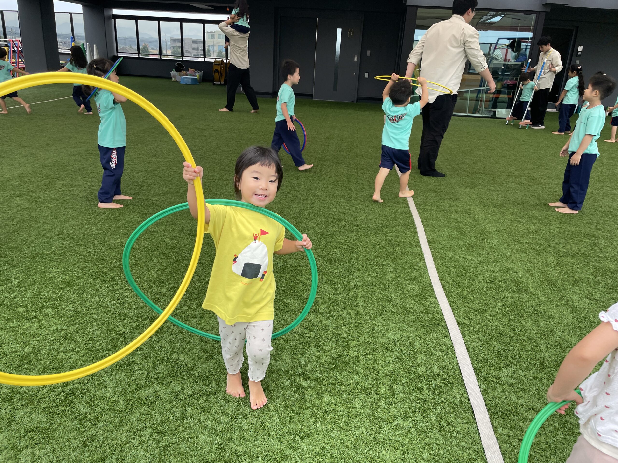 友だち同士でフラフープを持ち合ってくるくる回す姿もあり、