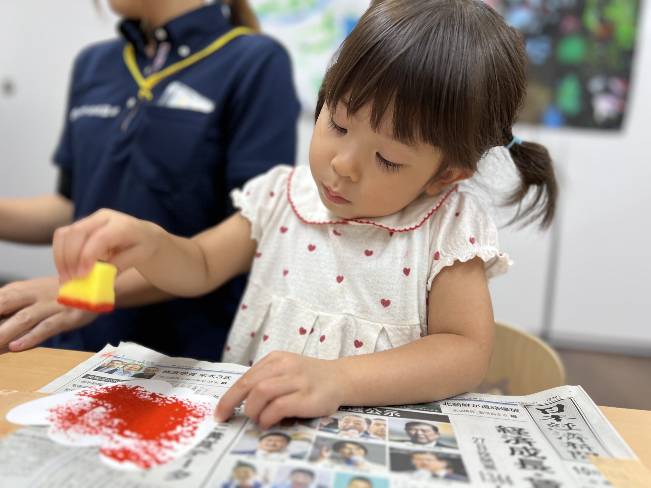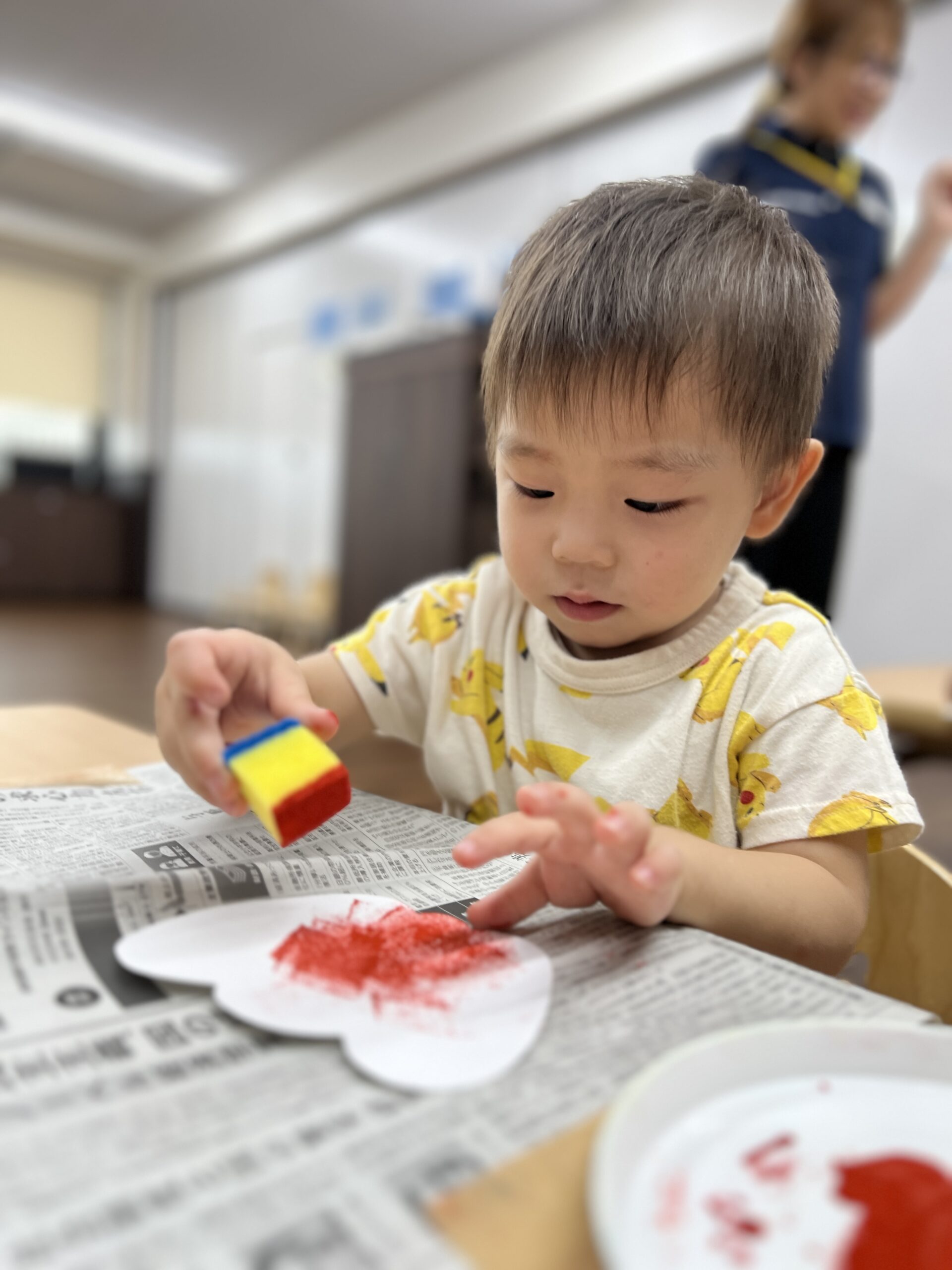 次は制作!ハロウィンにちなんだお野菜をイメージして、スポンジでスタンピングをしました!
