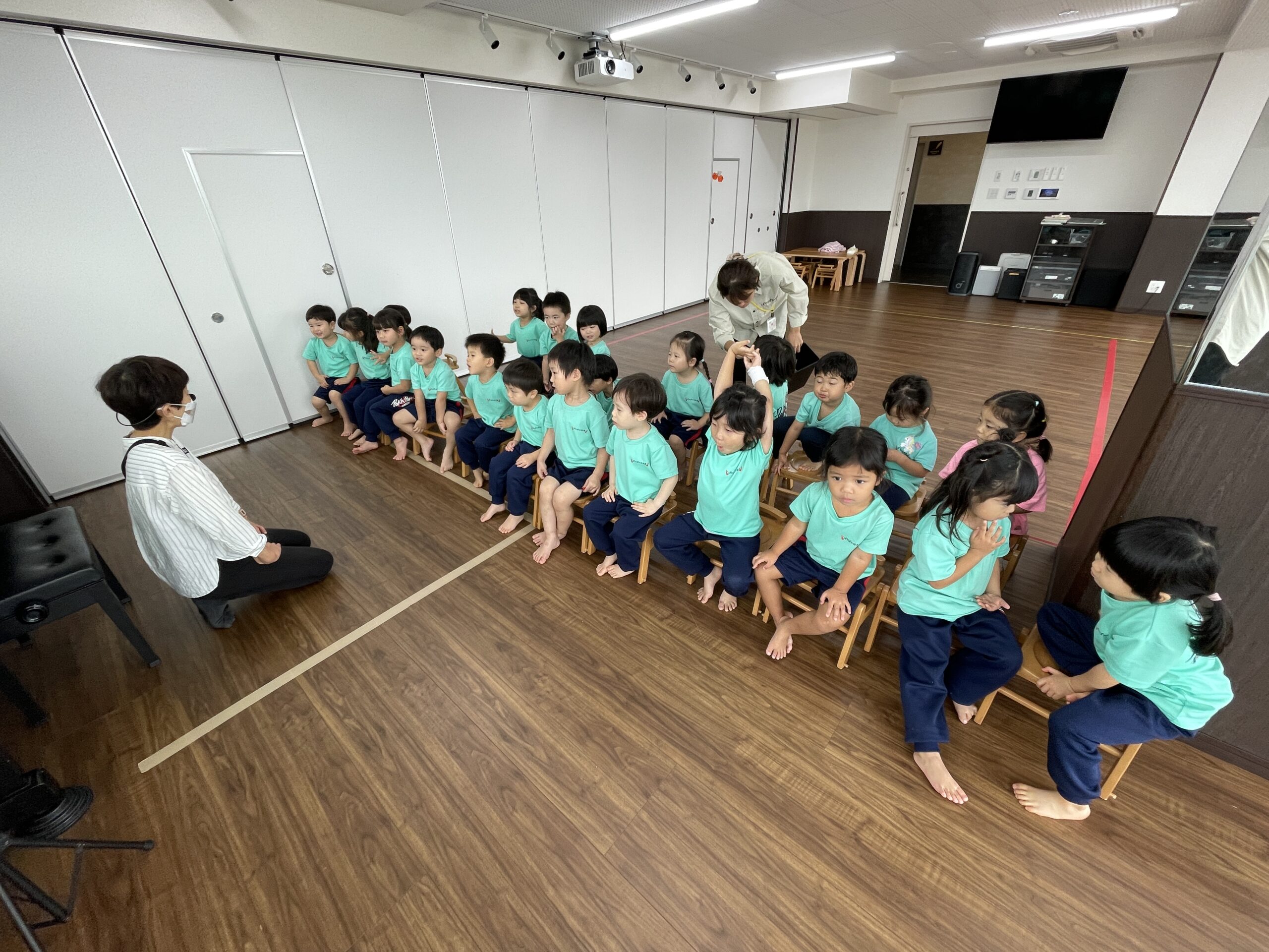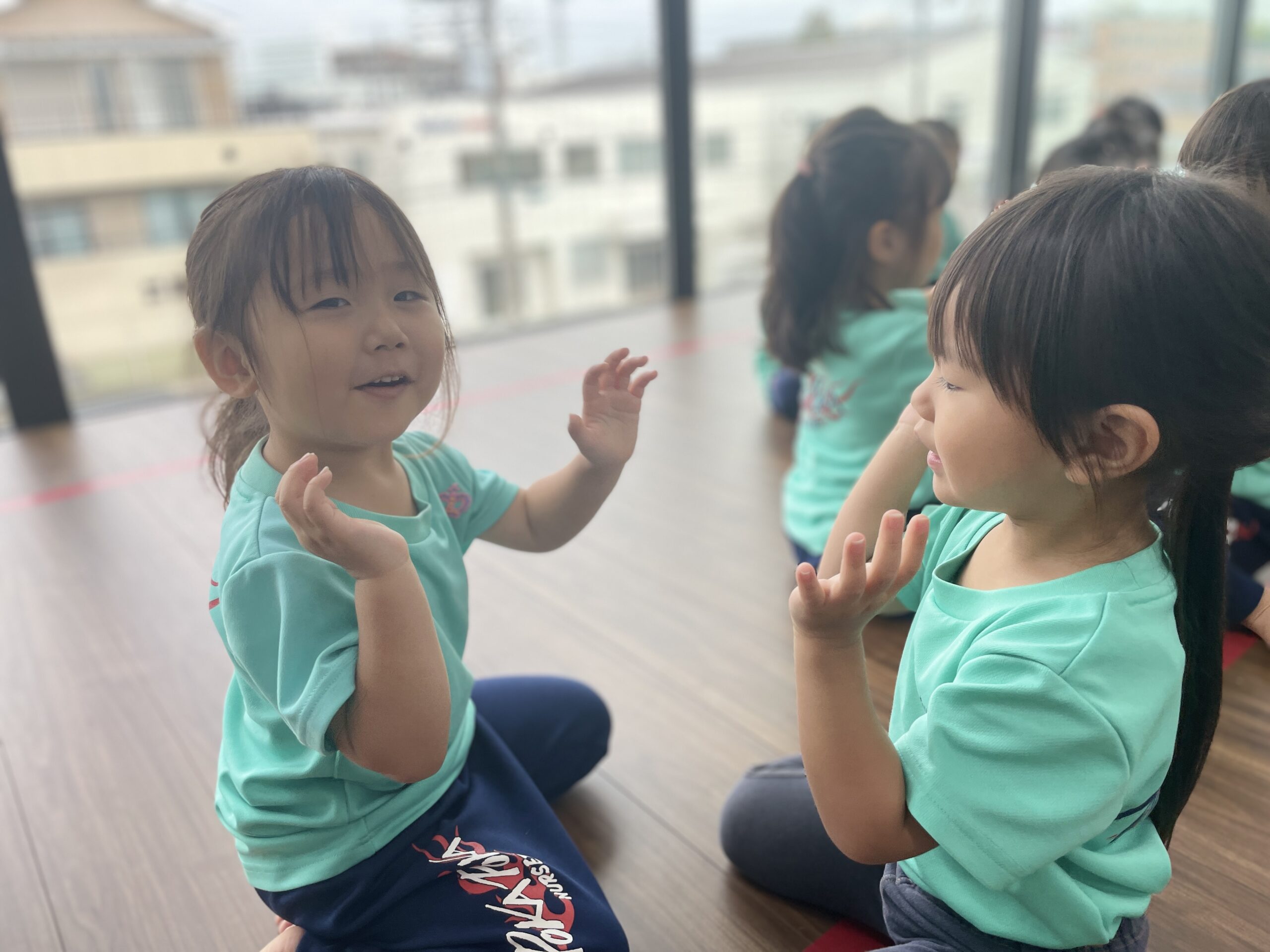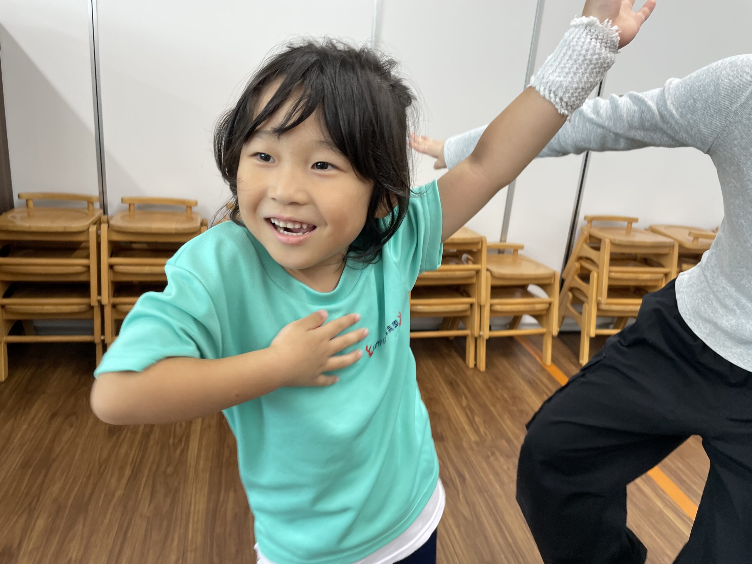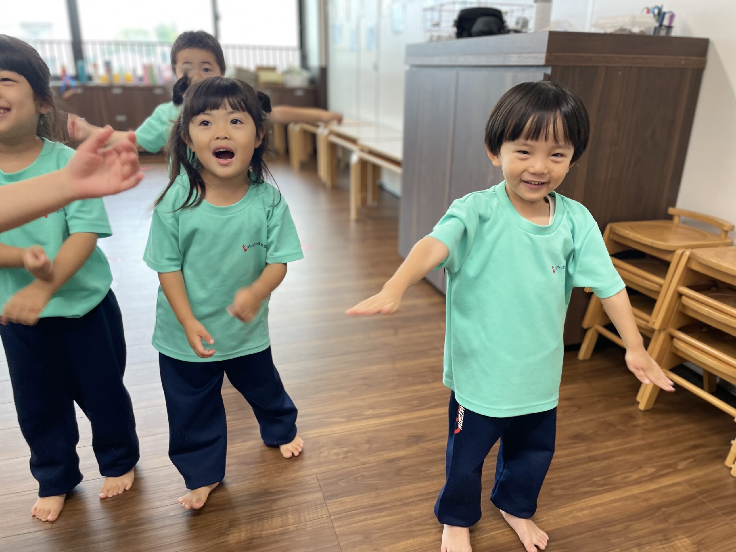 最後はダンスの時間!今日は一日中ハイテンションな三歳児さん。音楽が流れるとすぐに「イェーイ!」と歓声が上がり、あっちでもこっちでも自由にステップを踏む子どもたち。先生が「ちょっとまってー!まだ始まってないよ~!」と言うと、「もうおどりたいんだもん!」とニコニコ顔。元気があふれすぎて少し混乱状態になることもありましたが、ケガもなく無事に最後まで楽しく踊りきることができました。