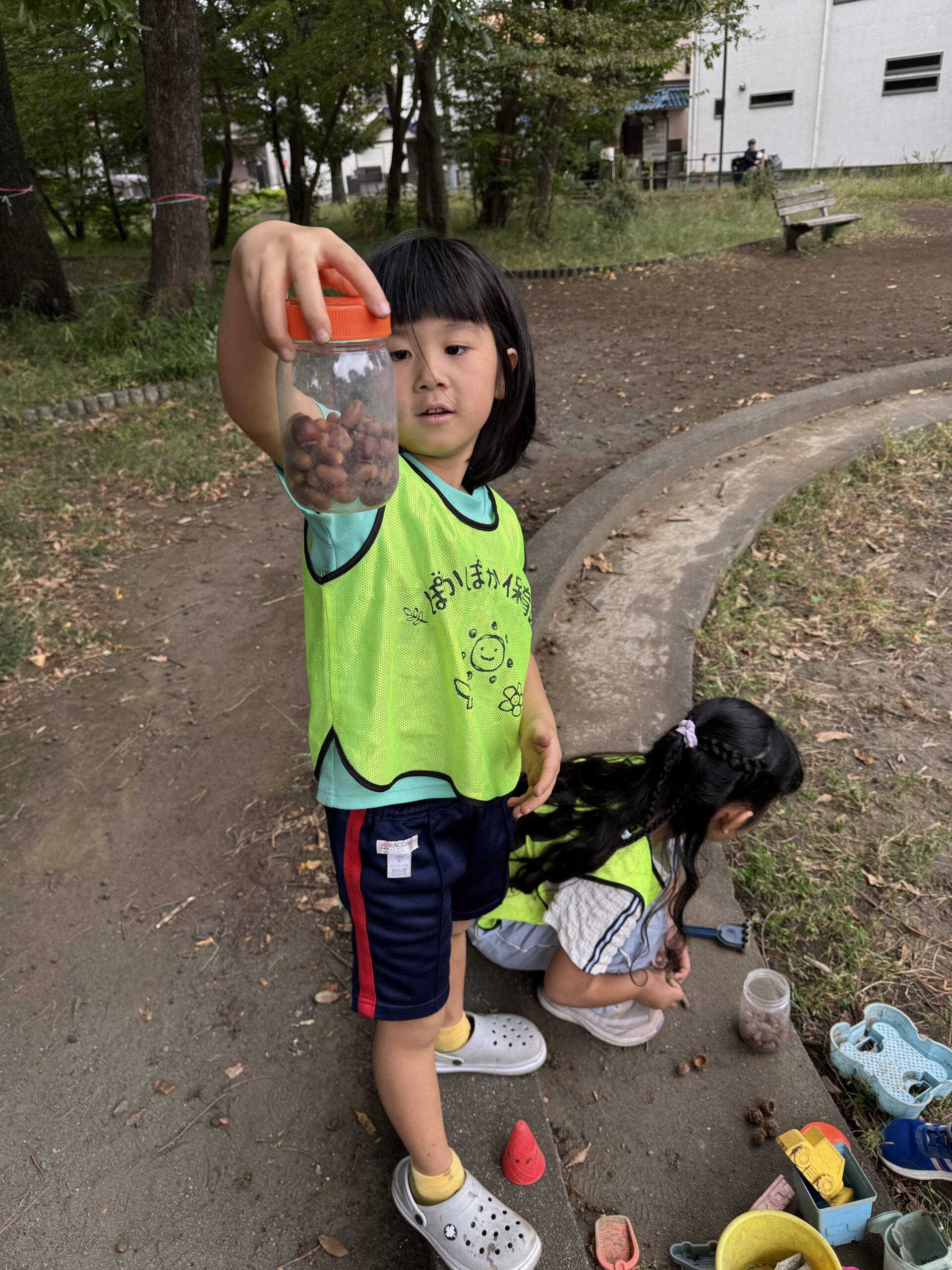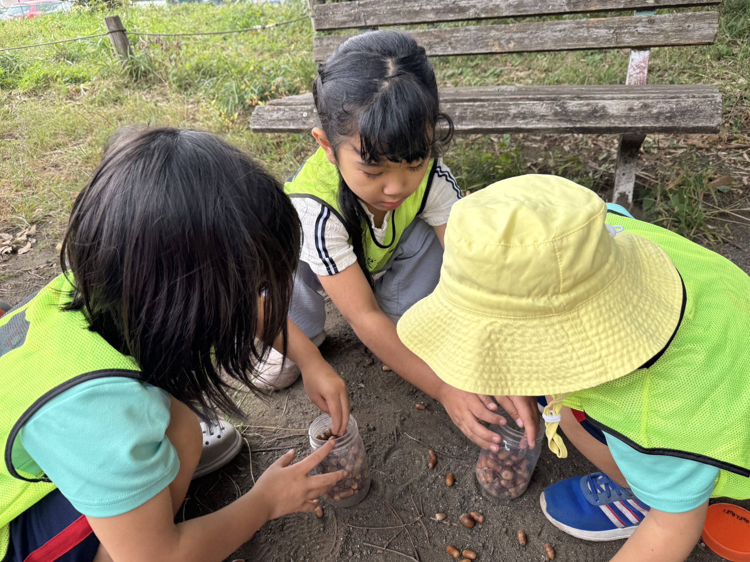 道中ではどんぐりを見つけて「帽子かぶってるね!」と嬉しそうに手に取る子どもたち。