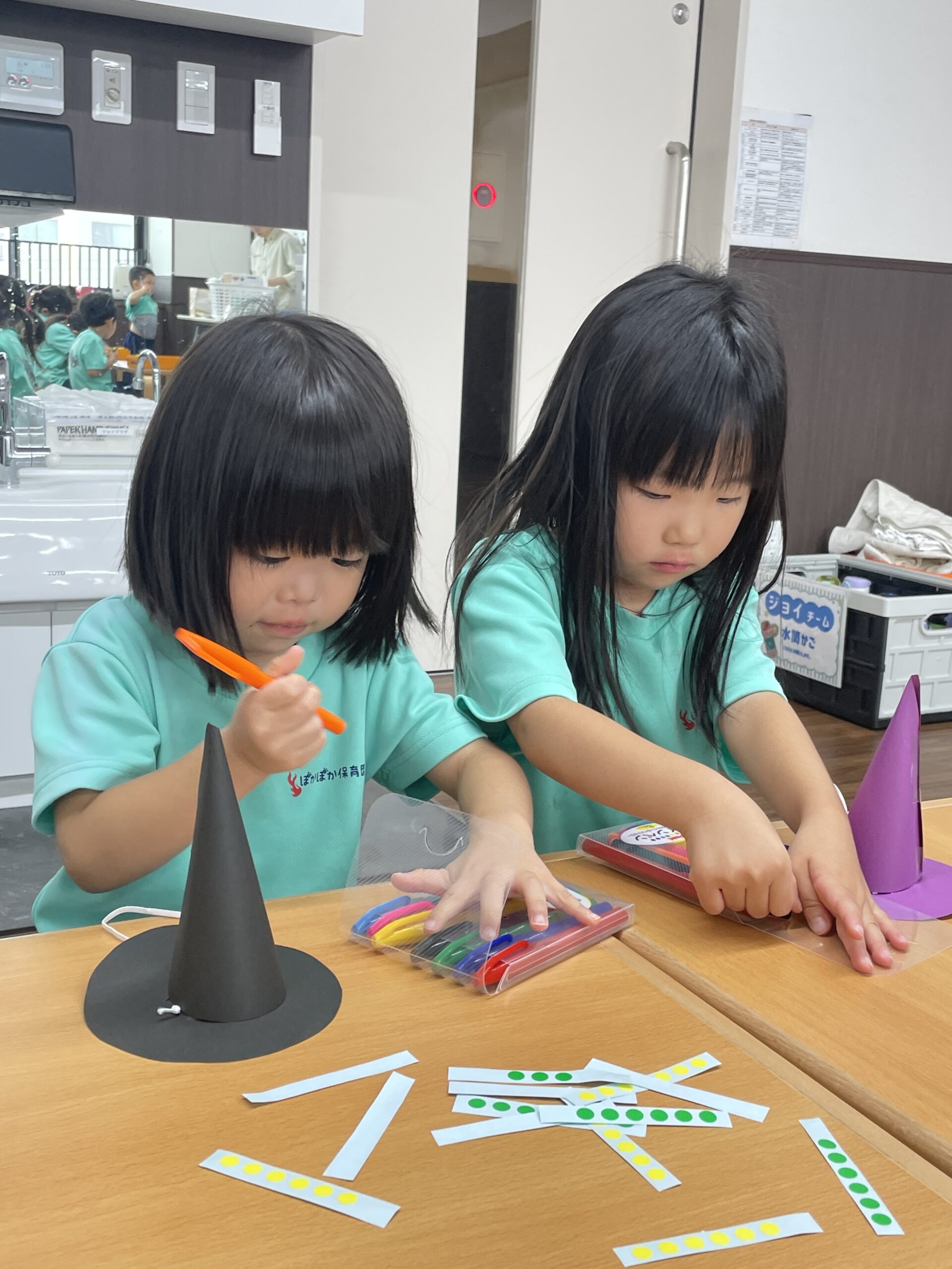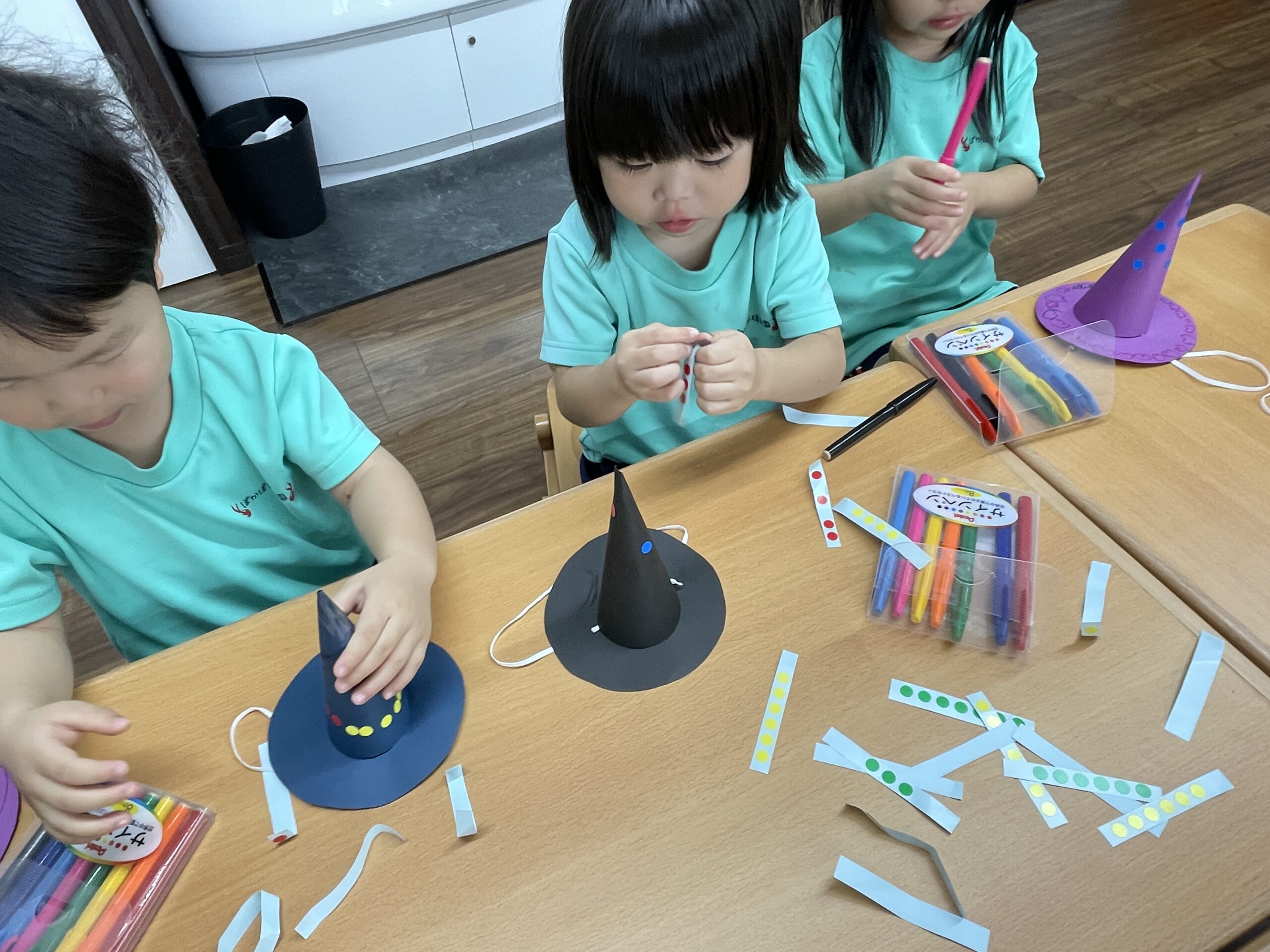 ワークのあとは、明日のハロウィンに向けて帽子の飾りつけ。