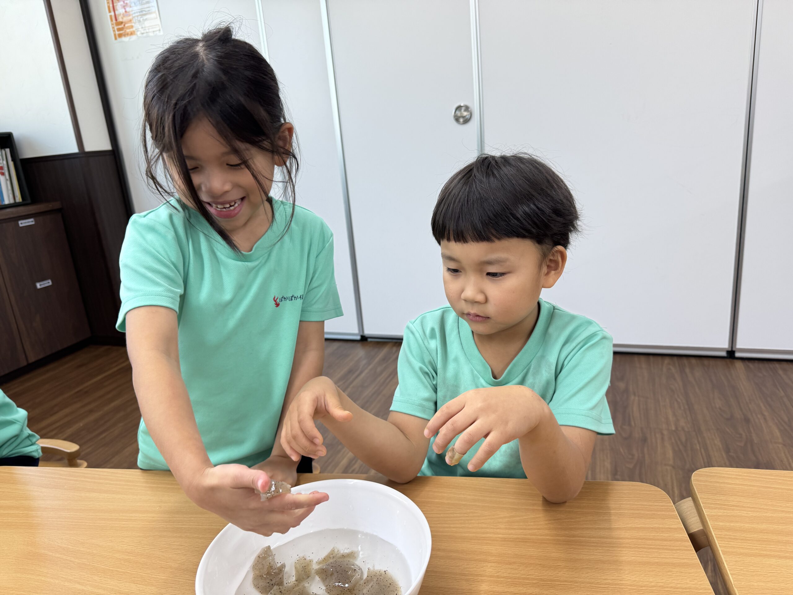潰してみると「べちゃってなった!」と笑いながら観察。