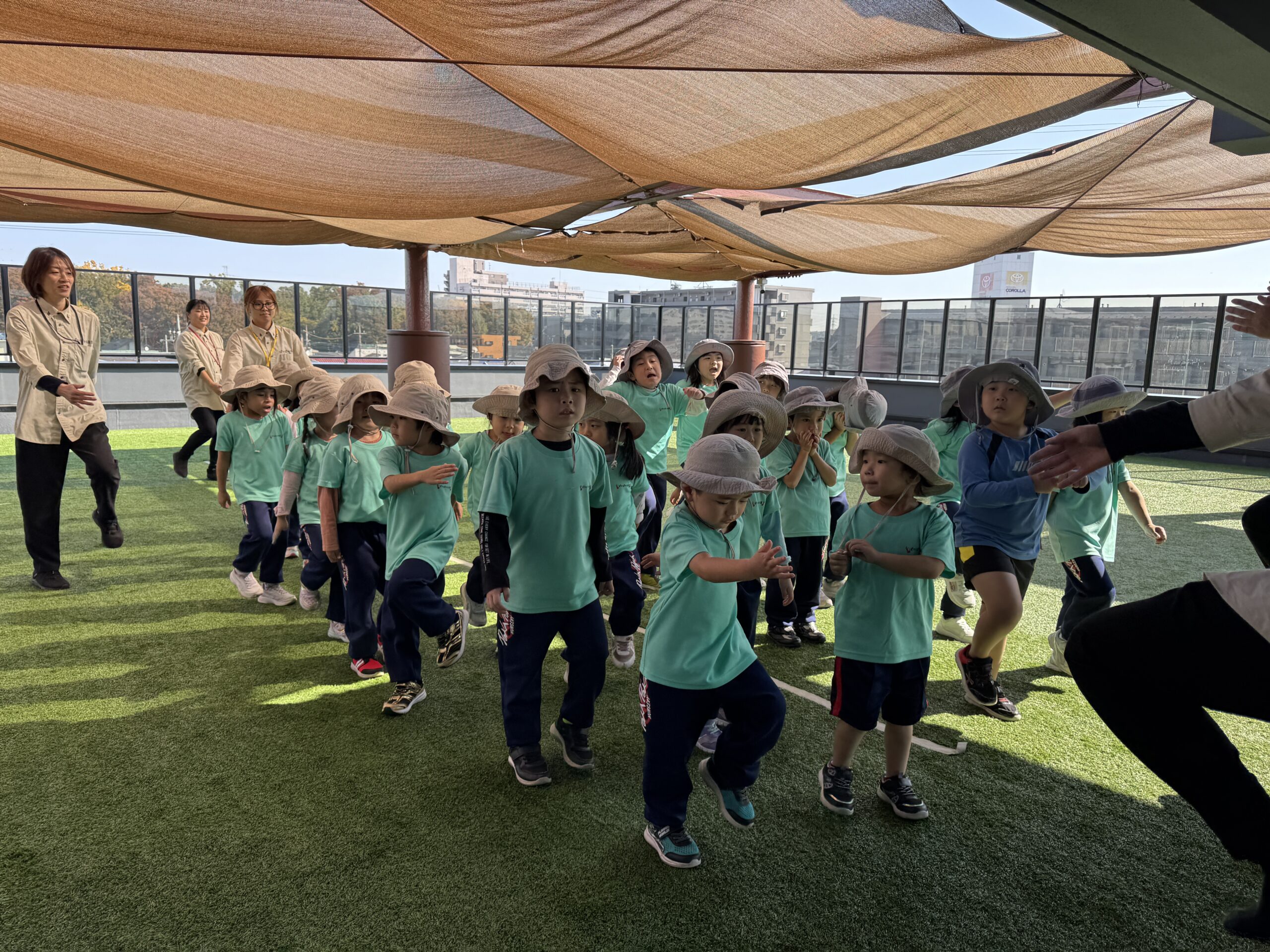 腕を振って行進したり、ジャンプしたり、みんなで息を合わせて体を動かしました。