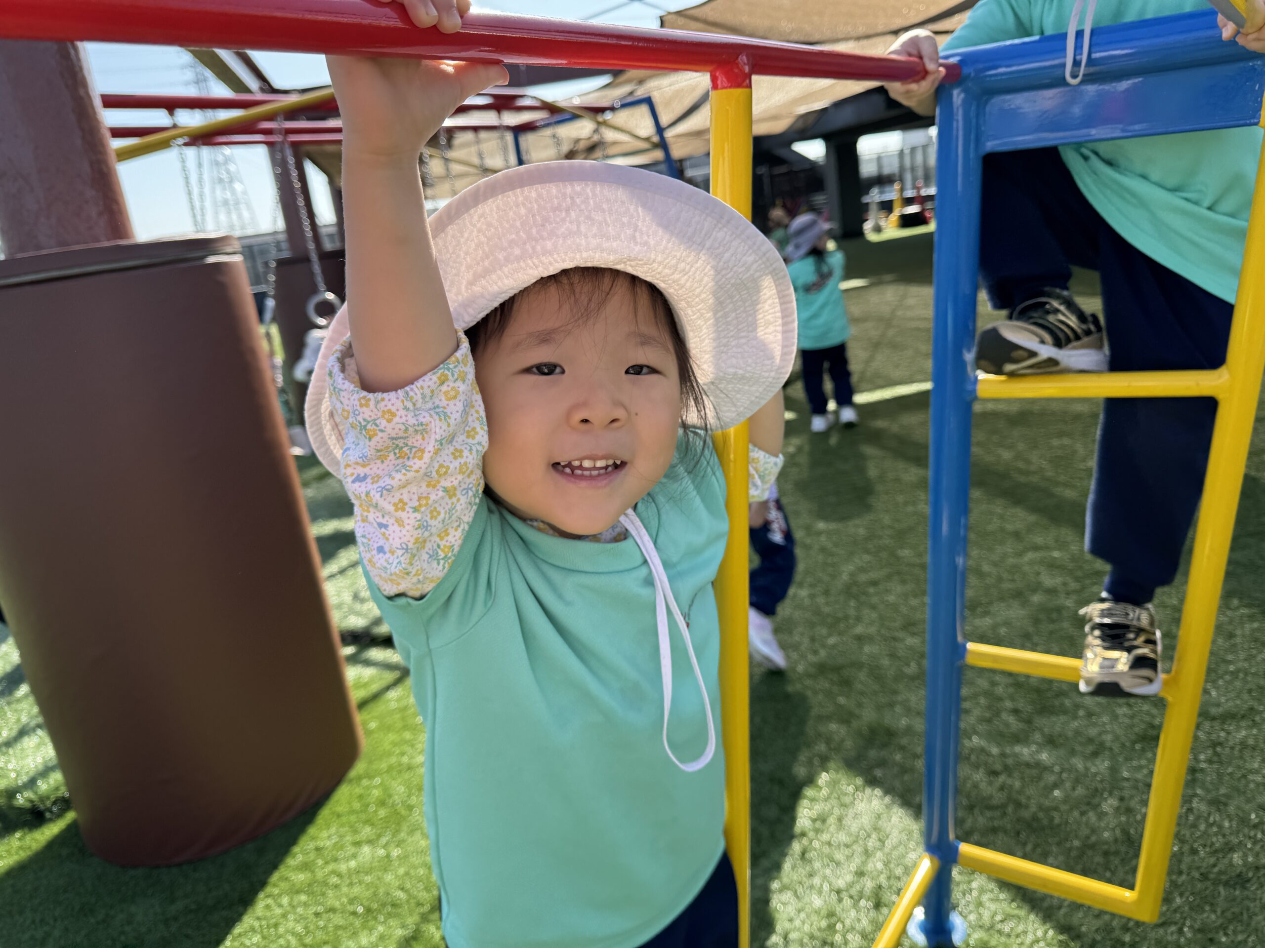 遊具にぶら下がって「みてー!ぼくこんなにぶら下がれる!」と得意げな子、