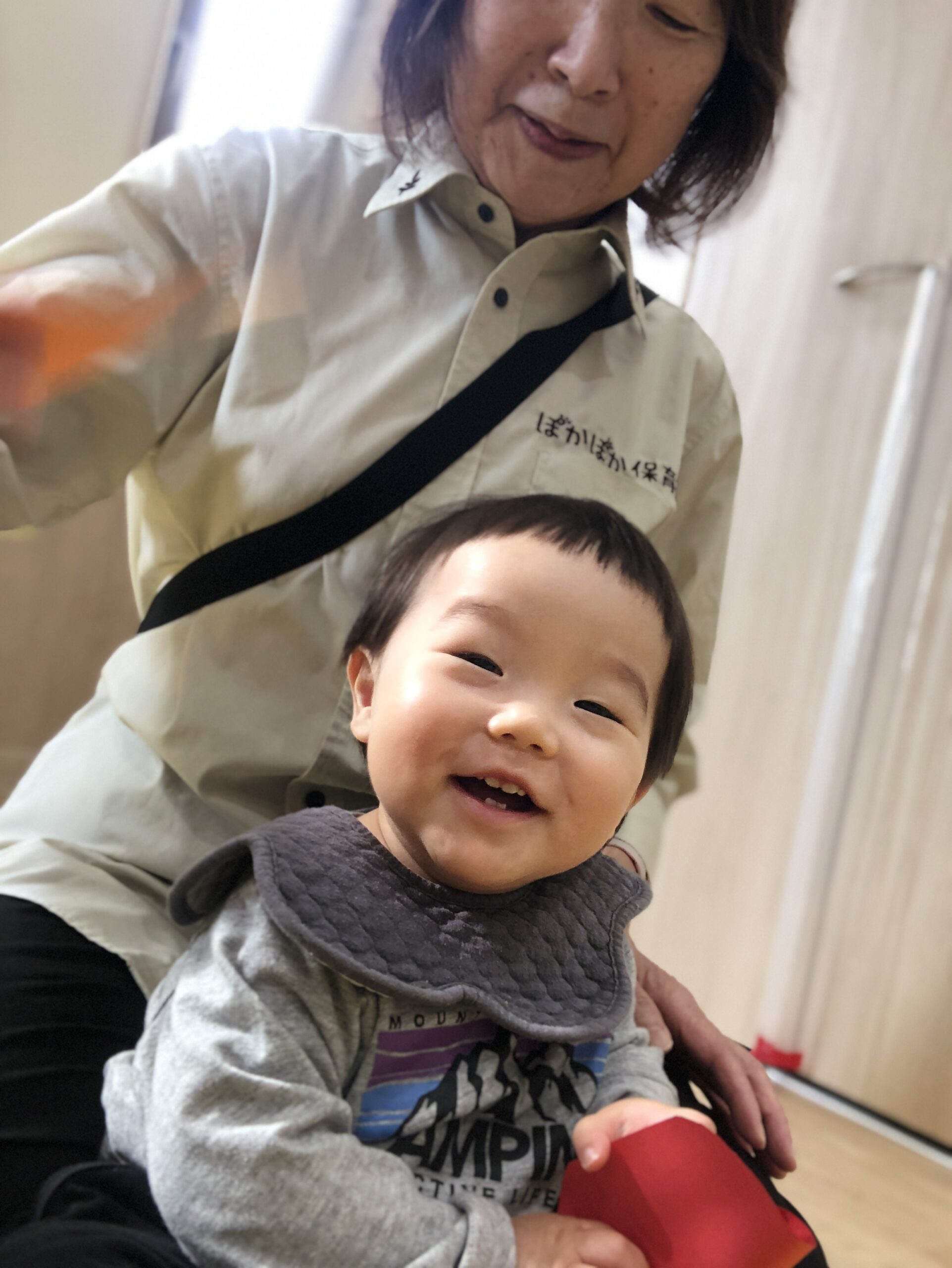0歳児さんも先生に抱っこされながらリズムに合わせて体を揺らし、「ポンポン♪」と先生が手拍子をすると、まねして小さく手を動かしていました。
