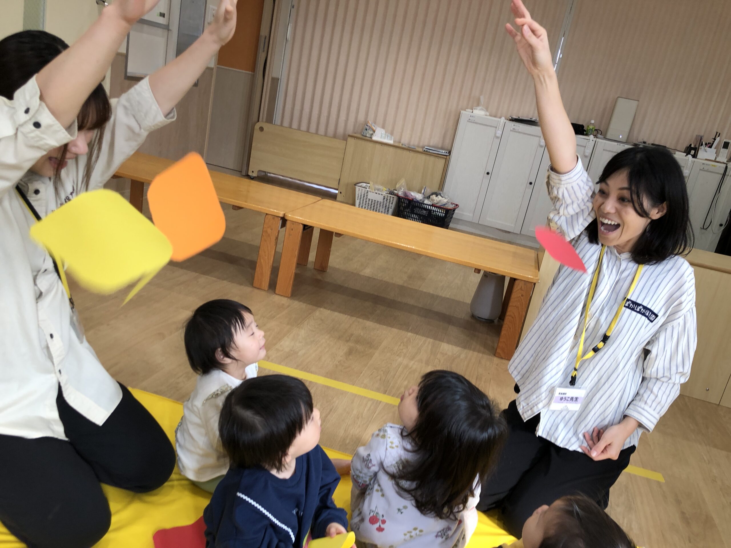 今日は0歳児の青空組さんと1歳児の虹組さん、みんなで音楽遊びからスタートしました。
