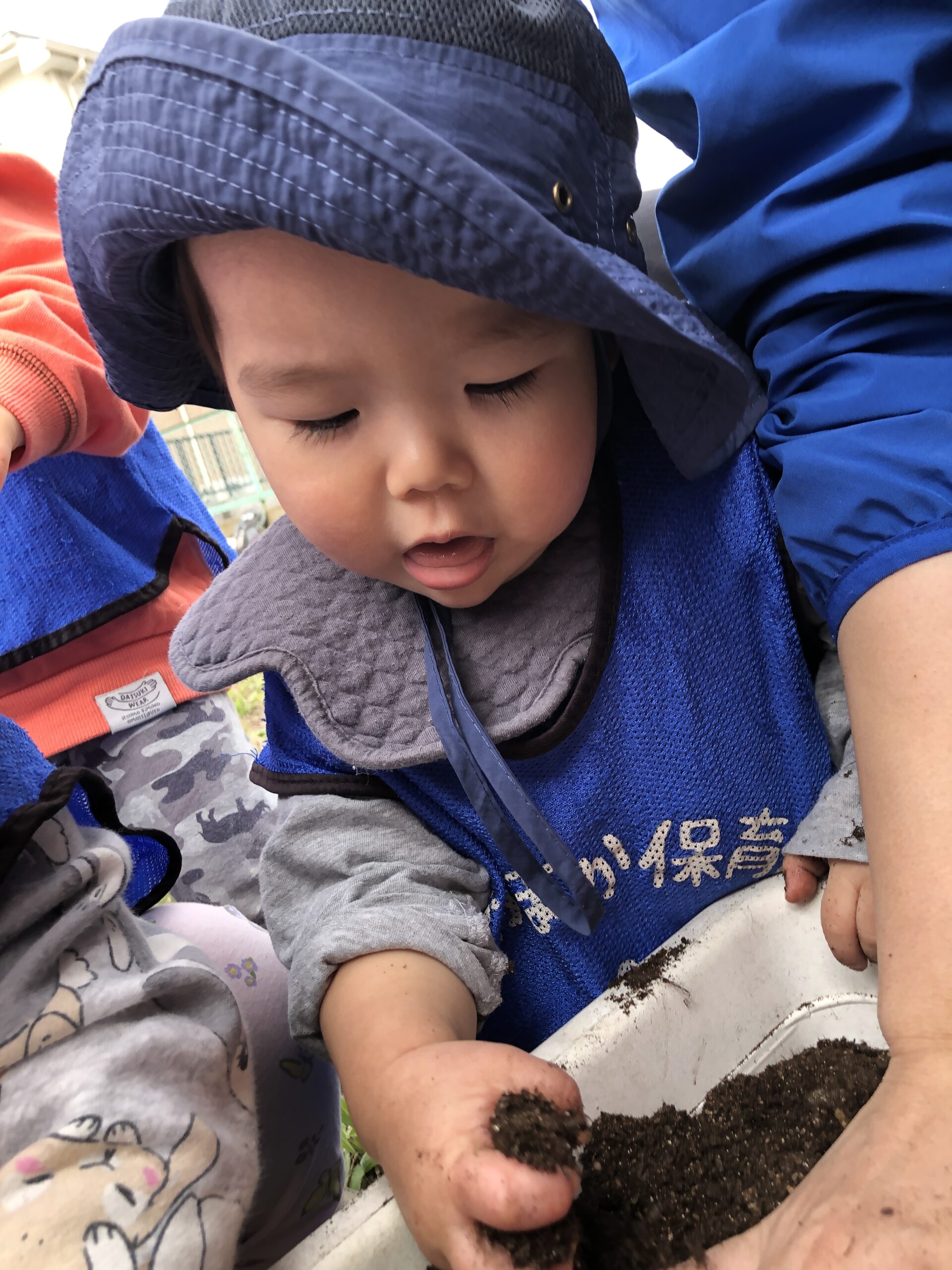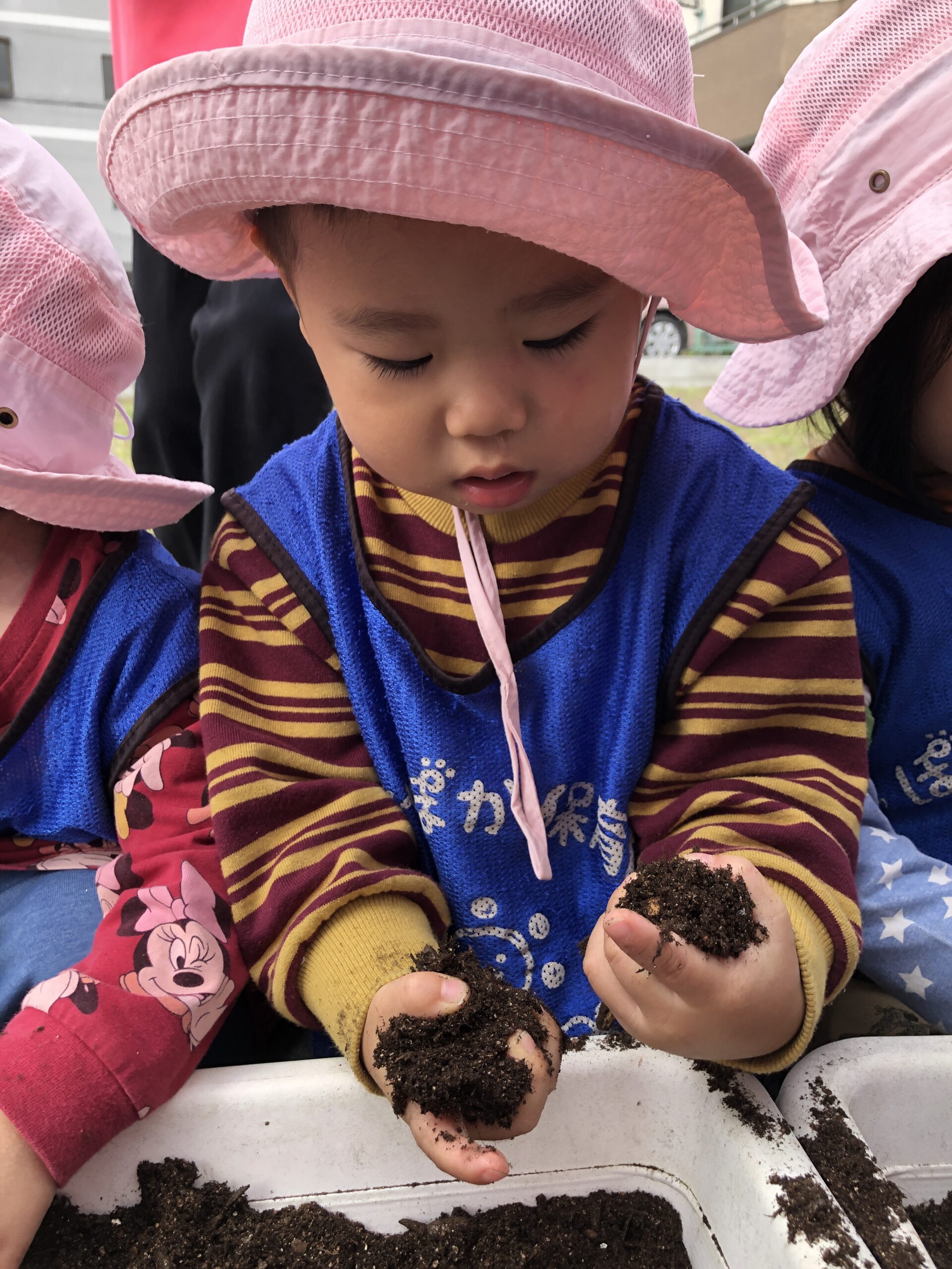 小さな手で土をそっと触りながら、指先で一粒ずつ大事そうに植えていきました。