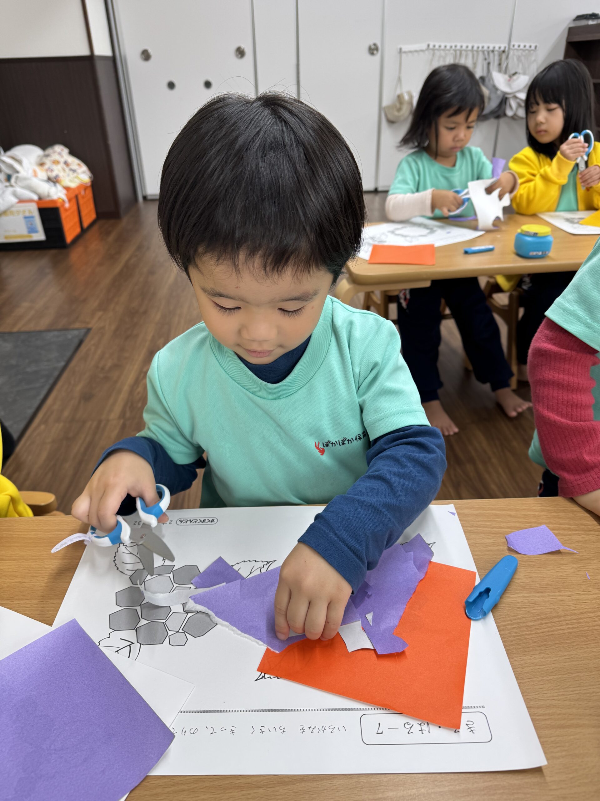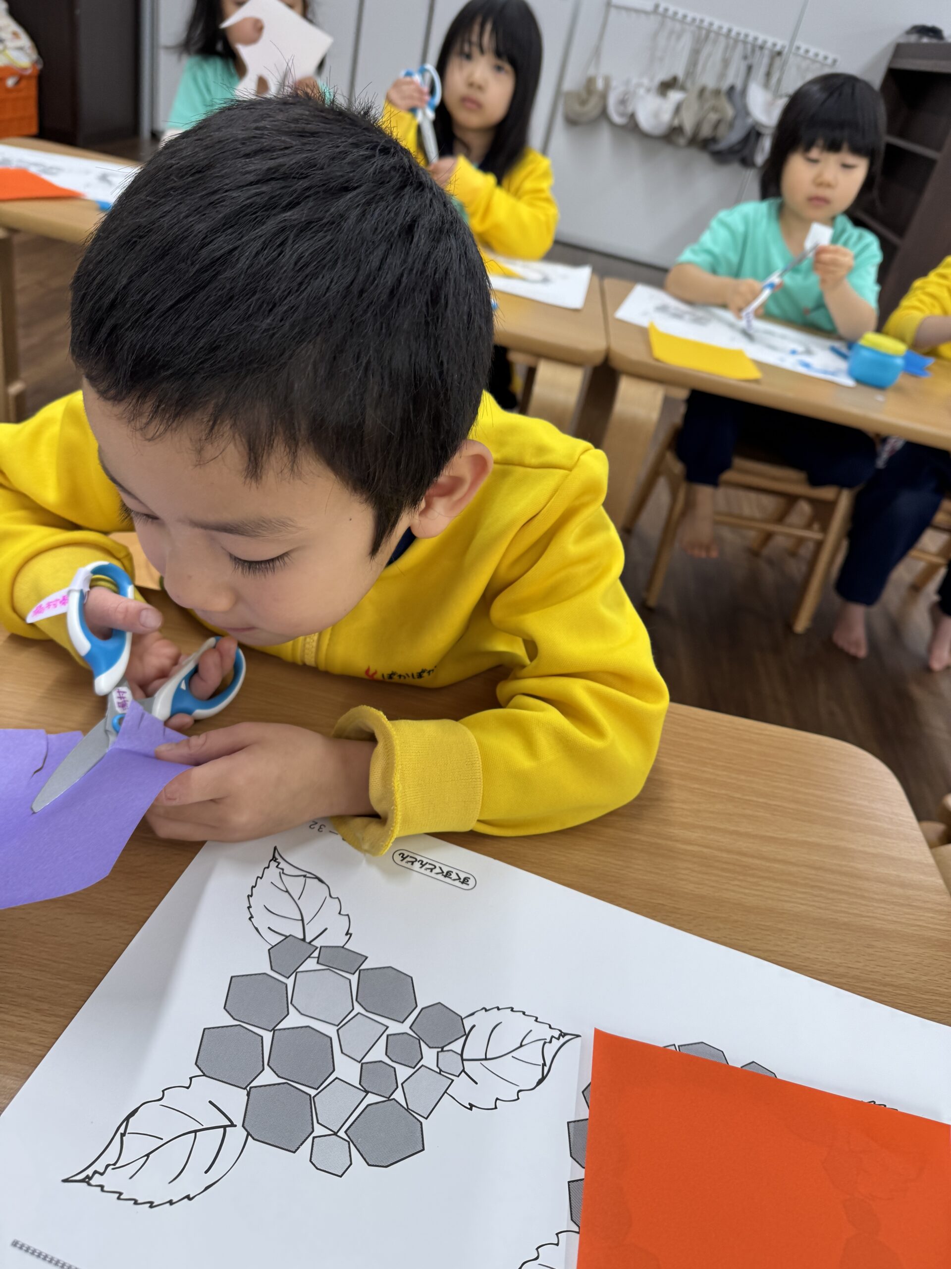 ハサミやのりの扱いにもずいぶん慣れ、アジサイづくりでは一枚一枚丁寧に紙を貼りながら「お花ができたよ!」と嬉しそうに見せてくれる姿もありました。