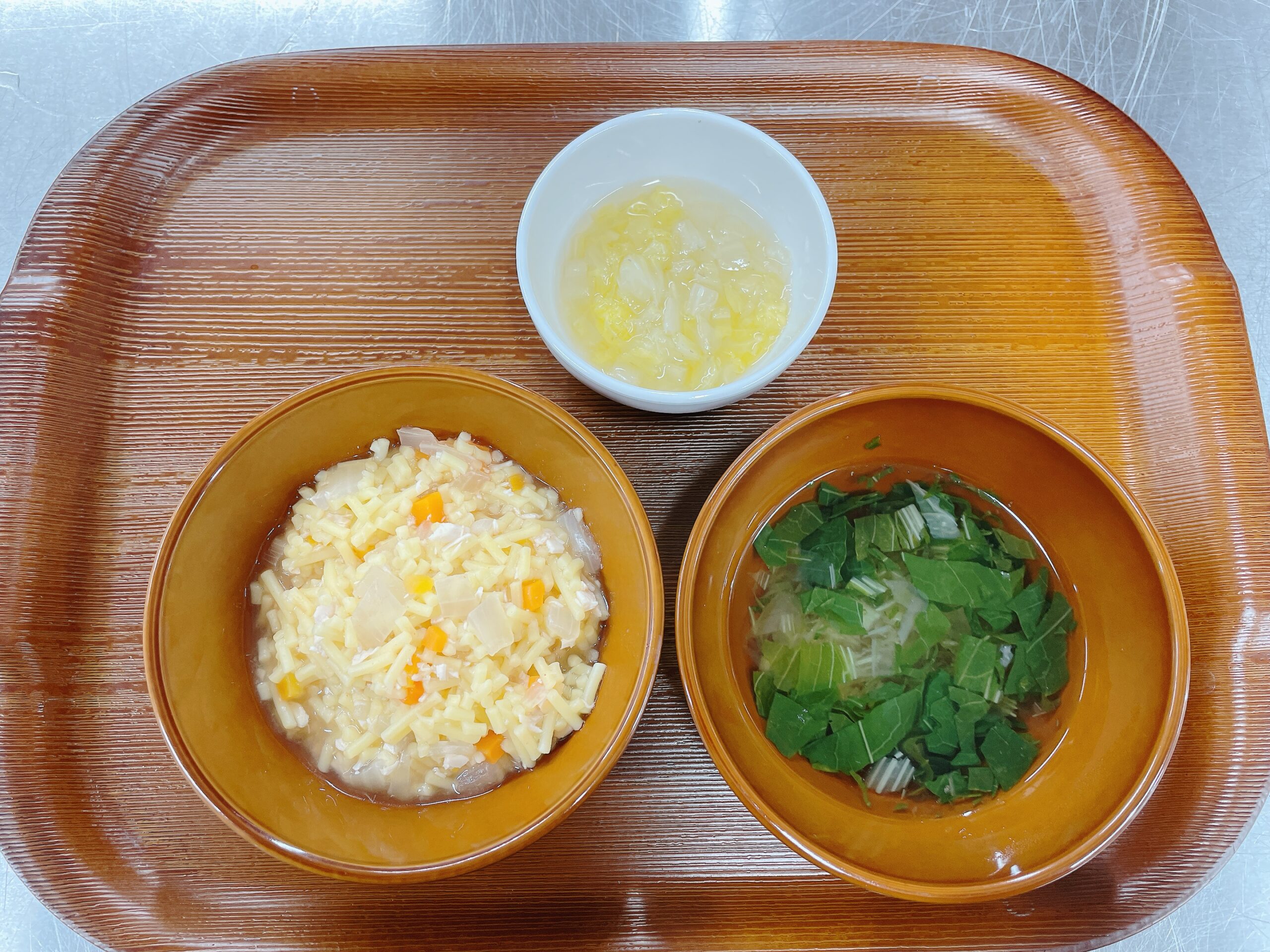 ・フレンチサラダ:白菜と小松菜と人参を薄くスライスし、油とお酢とてんさい糖ベースにしたあっさりドレッシングで和えました。彩りと食感を楽しむ一皿です。