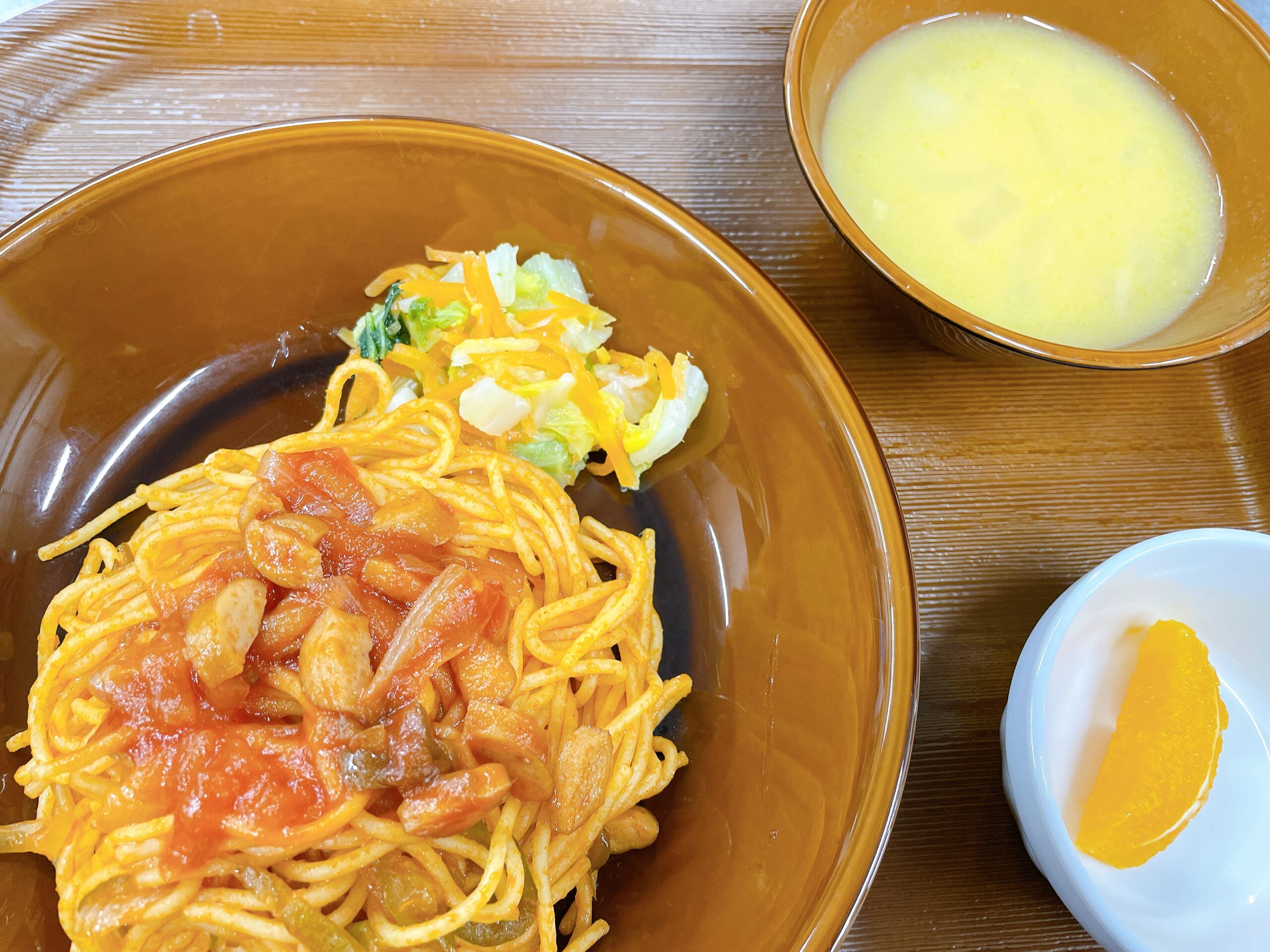 【メニュー名】ナポリタン、コーンスープ、フレンチサラダ、オレンジ
