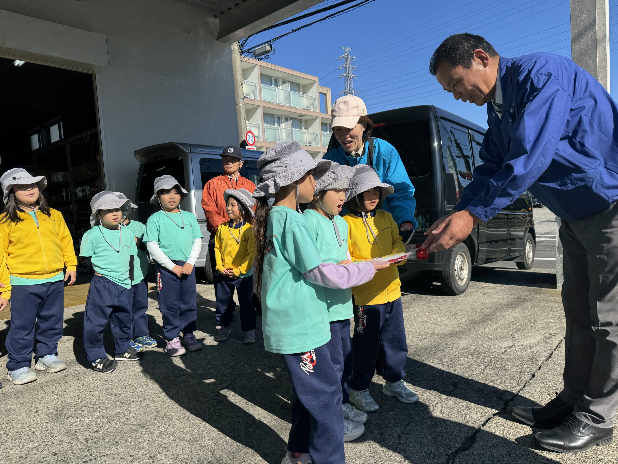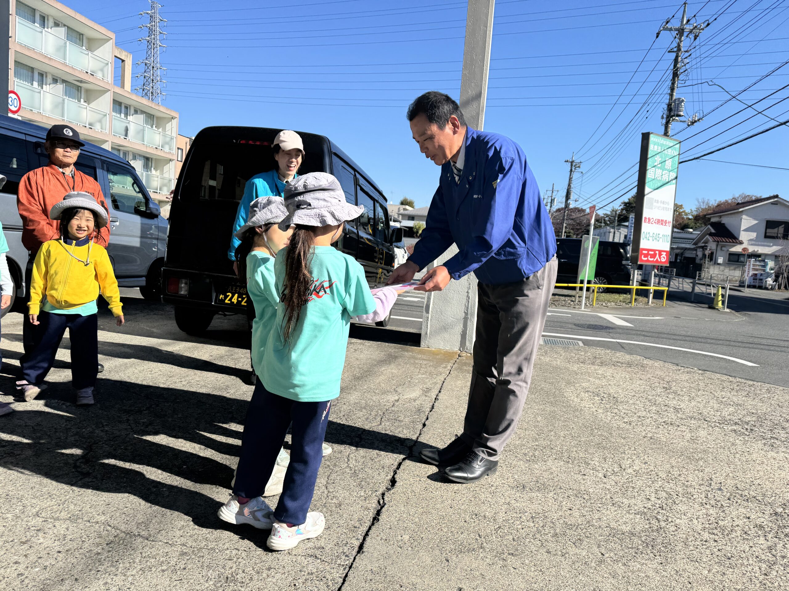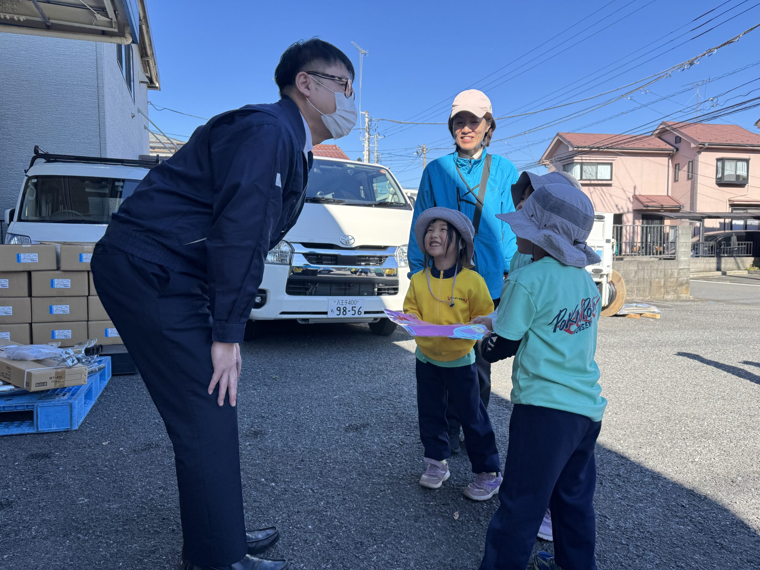 今日は勤労感謝の日に向けて、ぽかぽか保育園の代表として、年長さんが園外へ「ありがとう」を伝えに回りました。